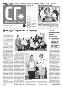 16+ Еженедельная газета Северного района. Основана 20 июля 1935 года ГАЗЕТА ПРОДАЁТСЯ ВО ВСЕХ ПОЧТОВЫХ ОТДЕЛЕНИЯХ РАЙОНА! ВСЕ НОВОСТИ НОВОСИБИРСКОЙ ОБЛАСТИ НА САЙТЕ VN.RU 14 сентября 2022 г. Среда, №37 (8978) Северная газета 15 сентября Ночью: +4. Днем: +15. Переменная облачность. Ветер западный, 1 м/с. 16 сентября Ночью: +4. Днем: +15. Переменная облачность. Ветер западный, 2 м/с. 17 сентября Ночью: +5. Днем: +16. Ясно. Ветер южный, 3 м/с. 18 сентября Ночью: +4. Днем: +16. Ясно. Ветер юго- западный, 4 м/с. 19 сентября Ночью: +6. Днем: +19. Ясно. Ветер юго-западный, 2 м/с. 20 сентября Ночью: +6. Днем: +15. Переменная облачность. Ветер юго-западный, 12 м/с. 21 сентября Ночью: +9. Днем: +19. Ясно. Ветер южный 7 м/с ПОГОДА Участниками патриотической акции «Единой России» — «Диктант Победы» стали более 17 тысяч новосибирцев. 3 сентября было организовано около 350 площадок для его написания. В Северном площадкой Всероссийской акции стала Северная средняя школа. Подробности — на стр. 4 ДАТА Незабываемый подвиг Ленинграда JВ Новосибирской области 8 сентября, в День памяти и скорби жертв блокады Ленинграда, прошла гражданская акция. Ровно 81 год назад 8 сентября началась самая страшная в истории человечества блокада мирного города. У Стелы, посвященной воинскому и трудовому подвигу ленинградцев, собрались ветераны, жители региона, представители органов власти, общественных организаций — после минуты молчания они возложили цветы к Стеле. В мероприятии приняла участие заместитель министра региональной политики Новосибирской области Светлана Шибаева. «Мужество и стойкость жителей города, их любовь к своей Родине потрясли мир, они являются примером для современного молодого поколения, для тех, кто сегодня борется за мирное небо», — отметила Светлана Шибаева в своем приветственном слове к участникам акции. Замминистра отметила, что тысячи новосибирцев сражались за освобождение Ленинграда. В Новосибирск за первые годы войны прибыло более 128 тысяч ленинградцев, были эвакуированы целые предприятия, с оборудованием, станками, техникой. Многие ленинградцы обрели в Новосибирске вторую родину. Новосибирск дал приют нескольким десяткам детских домов и ремесленных училищ Ленинграда, творческим и научным коллективам. В послевоенные годы они внесли огромный вклад в развитие Новосибирска как промышленного, научного и культурного центра Сибири. Пресс-служба губернатора и правительства НСО Дом, где согреваются сердца Раиса АКИЛИНА Отделение дневного пребывания пожилых людей Комплексного центра социального обслуживания населения работает уже не первый год. И со временем набирает популярность. Причем не только среди жителей райцентра, но и среди тех, кто живет за десятки километров от Северного. 8 сентября в холле второго этажа Центра собрались те, кто сегодня посещает группы дневного пребывания, и проживающие в специальном Доме для пожилых и одиноких граждан. Поводом собраться всем вместе стала выставка «Дары осени», которую организовала заведующая Домом Марина Витальевна Цирукина. А подопечные Центра поделились своим урожаем. Так и появилась выставка, на которой соседствуют букеты цветов, чудо-овощи, корзинки райских яблок и баночки с заготовками. Елена Владимировна Крестьянова, директор КЦСОН, от души поблагодарила всех присутствующий за желание поучаствовать в выставке, вручила благодарственные пи