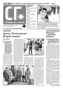 16+ Еженедельная газета Северного района. Основана 20 июля 1935 года ГАЗЕТА ПРОДАЁТСЯ ВО ВСЕХ ПОЧТОВЫХ ОТДЕЛЕНИЯХ РАЙОНА! ВСЕ НОВОСТИ НОВОСИБИРСКОЙ ОБЛАСТИ НА САЙТЕ VN.RU 21 сентября 2022 г. Среда, №38 (8979) Северная газета 22 сентября Ночью: +13. Днем: +25. Переменная облачность. Ветер западный, 12 м/с. 23 сентября Ночью: +4. Днем: +15. Переменная облачность. Ветер западный, 11 м/с. 24 сентября Ночью: 0. Днем: +7. Переменная облачность. Ветер северо-западный, 10 м/с. 25 сентября Ночью: –3. Днем: +9. Ясно. Ветер западный, 9 м/с. 26 сентября Ночью: +1. Днем: +11. Переменная облачность. Ветер юго-западный, 2 м/с. 27 сентября Ночью: +2. Днем: +13. Переменная облачность. Ветер юго-западный, 6 м/с. 28 сентября Ночью: +2. Днем: +13. Переменная облачность. Ветер южный, 7 м/с. ПОГОДА Галина Яковлева, директор Чебаковского СДК и активная общественница, принимала участие в Форуме молодежи «PROрегион», который проходил с 6 по 9 сентября на территории Образовательного парка им. Олега Кошевого. О том, как проходила смена, Галина делится впечатлениями с читателями на стр. 4. В ПРАВИТЕЛЬСТВЕ НСО Награды — к юбилею области JГубернатор Андрей Травников и председатель Заксобрания Новосибирской области Андрей Шимкив вручили государственные награды и награды НСО выдающимся землякам. Андрей Травников отметил, что нынешняя церемония вручения высоких наград открывает собой череду мероприятий, приуроченных к празднованию 85-летия Новосибирской области. «Последние пять лет были достаточно успешными для нашего региона, несмотря на неожиданные сложности, возникавшие в этот период. Мы активно пользовались новыми возможностями и достигали всех основных целей, которые перед собой ставили — развиваться и расти быстрее, чем другие регионы нашей страны. Это удавалось и по развитию экономического потенциала, социальной сферы, преображения территории городов и сел нашей области», — подчеркнул Андрей Травников. Среди награжденных — люди самых разных профессий. Так, орденом Александра Невского награжден Алексей Конторович — советник РАН, основатель Института нефтегазовой геологии и геофизики имени А.А. Трофимука СО РАН. Орденом Пирогова награждена Елена Головко — начальник Государственного Новосибирского областного клинического госпиталя. Медаль ордена «За заслуги перед Отечеством» I степени врученаЮрию Петухову — первому заместителю Губернатора НСО. МедальюОрдена «За заслуги перед Отечеством» II степени награждены: Ольга Благо — председатель Избирательной комиссии НСО; Владимир Гузанов —инженер по эксплуатации ООО «АльфаГазСтройСервис»; Валентина Дудникова — первый заместитель руководителя администрации — руководитель департамента организации управления и государственной гражданской службы администрации Губернатора и Правительства НСО; СергейШевчук — старший летчик-испытатель филиала АО «Авиационная холдинговая компания «Сухой» «Новосибирский авиационный завод имени В.П. Чкалова». Пресс-служба губернатора и правительства НСО НАЦПРОЕКТ Центр «Точка роста». Второй пошел! Раиса АКИЛИНА J15 сентября в Бергульской основной школе открыли центр «Точка роста». На торжественном открытии присутствовали глава Северного района Сергей Коростелев, начальник управления образования администрации Наталья Устьянчик, глава Бергульского сельсовета Иван Трофимов. Нужно отметить, что в 2022-2023 учебном году в Но