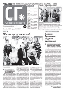 16+ Еженедельная газета Северного района. Основана 20 июля 1935 года ГАЗЕТА ПРОДАЁТСЯ ВО ВСЕХ ПОЧТОВЫХ ОТДЕЛЕНИЯХ РАЙОНА! ВСЕ НОВОСТИ НОВОСИБИРСКОЙ ОБЛАСТИ НА САЙТЕ VN.RU 5 октября 2022 г. Среда, №40 (8981) Северная газета 6 октября Ночью: +6. Днем: +10. Пасмурно. Ветер западный, 6 м/с. 7 октября Ночью: +4. Днем: +12. Переменная облачность. Ветер юго-западный, 14 м/с. 8 октября Ночью: +9. Днем: +12. Переменная облачность. Ветер северо-западный, 12 м/с. 9 октября Ночью: +6. Днем: +8. Пасмурно. Дождь. Ветер западный, 9 м/с. 10 октября Ночью: +4. Днем: +11. Переменная облачность. Ветер юго-западный, 12 м/с. 11 октября Ночью: +5. Днем: +12. Переменная облачность. Ветер юго-западный, 7 м/с. 12 октября Ночью: +4. Днем: +13. Переменная облачность. Ветер западный, 14 м/с. ПОГОДА Людмила Владимировна Чалкова отдала работе в школе более 36 лет, из них 30 лет трудится в должности директора Бергульской школы. На стр. 5 она поделилась своими мыслями о современной школе, своих коллегах и труде сельского учителя. ДАТА Жизнь продолжается! Раиса АКИЛИНА JЕсть старая добрая истина: возраст определяется не количеством прожитых лет, а состоянием души. И это, безусловно, так! В день открытия «Декады мудрых», как традиционно в нашем районе называется декада пожилого человека, в зале культурно-досугового центра собрались люди, которые привыкли измерять своюжизнь не прожитыми годами, а добрыми и полезными обществу, родным и близким делами. Когда смотришь на активных, не уставших от жизни людей, то понимаешь, что состояние их души, хорошая физическая форма — не подарок свыше, а результат их активной жизненной позиции, их трудолюбия, открытости миру и доброте. Поздравляя ветеранов с праздником, глава Северного района Сергей Владимирович Коростелев и председатель Совета депутатов Игорь Викторович Звыков отметили, что День пожилых людей — это замечательный повод отдать им дань уважения и признательности. Совсем недавно Новосибирская область отметила 85-летний юбилей. И в ее сегодняшних успехах — огромная доля труда старшего поколения, их энергии и патриотизма. Руководители района вручили юбилейный знак «Новосибирь-85» ветеранам, которые внесли достойный вклад в развитие родной области и района. Памятной награды удостоеныЮ.М. Антипина, В.Г. Борисов, В.В. Долотова, Г.П. Лукъянчук, В.И. Лукъянчук, В.Н. Слепцов, С.И. Попов, Т.М. Ратникова, Н.А. Никитенко, Л.Я. Лаврова, Ю.Г. Поземин. Также благодарности главы района и Совета депутатов были вручены активистам ветеранского движения З.А. Андриенко, З.И. Балабановой, В.И. Лукомскому, Ю.Е. Чалкову, Г.М. Александровой, Е.Д. Бойченко, О.В. Хольцевой, Н.И. Шейн. —В этом году вместе с юбилеем области мы отмечаем 50-летие областного и 35-летие районного советов ветеранов, — отметил в своем выступлении председатель совета Григорий Федорович Киселев. — Ветеранов всегда отличала активная позиция, мы продолжаем быть в строю! Сегодня, в трудное для страны время, мы должны быть сплоченными и верить в нашу победу! Настоящим подарком для присутствующих стала праздничная программа. Творческие коллективы КДЦ и солисты исполнили патриотические и лирические песни, порадовали зрителей яркими и зажигательными номерами. «Декада мудрых» только начинается. Впереди — множество интересных и увлекательных мероприятий. Слово о директоре школы Директор Л.В. Чалкова на открытии центра «Точка роста» в Бергульской школе Ф