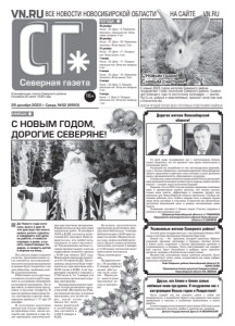 16+ Еженедельная газета Северного района. Основана 20 июля 1935 года ГАЗЕТА ПРОДАЁТСЯ ВО ВСЕХ ПОЧТОВЫХ ОТДЕЛЕНИЯХ РАЙОНА! 28 декабря 2022 г. Среда, №52 (8993) Северная газета 29 декабря Ночью: –24. Днем: –9. Переменная облачность, небольшой снег. Ветер северо-западный, 2 м/с. 30 декабря Ночью: –27. Днем: –29. Переменная облачность. Ветер южный, 3 м/с. 31 декабря Ночью: –18. Днем: –11. Пасмурно, снег. Ветер южный, 4 м/с. 1 января Ночью: –25. Днем: –11. Пасмурно, небольшой снег. Ветер юго-западный, 2 м/с. 2 января Ночью: –25. Днем: –16. Переменная облачность. Ветер южный, 2 м/с. 3 января Ночью: –20. Днем: 0. Пасмурно, небольшой снег. Ветер юго-западный, 6 м/с. 4 января Ночью: –7. Днем: 0. Пасмурно, небольшой снег. Ветер юго-западный, 7 м/с. ПОГОДА С новым 2023 годом жителей Северного района поздравляют главы поселений Северного района. Символ наступающего года по восточному календарю — кролик. Пусть он, добрый и миролюбивый, принесет всем нам мир и благополучие. АФИША С НОВЫМ ГОДОМ, ДОРОГИЕ СЕВЕРЯНЕ! JДо Нового года осталось всего 3 дня! В эти дни еще так много нужно успеть сделать: и завершить все дела на работе, и навести порядок в доме, и купить недостающие подарки, и сводить детей и внуков на елку… Но совсем скоро отгремят салюты, предновогодняя суета сменится долгожданными длительными выходными и можно будет посвятить эти дни общению, любимому хобби и развлечениям. Работники культуры подготовили для жителей Северного и сел района обширную культурную программу. Это и выставки, и новогодние праздники, и веселые эстафеты. В школах района новогодние балы, маскарады и другие мероприятия пройдут с 27 про 30 декабря. В культурно-досуговом центре как всегда оформлена красивая елка, около которой уже прошли и еще будут проходить многочисленные праздничные программы. В фойе разместились выставки творческих работ. 30 декабря в 20:00 в КДЦ состоится новогодний бал-маскарад. Приглашаются все, кто любит петь, танцевать и умеет веселиться! Традиционное ночное гуляние пройдет вокруг елки на территории снежного городка с 01:00 уже нового 2023 года. Новогодняя дискотека начнется в 01:30 в фойе КДЦ. Молодежные дискотеки будут проходить все праздничные дни с 20:00 также в КДЦ. А на территории снежного городка с 17:00 часов 4, 5 и 7 января для школьников организуют игровые программы. Традиционное рождественское театрализованное представление «Волшебство Рождественской звезды» и игровая программа для детей-сирот, детей, оставшихся без попечения родителей и детей-инвалидов состоится в 12:00 6 января в КДЦ. Большую праздничную программу подготовила центральная библиотека. 4 января библиотекари в 10:00 приглашают на акции «Первая десятка года» (взрослая библиотека) и «Десять самых активных читателей» (детская). 6 января в 11:00 юных читателей ждет новогодняя мастерская «Чудо своими руками». На крытом катке с 30 декабря по 8 января пройдет акция «На каток всей семьей». Проведите новогодние праздники весело и интересно! Дорогие жители Новосибирской области! От всей души поздравляем вас с наступающим Новым годом! Надеемся, что он принесет нам яркие впечатления и позитивные вести. Уходящий год потребовал от нас нестандартных решений, и мы с честью справились с вызовами времени. Новосибирская область продолжает укреплять свои позиции в роли флагмана науки, промышленности, образования и культуры. Сегодня мы с вами пишем историю но