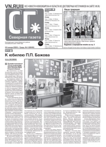 16+ Еженедельная газета Северного района. Основана 20 июля 1935 года ГАЗЕТА ПРОДАЁТСЯ ВО ВСЕХ ПОЧТОВЫХ ОТДЕЛЕНИЯХ РАЙОНА! 24 января 2024 г. Среда, № 4 (9049) Северная газета 25 января Ночью: –24. Днем: –13. Малооблачно, без осадков. Ветер юго-восточный, 4 м/с. 26 января Ночью: –19. Днем: –12. Облачно, небольшой снег. Ветер южный, 3 м/с. 27 января Ночью: –17. Днем: –7. Пасмурно, небольшой снег. Ветер южный, 3 м/с. 28 января Ночью: –13. Днем: –6. Безоблачно. Ветер юго-восточный, 3 м/с. 29 января Ночью: –13. Днем: –8. Пасмурно, без осадков. Ветер восточный, 3 м/с. 30 января Ночью: –18. Днем: –12. Облачно, без осадков. Ветер восточный 3 м/с. 31 января Ночью: –19. Днем: –12. Малооблачно, без осадков. Ветер восточный, 3 м/с. ПОГОДА ВСЕ НОВОСТИ НОВОСИБИРСКА И ОБЛАСТИ ИЗ ДОСТОВЕРНЫХ ИСТОЧНИКОВ НА САЙТЕ VN.RU В детском саду «Сказка» для воспитанников подготовительной группы «Светлячки» провели рождественские колядки. Подробнее о мероприятии читайте на стр. 2 Наши традиции ДАТА К юбилею П.П. Бажова Алёна МАТВЕЕВА J 28 января исполняется 145 лет со дня рожде- ния известного ураль- ского писателя Павла Петровича Бажова. Мы знакомимся с его твор- чеством еще в детстве. Каждо- му из нас знакомы такие сказы, как «Серебряное копытце», «Хо- зяйка медной горы», «Малахито- вая шкатулка» и многие другие. К Северному району Па- вел Петрович имеет непосред- ственное отношение. С февра- ля по июль 1919 года под фами- лией Кирибаев он работал зем- ским учителем в отдаленном се- ле Бергуль. К 105-й годовщине со дня его рождения в Бергу- ле прошло торжественное от- крытие дома-музея имениПав- ла Бажова. В настоящее время бережно хранит историю села лектор-экскурсовод музея Та- тьяна Подъява. Галина Дмитриевна Багро- ва —одна из тех, кто творчеству уральского писателя уделил в жизни особое место. «Все нача- лось с того, что в 1968 году уче- ники Северной средней шко- лы, у которых я тогда препода- вала русский язык и литерату- ру, получили задание от школь- ной партийной организации со- брать материал о писателе Пав- ле Бажове, — делится воспоми- наниями Галина Дмитриевна. — Для нас это стало большой не- ожиданностью. Ребята читали «Малахитовую шкатулку», но не знали, что писатель в очень трудное для страны время жил в нашем районе. Была продела- на колоссальная работа по сбо- ру информации: читали статьи в Большой советской энцикло- педии, искали издание «Ураль- ские сказы». А потом нам пода- рили третий том собрания сочи- нений Бажова, в котором поме- щена его повесть «За советскую правду». Мы читали и не вери- ли: речь шла о нашем Бергуле!». На школьной линейке дети рассказали о результатах по- иска и выступили по местному радио. В Северную школу ста- ли поступать книги, рисунки, фотографии, по которым был восстановлен весь жизненный и творческий путь писателя. Юные следопыты на этом не останавливались. Фотографи- ровали и записывали рассказы всех учеников Бажова, побыва- ли на родине писателя, на его могиле, в гостях у его жены Ва- лентины Александровны. Му- зей регулярно пополнялся но- выми экспонатами. Здесь сосре- доточился своеобразный центр краеведческой и воспитательной работы—классные часы, твор- ческие встречи, уроки истории и литературы проводились на регулярной основе. «В 1970 году я побывала в Усть-Каменогорске, куда уехал Павел Бажов из Бергуля, —про- должает Галина Дмитриевна. — Много новых фотодокументов пополнило бажовский уг