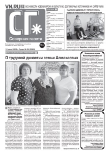 16+ Еженедельная газета Северного района. Основана 20 июля 1935 года ГАЗЕТА ПРОДАЁТСЯ ВО ВСЕХ ПОЧТОВЫХ ОТДЕЛЕНИЯХ РАЙОНА! 12 июня 2024 г. Среда, № 24 (9069) Северная газета 13 июня Ночью: +13. Днем: +24. Безоблачно. Ветер северный, 3 м/с. 14 июня Ночью: +12. Днем: +18. Малооблачно, небольшой дождь. Ветер юго-западный, 2 м/с. 15 июня Ночью: +12. Днем: +22. Малооблачно, небольшой дождь. Ветер южный, 2 м/с. 16 июня Ночью: +15. Днем: +25. Малооблачно, небольшой дождь, гроза. Ветер юго-западный, 2 м/с. 17 июня Ночью: +15. Днем: +24. Малооблачно, небольшой дождь, гроза. Ветер северный, 2 м/с. 18 июня Ночью: +15. Днем: +19. Малооблачно, без осадков. Ветер северо-западный, 2 м/с. 19 июня Ночью: +13. Днем: +19. Пасмурно, небольшой дождь. Ветер северный, 2 м/с. ПОГОДА ВСЕ НОВОСТИ НОВОСИБИРСКА И ОБЛАСТИ ИЗ ДОСТОВЕРНЫХ ИСТОЧНИКОВ НА САЙТЕ VN.RU В «Школе здоровья» на базе КЦСОН прошла презентация новых массажных аппаратов, приобретенных на средства выигранного гранта в районном конкурсе социально- значимых проектов. Подробнее читайте на стр. 2 «Школа здоровья» пополнилась новыми массажными аппаратами ДЕНЬ СОЦИАЛЬНОГО РАБОТНИКА О трудовой династии семьи Алмакаевых J В День социально- го работника мы рас- скажем о семейной трудовой династии Алмакаевых: маме Татьяне Тимофеевне и ее дочерях Оксане Шалагиной и Анаста- сии Барденковой. Династия социальных работников — редкое явле- ние. Мы больше привыкли слышать о династиях вра- чей, педагогов, военных. История этой династии не совсем обычная. О семье Алмакаевых рассказала ди- ректор Комплексного цен- тра социального обслужи- вания населения Северного района Елена Крестьянова. «Первой в профессию со- циального работника при- шла старшая дочь Оксана в 1993 году, а спустя 4 года ма- ма Татьяна Тимофеевна бы- ла принята соцработником. Татьяна Тимофеевна Ал- макаева работала в должно- сти социального работника в период с декабря 1997 го- да по февраль 2001 года, и вновь была принята почти через год, проработала она до мая 2013 года. Свою тру- довую деятельность закон- чила в 64 года. За период ра- боты зарекомендовала себя как добросовестный, ответ- ственный работник, душев- ный, искренний, терпели- вый человек. В ее большом сердце всегда хватало добра, сопереживания, заботы для каждого подопечного. Ее от- крытый характер, доброта, милосердие, трудолюбие пе- редались и дочерям», — рас- сказывает Елена Владими- ровна. За 14 лет работы в соци- альной сфере Татьяна Ти- мофеевна неоднократно по- ощрялась различного уров- ня наградами, вот основные из них: благодарность гла- вы Северного района, почет- ная грамота Новосибирско- го областного Совета депу- татов, почетная грамота гу- бернатора Новосибирской области. 1 марта 2024 года Татьяна Тимофеевна отметила свой юбилей — 75 лет. «ОксанаШалагина в си- стеме социальной защиты работает с ноября 1993 го- да, до февраля 2020 года — в должности социального ра- ботника. С момента внедре- ния системы долговремен- ного ухода за гражданами пожилого возраста переве- дена в службу сиделок (по- мощников по уходу) в долж- ности сиделки. За период работы Окса- на Валерьевна трижды уча- ствовала в областном кон- курсе профмастерства в раз- ных номинациях. В 2021 го- ду стала победителемНово- сибирского областного кон- курса на звание «Лучший работник организации со- циального обслуживания» в номинации «Лучшая си- делка (помощник по уходу) организации социального обслуживания», 
