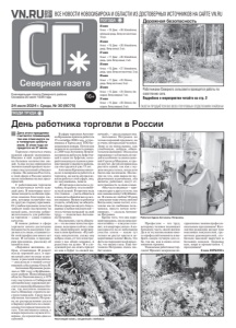 16+ Еженедельная газета Северного района. Основана 20 июля 1935 года ГАЗЕТА ПРОДАЁТСЯ ВО ВСЕХ ПОЧТОВЫХ ОТДЕЛЕНИЯХ РАЙОНА! 24 июля 2024 г. Среда, № 30 (9075) Северная газета ПОГОДА ВСЕ НОВОСТИ НОВОСИБИРСКА И ОБЛАСТИ ИЗ ДОСТОВЕРНЫХ ИСТОЧНИКОВ НА САЙТЕ VN.RU Работниками Северного сельсовета проводятся работы по осветлению села. Подробнее о мероприятии читайте на стр. 2 Дорожная безопасность ЛЮДИ ТРУДА Фото Алёны Матвеевой 25 июля Ночью: +18. Днем: +28. Малооблачно, небольшой дождь. Ветер юго-восточный, 10 м/с. 26 июля Ночью: +18. Днем: +28. Малооблачно, дождь. Ветер южный, 5 м/с. 27 июля Ночью: +17. Днем: +26. Малооблачно, дождь, гроза. Ветер южный, 4 м/с. 28 июля Ночью: +19. Днем: +27. Малооблачно, дождь, гроза. Ветер юго-восточный, 5 м/с. 29 июля Ночью: +17. Днем: +23. Облачно, дождь. Ветер восточный, 9 м/с. 30 июля Ночью: +15. Днем: +24. Облачно, без осадков. Ветер северный 7 м/с. 31 июля Ночью: +15. Днем: +20. Облачно, без осадков. Ветер северный, 9 м/с. День работника торговли в России J Дата этого праздника считается плавающей, так как отмечается он в четвертую субботу июля. В этом году он придется на 27 июля. Торговля считается очень важной сферой экономики. Именно в ней задействова- но большое количество лю- дей. А еще на нее приходится значительный процент нало- говых поступлений в бюджет страны. По данным Росстата, в этой сфере в России занято около половины малых пред- приятий. С работниками торговли мы встречаемся почти каж- дый день. В некоторые мага- зины заходить особенно при- ятно именно благодаря лю- дям, которые встречают нас по другую сторону прилавка. От улыбки продавца зачастую зависит наше настроение на целый день, поэтому добро- желательность для работни- ка торговли — самое главное качество. В нашем районе в сфере торговли занята достаточно большая часть населения. Сре- ди них есть люди, отдавшие се- бя этой профессии много лет назад. И сегодня, в преддве- рии праздника, расскажу об одной из них. «Хорошая женщина, до- брая, отзывчивая. И рецепт всегда хороший даст, и пра- вильный совет по уходу за цве- тами, и рассадой поделится», — рассказала о нашей сегод- няшней собеседнице Ольга И. Антонина Кремнева роди- лась в 1961 году в Куйбышев- ском районе Новосибирской области. Окончив школу, в 1979 году поступила в Сибирский автомобильно-дорожный ин- ститут имени Куйбышева в Ом- ске, где получила специаль- ность «Инженер-строитель мо- стов и тоннелей». Сразу после обучения Антонина Петров- на по распределению уехала в Барнаул работать по специ- альности в проектном инсти- туте. Там она вышла замуж, а вскоре переехала с мужем в Се- верное, где и родились двое ее сыновей. В сферу торговли Антони- на Кремнева пришла работать 25 сентября 2000 года, устро- ившись в Тартасское ТПО по- мощником повара. Потом она перешла на должность повара, а с 2009 года Антонина Петров- на пришла работать буфетчи- цей в один из буфетов, кото- рый находится в здании адми- нистрации Северного района, где она трудится уже 15 лет. Антонина Кремнева никог- да не планировала работать в торговле, но когда ей предло- жили работу в этой сфере, она, не задумываясь, пошла. «В торговле я оказалась слу- чайно, но работу эту полюби- ла всей душой. В торговле ведь что главное — уметь общаться и находить общий язык со все- ми людьми. Нужно и ребенку угодить, и бабушку не обидеть. Очень приятно видеть благо- дарные улыбки покупателей— это я считаю наградой за свой тру