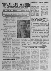 Пролетарии всех стран, соединяйтесь! ТРУДОВАЯ ЖИЗНЬ Орган парткома Куйбышевского производственного управления, городского комитета партии, районного и городского Советов депутатов трудящихся Новосибирской области Суббота, 3 0 мая 1 9 6 4 года. № 8 6 ( 4 1 0 ) . Год издания 3 - й . Цена 2 коп . Надежда Ивановна Шульга—доярка второй бригады колхоза „Заря коммунизма“ надаивает в день 13,5 килограмма молока от коровы. Она обязалась с 1 июня надаивать по пуду. Вторая бригада в целом получает по 10,2 кг от коровы. Слово делом Рая вспоминает свое недалекое детство, и в ее больших глазах я вижу и туманное утро, и рыбацкую лодку, и девчонку с короткими косичками. Она держит в тонких руках большое весло, и с него неслышно скатываются капли воды. Вижу, как девочка бежит к дому с тяжелым куканом налимов. Гордо сверкают глаза маленькой рыбачки. Трудно поверить, что когда-то Раиса Сафронова была рыбачкой. Но это так. Годы летят, как быстрокрылые птицы. Не успела Рая оглянуться, как позади остались и детство, и школа. — Как в Сибирь с Волги попала? — пере- - спрашивает она. — Поехали родственники. И я с ними. Теперь вот работаю дояркой. Управляющий первой фермой Комсомольского совхоза Федор Лаптев говорит: — Чудесная женщина. Золотой человек. Первой откликнулась на призыв бергульцев. Вместе со всеми доярками фермы включилась в борьбу за высокие надои молока. Сейчас Раиса Сафронова получает от каждой из четырнадцати коров по одиннадцать килограммов молока в день. — Буду стараться, чтобы получать пуд, — говорит она. — Ведь такое время. п одкр еп ля ет ся В ИНТЕРЕСАХ МИРА И ДРУЖБЫ В ы с т у п л е н и е Н. С. Х р у щ е в а п о р а д и о и т е л е в и д е н и ю Ми л л и о н ы советских людей слушали и смотрели 27 мая выступление по радио и телевидению Председателя Совета Министров СССР товарища Н. С. Хрущева. Глава Советского правительства говорил о своем только что завершенном дружественном визите в Объединенную Арабскую Республику. Это был визит во имя интересов народов СССР и ОАР, во имя интересов всех народов, борющихся за мир, демократию и социальный прогресс. Выступление Н. С. Хрущева видели телезрители на огромной территории нашей страны — от Урала до ее западных границ — в Свердловске, Казани, Горьком. Киеве, Минске, Кишиневе, Вильнюсе, Таллине, Риге, Симферополе и во многих других городах и населенных пунктах. Выступление главы Советского правительства передавалось также по системам «Интервидение» и «Евровидение». ТАСС. За у спе хи, дос тигнутые в производстве и продаже молока государс тву, на районную До с к у почета заносятся: Колхоз « П у т ь н к омм унизму » (председатель т . Кемелев, секретарь парторганизации т . Г р у е н к о ) , по состоянию на 20 мая перевыполнивший полугодовой план продажи мюлока государству. Восьмая бригада первой фермы Октябрьского совхоза (старшая доярка т . Ф оменко), получающая в среднем от каждой фуражной коровы в сутки около 12 килограммов молока. Доярки третьей фермы Куйбышевского совхоза Т . Б а р с у кова , Е. Щер бакова и Н. Буевич , ежедневно получающие по 11— 12 килограммов молока от коровы. Доярки первой фермы Комсомольского совхоза А. К и - яшно, Е. Пилясова, Р. Сафронова, добившиеся суточных надоев от каждой коровы 1 0 — 11 килограммов. ГОТОВЯТ УЧАСТКИ ПОД КУКУРУЗУ На днях механизаторы девятой фермы И ч инс кого совхоза эаВремя для животноводов, действите