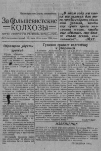I cu í Про л е тарии в сех с т р ан, с о е д и н я й т е с ь i За большевистские К О Л Х О З Ы ОРГАН СЕВЕРНОГО РАЙКОМА ВКП(б) н РИКа № 2 г о д издания первый Пятница 2 6 - г о июля 1935 г ода . Вэт ом г о д у мы ем все у с л о в и я д л я того, чтобы собрать обиль ный урож ай , чтобы еще лучше цвела к о л х о з н а я жизнь, чтобы еще обильнее, еще б о га че стала жизнь^ к о л хозников"... ЗЙХЕ . Образцово у б р а т ь у р ож а й Уборка о бил ьн о го у р ож а я п р и б л и ж а е т с я с молниеносной б ы с т р о т о й . В о миогих к олхозах ро&й у ж е наливается восковой с п е л о с т ь ю , а в к о л х о з е „Верный п у т ь “ 1 Ж у л и * о в е к о г о с е л ь с о в е та при ступи ли к у б о р к е ржи и 25 июля. Д н и и часы д о начала уборки с о ч т ены , а о т многих к ол хо з ов и д у т т р е в о ж н ы е в е с т и , о том ч т о люди, машины, лошади не г о т о в ы к с в о е в р ем е н н о й у б о р к е У к о л х о з о в н ет / б о е в о й рабо ты, по о б о р у д о в а н и ю крытых на БСССВ, чтобы м ож н о было в л ю бу ю по»Оду обмолачивать з е р н о Т ел е г и , мешки, ящики, амбары и о хр а н а не приведены в б о е - ву ю г о т о в н о с т ь , планы у б о р о ч - и ы х ^ В б о т , еш е ро мно1их к с л- п р ср а бо т аьы в брига з ь е к ь я х—колхозники не юих р аб о т . >дители ь м е с т о тслко - бой, Соевой ра сп ор яди т ельн о сти р а с т е р я л и с ь , ищ ут объективные причины, „нехватнет лю дй , тяг л о в о й силы; днем комары и о в о д не даю т р а б о т а т ь * . В се эти разговоры на руку т олько классовому враау н л о ды рю — е г о помощ ник у .- С ей ч а с р у к о в о д и т ел и должны взяться с б о л ьш е в и с т ск о й с т р а с т н о с т ь ю за п р и в е д е н и е в б о е в у ю г о т о в н о с т ь я с е х сил т» с р е д ств о б есп еч и в аю щ и х сьо ев р ем ен н у ю х л е б о у б о р к у и выполнение г о с п о с т а в о к . О тстающ и х к о л х о з о в таких как „К ультпоход* по у б о р к е хл е б о в н е д о л ж н о быть в нашем рай о н е . Гудимов срывает подготовку к уборочной В к о л х о з е „ К у л ь т п о х о д * Се в ер н о г о с е л ь с о в е т а подготовка х л е б о у б о р о ч н о й и х л е б о п о с тавкам пр ов оди т ся сл а б о . Из 6 ж а т о к на х о д у только 2, а 2 т р е б у ю т р емонт а . Из 2-х имеющихся молотилок исправны лишь одш1. Тока хо тя и были в прош лом г о д у о б о р у д о в а н ы крышами но крыши эти развалились и т р е б у ю т капитального ремонта. Л ю д и , к о т оры е б конечном с ч е т е решгют задачи такж е не п о д г о т о в л е н ы . П р е д с е д а т е л ь правления т . Мзкаревский зая в л я е т , что х л е б о у б о р к у б у д е т п р о в о д и т ь та ж е бригада к о к и рая п р о в о д и т сейч ас с е н о ) б о р к у . Бригада эта (бри г а д и р Г у д и ме в) план с е н о у б о р а ч н о й выпол кила на 22 июля на 14 проц. Бригадир Г у д ь ъ о ь к р а б о т е о т косится по г а з и ь с м у : у / з р ы : ч е е т в о и с о ц сср еь н ов ан » :е я Орк гаде не в п о ч е т е , люди в т е ч е нии дня б е с т о л к о в о пер ебр а сы - ваются^с о д н о й работы на д р у г у ю и п о э т о м у не дают ударных п о к а за т ел ей . Звеньевым п е р в о г о звена р а б о т а е т Картавенко Н и колай, который сорвал у ч е т т р у дь колхозник ов в п о севн ую и смазал у д а р н у ю р а б о т у таких п е р е д о в ы х колхозников как Филимонов Семен, А н д р о с о в М и х а ил и д р . Э то т с позволения с к а зать з з е к ь е в о д в м е с т о мобилиза иии колхозников с в о е ю звен а на ударные, о б р а з ц о вы е пок аза тели работы все время ск у л к т с т о м , „что си неграмотный" что не м о ж е т , ые справляется с работой и т. и. звеньеведъм кто poro звена р а б о т а е т Большако