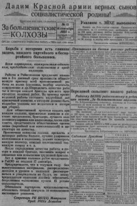 Д а д и м К р а с н о й а р м и и верных сынов социалистической родины! Пролетарии всех стран, соединяйтесь! З а большевистские — К О Л Х О З Ы = № 13 14 сентября 1935 г. ПЕРВЫЙ Г О Д И З Д А Н И Я О Р Г А Н С Е В Е Р Н О Г О Р А Й К О М А В К П ( б ) и РИКа ЗАП . СИБ. КРАЯ. Указание т. ЭЙХЕ выполнено К о л х о з им. б - г о с ъ е з д а с о в е т о в , Гражданцсвскс с е л ь с о в е т а , на. 12 с ен тя бр я план х л е б о с д а ч и в ы п е т на 1 0 0 проц ., к о с о в и ц } х л е б о в закончил 3 - г о . сентяб ск и р до в а ни е идет к о кончанию р а б о т . П о с е в озимых п р о и з в е д е н с п ер евыполнением п; на 3 6 гектар, к п о с е в у зя б и пр е ступ аем с 15 сентябр П р е д с е д а т ел ь к о л х о з а А Н ТО Н ЕН КО . Б о р ь б а с потерями есть главная з а д а ч а , к а ж д о г о п артийного и б е с п а ртийного большевика. • * Т ____________ ' , • Всем п а рт о р гам , к о м м ун и ст ам -о ди н о ч - к а м , п р е д с е д ат е л ям сельсоветов и предк о л х о з о в. Райком и Райисполком предлагает к олхо зам в 3-х дневный срок произвести общ ест венную приемку всей произведенной работы на полях (косовица, подбор колосьев, скирдование и др.)Определить качество рабо ты и потери каждой бригады при в сех про- процесах полевых работ. На приемку произведенной работы составить подробный акт приемочной комисии, в котором долж н о быть п одробно указаны все недостатки и потери при у б о р к е . Для общественной приемки со зд ать при каждом к о л х о з е , приемочные комисии в с о ставе: предколхоза, бригадира, лучшего кол- хозника-ударника или колхозницы, члена сель совета, представителя общественных органи зации (партийной или комсомольской) и иц- спектора по качеству. Приемочная комиссия должна привлечь к проверке работы больше, лучших ударников колхозников и колхозниц, должна осмотреть каждую полоску, каждый молотильный ток. каждую скирду и т. д. После определения качества работы и потери в каждой бригаде, поставить вопрос о снижении или повышении трудодней бригаде. Акт о приемке полевых работ представить в РайЗО не п оздн ее 17 сентября. Предупреждаем, что в текущем г о д у б е з вышеуказанных материалов, распределение д о х о д о в и урожая в к ол х о за х рассматриваться и утверждаться не б удут , по этому Председатели к ол хо зов должны обеспечить б е з у с л о в н о е выполнение пункта 15 устава сельхозартели. Обязываем парторгов, предсельсоветов, обеспечить точный контроль за исполнением настоящего указания. Секретарь Р К ВКП(б) М атросов Пред. РИКа Д е м и д о в П ри зывники на б о е в о м у ч а с т к е работы 11 с ентября на комсомольском собрании при сел е Северном по ини циативе допризывников т. ГАЙ Д У - КДВА, ГОЛОСКОВА ЧЕРКАШИ- НА была организована ком сом ольская бригада в составе: 19 человек комсомольцев и беспартийных т. т. Никитиной, Коростелева и Гудим о вой на о бм ол о т хлеба,для до срочн о го выполнения плана з е р н о п о с т а вок колхозом „К у л ь тп о х о д “, в ч е сть призыва 1913 года. Комсомольская бригада работала ровно сутки [день 12 и ночь 13 сен тября). Р абота шла дружно и в ес ел о . Призывники 1913 года рождения идут в армию с глубоким чувством радости и считают большой честью носить великое звание бойцов вс ных сынов’ социалистической ро ны. Среди призывающихся, стар рекрутчина отошла в прошлое ф же ,как и капиталистическая дер» ня старой Ро ссии . На смену е е встала новая дер< ня с е е колхозами и новыми лю; ми-ударникрми социалистическс земледелия и живот