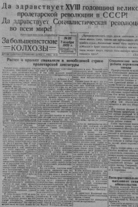 Д а з д р а в с т в у е т X V I I I годовщина в е л и к е пролетарской революции в С С С Р ! Д а здравствует Социалистическая револющ во все!М мире! ________ Пролетарии всех стран , соединяйтесь! З а большевистские = К О Л Х О З Ы = О Р Г А Н С е Р Ш ' Н О Г О Р А Й К О М А 13,<П(б) и , РИКн З С К . № 22 7 ноября 1935 г. П Е Р В Ы Й Г О Т И З Д А Н И Я • ( » П р о и з в о д и т е л ь н о с т ь труда , э т о , в п о с л е д н е м е с ам ое в аж н о е , с а м о е , главное для победы н о в о г о обе в е н н о г о с т р о я . . . . Капи тали зм может бы ть о к о н чаге п о б е ж д е н и б уд е т о кончательно п о б еж д ен т е м , ч т о I алнзм с о з д а е т н о в у ю , го р а з д о более в ы с о к у ю п р о л з тел ьн ое гь т р у д а 1 (Ле1 Р а ст ет и крепнет социализм в непобедимей стране пролетарской диктатуры • Рабочий класс, колхозники и псе трудящ и еся С о в е т ск о г о союза и вместе с ними пролетарии и угне н те я ни п ыра е зд в н се у г ю о т з 1 ем 8- н у о ю го год ц о л з р ща н с и е у го в д е лнкой Октябрьской революции,, от к ви р т ы и в и ше ч й ел с о о в б е о ч юест н в о а в , уюнов э у р юу в эп р о а х з у всемирной истории!" (из ' комсомо- мольскон правды), Ровно 18 лет прошло с тех пор, когда рабочий'клас^ в союзе с бе дйейшим крестьяне гвом, под руко водегзом велйкои партии Ленина с т в а е л р и г с л т и ов ц , а у р н я и , ч Н т о о мж е и щл и и ко э з к * сп и л к р а а п та и - л ц и йю б у и рж эк у е а н з л н о у а ю гат д о е р мов о * кра у т н и и ючт , о и ж н и а одной шестой части земного шара создали свою власть-пролетарскую ди кт ат уру , которая является „выс с ш щТ о и е А в й м о Р м С и т К н и о т О п б е о Йщ р м е е с д с ы д т е е в м м б е о о о , к л к р ф р ь а о ш а т р т и и м и и н и о , с й тв в п а ыП р { и р Р э а к О к ж с л Л п а а л юЕ с о а р т ат и и р и уеми К х А ) . П - И в Т А пр Л о И ти С в Т о И ве Ч с Е С де К м О о Й к, выражающей интересы меньшинст ва (эксплоататоров)" [Сталин], Мудрая политика нашей партии и руководство нашего вождя тов. Сталина не только обеспечили вое становление народного хозяйства разрушенного долголетней импери а н н л о у ийю , ст н п п о о ч б е и е с д к о у о б й е с с о п н ц е и ч i а р и л а л и жи з д м а а о н к с к о к з н о к й ч в ат r в е o о л p й ь o д к е о , нф та е к рен и ц в ия д е с р к е а в за н л е а . , Е чщ т е о - 1 „ 7 от п н а ы р н т е в ц е и д и ущ в а с я ег р о ол н ь а з род д н ел ог е о ре х к о о з н я с й т с р т у в к а страны принадлежит С о з е т с к о м у машиностроению, нашей Советской тяжелой и нду стрии " , что „наша с мц т о и р г а а о л н и а ст п и р ч е е в с к р к р а о у т г п и о н т з о е е г с м о ь л в ед в е с л м т и и р я р а " н е . у Ещ с с о а е на 17 плртсъезде наш вождь това х р о н з щны С й Т А ст Л р И ойН по ск б а е з д а и л л , о ч к т о о нч ^ а к Те о л л ь но и беаповэротн о" , Наши колхоз ники сгати на правильный путь н твердой поступью идут к культур ной и зажиточней жи'знй. В 1929 году тоя, С Т А Л И Н сказал: , М ы идем нч в сех парах по пути индустриализации-*« социализму, оставляя по зади нашу вековую „Р о с с е й с к у ю " отсталоСть. Мы ста новимся страной металлической, страной автомобилизации, страной тракторизации. т мп е у о н И с б н т и ыь л к е о ь п г , о д а к п а а р п п м о и о б у т с у ж а а ю л д и т и и к с м а д т о ы С г н , н С а а С т Р т ь ра н н к а а т с а о п в р т о , о ч | кичащиеся своей „ц и з и л и з а ц и е й ' .М ы еще пос мотрим какие из стран ъюжно будет тогда „определить" в отсталые и какие в пер едовы е" . И эти слова великого вождя превращаются з материальную дей стзн гельность: Новые станки на ф
