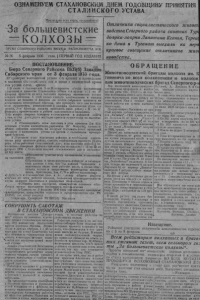 ОЗНАМЕНУЕМ С Т А Х А Н О В С К И М ДНЕМ Г О Д О ВЩ И Н У ПРИНЯТИЯ С Т А Л И Н С К О Г О У С Т А В А П р о л е т а р и и в с е х с т р а н , с о е д и н я й т е с ь! За большевистские К О Л Х О З Ы О Р Г А Н С Е В Е Р Н О Г О Р А Й К О М А В К П ( б ) и РАЙИСПОЛКОМА З С К № 3 6 5 февраля 1936 года. | П Е Р В Ы Й Г О Д И З Д А Н И Я П О С Т А Н О В Л Е Н И Е . Бю р о С е в е р н о г о Р а й к о м а ВКП(б) З а п а д а о С и б и р с к о г о кр ая от 3 ф е в р ал я 193о г о д а . О ' п р о в е р к е выполнения у с т а в а с - х артелей и п р о в е д е н и я в к о л х о з а х Стаханове к о г о дня в связи с годовщиной п р нн я гия устава с - х о з , артели. 1 В связи с г о д о в щ ч .г о й 2 - г о В с е с о ю з н о г о с ” езда к о л х о з н и к о в у д а р н и к о в и принятия С т а л и н с к о г о у с т а в а с - х артели с 11 по 17 ф е в р а л я п р о в е с т и во в с е х к о л х о з а х п р о в е р к у выполнения у с т а в а к а ж д ы м к о л х о з о м . С этой ц е л ь ю с ч и т а т ь н е о б х о д и м ы м в к а ж д о м к о л х о з е не п о з д н е е 11 ф е в р а л я па о б щ и х с о б р а н и я х в ы д е л и т ь из к о л х о з н и к о в п р о в е р о ч н ы е б р и г а д ы , д ля п р о в е р к и т о г о как выполни е т с я п р а в л е н и е м , р е в к о м н с с н е й и к аж д ы м к о л х о з н и к о м у с т а в с - х г .р т е л н . Э т и б р и г а д ы д о лж ны п р о в о д и т ь с в о ю р а б о т у с П п о 17 ф е в р а л я с п р и в л е ч е н и е м к р а б о т е к о л х о з н и к о в и к о л х о з н и ц . Э т о т в о п р о с ш и р о к о о с в е щ а т ь в с т е н г а з е т а х и рай он н ой г а з е т е с тем , ч т з б ы р аз з ер н у ть ж е с т к у ю к р и т и к у ю г э с т з т к о з по в ы л о л н е v m o у с т а в а . 2 Р е к о м е н д о в а т ь всем к о л х о з а м в д ен ь принятия 2-м В с е сою зным с ' е з д о м к о л х о з н и к о в у д а р н и к о в (17 Ф е в р ал я ) , п р о з е с т и Сбгаие с о б р а н и я к о л х о з о в , на к о т о р ы х п о с т а в и т ь о т ч е т правлений ч к н о л о й х о З з б . о У р в и ч г з а о г д ы ыв з ы . а п я олн о е л н ы и г и п у е с р т е а д в о а з ы с - х х р а р т е л и с с о д о к л а д о м п р о в е р о 1й о ч о в и тр еб о з а .ч н я ников ряда к о л х о з о в района, с ч и т а т ь н е о б х о д и м ы м п р о в е с т и к 1 о 5 л х ф о е з в р я л я о б щ е районный с т а х а н о в с к и й д е н ь в с е х к о л х о з о в района а по к о л х о з н о —-товарным ф ермам с т а х а н о в с к у ю п я т и д н е в к у с 15 п о 20 о е ф е в р а л я 1936 г . O c .n o Енон з а д а ч е й стахановского ки п о с т а в и т ь : дня и п я т и д н е в « а к о л х о з н о й • ^ П о г о л о в н о е у ч а с т и е в с е х к о л х о е н и к о а и к о л х о з н и ц р а б о т е ; б ) П р а в и л ь н о и ч е т к о р а с с т а в и т ь р а б о ч у ю и т я г л о в у ю с и л у к о л х о з а с т е м , ч т о с бы каждый к о л х о з н и к и п к о е ч л и х о т з ь н и ч ц е а т к з о н е ал н и о с в п о е р е а р т и а б в о н ч о е е е р м у е к с о т в о о , д а с т т в а о к ж п е ре о д б к е о с л х о з о в , б р и г а д и р о в , З а в , 1 ' Г Ф в р а б о т а к о л х о з н и к о в в с т а х а н о в с к и й л е н ь и п : . ¡д н е в к у о б щ е г о р е з к о г о в с е х р а б о т а х к о л х о з а , п ов ыш ения п р о и з в о д и т е л ь н о с т и ¡груда к а ж д о г о к о л х о зн и к а н р е к о р д н ы х п о к а з а т е л е й . п е ч и I т ь ч е 5 4 т О С к о о б е з я в з а а в т т ы ь ь п • я о а в л с н е е 9 х ни ф е п е а з р н р з т а л о с т я р о г о я 1 в щ9 , 3 е 6 г к о г о о м д п м а о у с н с т п г и а е с о ц т з о и ч в а е л н ь о и н д я о и е н о с ч о е в к е щ о а б н е и с е е р л ь п з р т о р г о в , к о м м у н и с т о в о д а я э т е х и п ^ з д с е л ь с о в е т о в при Р К ,Е К П ( б ) по э т о м у в о п р о с у С е к р е т а р ь С е в е р н о г о Р К В К П ' б ) М а т р о с о в в) Д у б и т ь с я в .о дЧ 'м а во С О К Р У Ш И Т Ь С А Б О Т