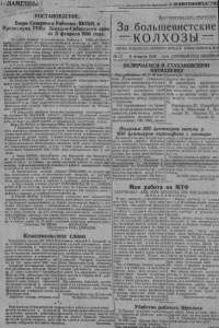 / -Л АМ ЕН НЫ . «ww я я п г * Н * i C v i W l ) ж и в о т н о в о д е ш ПОСТАНОВЛЕНИЕ . Б ю р о С е в е р н о г о Райкома ВКП(б) и П р е з и д и у м а РИКа З а п а д н о -С и б и р с к о г о края о т 3 ф е вр а л я 1936 год а . З а с л у ш а в д о к л а д ы у п о л н о м о ч е н н ы х Р а й к о м а и РИКа об и т о г а х п р о в е д е н н о г о рейда по п р о в е р к е г о т о в н о с т и к о л х о з о в к с е в у Б ю ро Р К ВКП(б) н п р е з и д и у м Р И К а о тм еч аю т , ч т о проведенный р е й д дал з н а ч и т е л ь н о е у л у ч ш е н и е р а б о ты к о л х о з о в ио п ' - , го т о в к е к с е ву ( у с и л е н и е с о р т и р о в к и с ем ян , р емон т и н в е н т а р я н с рун, п р о р а б о т к а но- ф ы х бо л е е вы со к и х норм вы р або то к и т, и.), но н е см о т р я на н е к о т о р о е у л у ч ш е н и е в р а б о т е , под готовка к с е в у н а х о д и тс я в н е у д о в л е т в о р и т е л ь н о м с о с т о я н и и . . ’ а) В р я д е к о л х о з о в о к о н ч а т е л ь н о по б р и г а д ам люди не р а с с т а н о в л е н ы , и н в е н т а р ь и т я г л о в а я сила не з а к р е п л е н а , о б р а зц о вы й у х о д за л ош адьм и не о р г а н и з о в а н , ремонт н с т р о и т е л ь с т в о . б ри гадны х с та н о в п крыш для л ош ад е й е щ е не п р о и з в о д и т с я , а г р о м е р о п р н я т и а —в ы в о з к е на воза , г б о р з о л ы , п р о в о д и т с я о ч е н ь с л а б о . б) О т г р у з к а хлеба , как одно из м е р о п р и я т и й о б л е г ч з ю щ я х п р о в е д е н и е с ев а , ’п р о в о д и т с я н е д о п у с т и м о медленно. в) П р о р а б о т к а р ечи то в а рищ а СТАЛИНА на совещании к о м б а й н е р о в и комб айнерок, а т а к ж е реш ени я пл е н ум а Крайкома о повыш ен ии у р о ж а й н о с т и н о р га н и з ац и он н о -х о з яй с т в е н н ом у креп лени и к о л х о з о в , в Некоторых к о л х о з а х и п а р т о р г а н и з а ц и я х п р ош л а ф о р ц а л ь н о (Н о вы й с у т ь “, „Красный о х о т н и к “, .Н а ц м е н п р о л е т а р и й “, „Новая ж и з н ь “. „2-я п я т и л е т к а * н д р .) Еще н е д о с та т о ч н о п р о р а б о т а н во п р о с о к о н к р е т н ы х о б я з а т е л ь с т в а х к о л х о з а , бригады я к а ж д о г о к о лх о зн и к а по п о в ы ш е нию у р о ж а й н о с т и . П р о л е т арии всех с т р а н , с о е д и н я й т е с ь ! За большевистские К О Л Х О З Ы О Р Г АН СЕ13ЕРНОГО РАЙКОМА В К П ( б ) н РАЙИСПОЛКОМА 3CN № 37 8 ф е вр ал я 1936 года. } ПЕРВЫЙ Г О Д ИЗДАНИИ ВКЛЮЧАЕМСЯ в СТАХАНОВСКУЮ ПЯТИДНЕВКУ г) В р е з у л ь т а т е про в ер к и о к а з а л а с ь с о в ерш е н н о н е г о т о в ы м и к се к у колхозы : им. К руп ск ой , „Гигант*, „К и н я ш “, „Сталинский п о х о д " . , Р у к о в о д с т в о э т и х к о л х о з о в п р о я в л я е т о п п о р т у н и с т и ч е с к о е бл а г о д у - с ш е , не в е д е т ни какой борьбы за о р г а н и з ац ию п о д г о т о в к и к с е в у . Бюро РК ВКП(б) н П р е зиди ум Р И К а ПОСТАНОВЛЯЮТ: 1. П р и зн а в а я х о д по д г о т о в к и к с е в у н е у д о в л е т в о р и т е л ь н ы м , обя й з т ь п а р т о р г о в ко мм у н и с т о в—оди н оч ек с е л ь с о в е т ы и правления кол х о з о в н е м е д л е и ж х ^ л и к в и д и р о в а т ь 'Ъсе н е д о с т а т к и и недод елки о б н а р у ж е н н ы е по вре*гй .рейда, а т а к ж е п о л н о с т ь ю выполнить у к аз ан ия Р а й к о м а и Р И К а по л уч ен ны е на к у с т о в ы х совещ аниях п р е д , к олхозов « п р е д с е л ь с о з е т о в . М о б и л и зо в а т ь внимание всей массы к о лхо зн ик о в на о б р а зц о в ую п о д г о т о в к у к с е в у , с эт ой целью м ак сим ал ьно исп о л ь з о в а т ь прово.димый 15-Н—1936 г од а с т а х а н о в с к о г о дня в к о л х о з а х . 2. Члена ВКП(б)—п р е д к о л х о з а „им Крупской* тов. Я к о в л е в а Д аа от кры ты й с а б о т а ж по д г о т о в к и к с е в у 