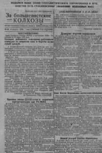 t - П О Д Ы М Е М В Ы Ш Е З Н А М Я С О Ц И А Л И С Т И Ч Е С К О Г О С О Р Е В Н О В А Н И Я И Я Р Ч Е О С В Е Т И М П Я Ь С Т А Х А Н О В С К О М У Д В И Ж Е Н И Ю К О Л Х О З Н Ы Х М А С С П р о л е т а р и и п с с х с т р а н , соединийтесь | З а больш еви ст ски е = К О Л Х О З Ы = О Р Г А Н - С Е В Е Р Н О Г О Р А Й К О М А В К П ( б ) и Р А Й И С П О Л К О М А З С К № 4 3 14 м а р т а 1936 года. | П Е Р В Ы Й Г О Д И З Д А Н И Я П О С Т А Н О В Л Е Н И Е Б ю р о С е в е р н о г о Райкома В К П ( б ) и президиума Р И К а Зап с н б к р а я от 12 марта 1936 года. О с о зы в е районного совещания работников к о л хо зов по вопросам сева и борьбы за вы сокий урожай. 1. С о з в а т ь -р а й о н н о е совещание пред, к о лхо з ов , пред, с - с . , бригадиров полеводческих н тракторных бригад, звеноводоа и стахановцев к олхозов на 5 апреля 193б г., вызвав на слет 400 ч. 2. На это же совещание вызвать работников к о л х о з ов , ра ботающих в льноводческих звеньях, в составе 50ч., с кото рымн на совещании провести секционную работу по п о се в у и о б р а б о т к е льна. 3. О б я з а т ь парторгов, коумуни стов -однн очек , с-совет ов н пра вления колхозов провести большую подготовительную рабо ту , и на районное совещание выдвинуть лучших, действнтель но на практике сева прошлого года и подготовке к севу 1936 года, показавших вы со к ую производительность труда. В целях лучшей подготовки к севу и к районному совещанию во в сех колхозах провести общие собрания колхозников с п р о г а б о т кой обращения Крайкома В К П ( б ) и Крайисполкома о подго товке к севу и б о рь б е за высокий ур ож ай , а так же с 25 мар та провести при с -с о ве т а х совещания лучших стахановцев работников ю л е в и с т в а и льноводства. Поддержать инициативу ряда колхозов „6 -о й с ъ е з д с о в е т о в " . У д а р н и к 4 и других по проведению в колхозах ста хановской пятидневки и обязать парторгов, председателей е - с о в о т о в н пр едк отхо зов организовать и провести Стаханов с к у ю пятидневку с 29 по 25 марта; обеспечить тщательную п о д г ото в ку людей н объектов работ к стахановской пятил иевке н добиться рекордных высоких норм выработок, посы лая лучших стахановцев, показавших с в о ю о браз цов ую рабо т у на созываемое районное совещание. С е к р е т а р ь С е в е р н о г о Р К В К П ( б ) М А Т Р О С О В З а Председателя Р И К а К О Р О Т А Е В З А П С И Б К Р А Й К О М Т. Р. И. Э Й Х Е * * * * М ы , пробывшие в Северный район председатели К о л х о з и бригадиры, и собравшиеся стахановцы к о л х о з о в с еверн о района, шлем вам, инициатору'освоения С е в е р а Западной С и рн- пламенный большевистский привет и обещаем в кратч шнй с р о к , нашей большевистской работой, добиться ре зк о подъема в работе к о л х о з о в и весенний сев провести образ] во. В установленный с рок и добиться урожайности не мены 100 пудов зерна с га-. Президиум совещания Доверие партии оправдаем Причины смены р у к о в о д с т в а 'в первичной парторганизации при Р 0 . Н К В Д ве П л о > п ч рш и * з г ыо в . у б о п л а ь р ш т е и в и и к и а ин За и п ц а и д а н т о и - С и б и р с к о г о к р а я . Р О Б Е Р Т А И Н - Д Р И К О В И Н А Э Й Х Е , мы приехали д о б р о в о л ь н о в С е в е р н ы й рн*он на п остоянн ую р а б о т у в коъх бэы из’ передовых районов З г п а д Д о— С и б и р с к о г о кра я . Н ам х о р о ш о н з з е с т и о , что мы жпр е и лы е х й а л у и ч а н с а т о б к о л с е о е ц и с а л л о и ж с н т ыи ч й е с и к о т г я о с т р о и т е л ь с т в а по о с в о е н и ю с е в е р а , но мы с ч а ст л и вы т е м , что нам пар тия н наше р о д н о е п