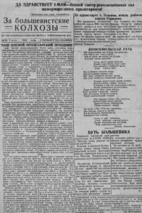 Д А З Д Р А В С Т В У Е Т 1 - М А Я — б о е в о й с м о т р р е в о л ю ц и о н н ы х сил м е ж д у н а р о д н о г о п р о л е т а р и а т а ! Пролетарии всех стран соеденяйтесь За большевистские К О Л Х О З Ы — й ? Г А Н С Е В Е Р Н О Г О Р А Й К О М А В КП (б ) и Р А Й И С П О Л К О М А З С К № 50 1 м \ я 1935 го д а . . | П Е Р В Ы Г О Д И З Д А Н И Я Н А Ш Б О Е В О Й П Р О Л Е Т А Р С К И Й П Р А З Д Н И К Свой боезой меж д ун ар од ны й ! Р а ст е т новое, счастливое, безре революционный пролетарский праз дник 1-ое Мая рабочие, крестьяне н т т ин в ч о с е е с п к о т о д р й у з д с н я т а щр м а и е н н е ыа ся м в и с н т а в р ш е е е л ч й и а кю с о о т й ци р В а а с л д е и о с с с о юз ной коммунистической партии большевиков и вождя народов то 1 вариша Сталина. Создание расту щей с каждым годом, с каждым дчем несокрушимой силы Совет с р к е о Жн г н о и о в с с е т о м ь ю м з в а ы за с в в о е т з с р д е а а л ше о т н с е е т м г в о е д д р н н д е я у . ю , у в е А завтра будем веселей. Э г о чувствуют теперь многие из т е х , кто еще недавно не верил в п об еду в ел ик ою дела пролетар ской революции в победу коммуии зма. Пере житый нами год показал еще более ярко, чем прежде, кз- б к у н д е и о л г а ро п м р н о ыл е ет с а и р л с ыкая в на р р е о в д ол е юц р и а я з. Какое дело ни взять,— у нас есть огромный рост, огромный шаг впе ре Нд. аша промышленность стала пе редовой. П о д руководством свое го железного наркома тов . Кагано внча полнокровпо стал работать транспорт . Наша счастливая соци алнстическая родина совершенно не знает страшного бича безрабо тицы, под тяжким ударом которо го стонет и погибает рабочий н крестьянин капиталистических стран. А завтрашний из п д е н ь - день еще более могучего роста и расцвета нашей социалистической промышленности и транспорта, нашего колхозного и совхозного Сельского хозяйства. Замечательное движение наших дней—стаханозское , д виж ение— становится движением миллионных « а с е . Приемы работы, иормы вира лигнозное поколение молодежи, не знзющей капиталистической эксплуотацни, не знающей безрл ботицы, не скованной цепями рели л гн а и п и оч н ет ев н е о же ес м т е в с а т . о Ж н ен вщи с н е а льс з к ан омя Хозяйстве, и в п ромышленности , н в управлении государством , н в де ле* культурной работы. Н о мы не можем забыгь-и в день т l и oe ш Мес а т я ых в о з с е о м б н е о н г н о ос шт а и р ,- а ч го хо н з а яе п в я а ми еще являются капиталисты, а в н ся е ч к и от н о а р шы и х х с б т р р а а т н ь а е х в —ф п а о шдв и е с р т г ы а . ю Т т ы ся к м ш и у н х ч ' и с т е т юр ел д р ь ц ь с а м т а в х а с . м ег Н о а в д шн к и я ап п с и о т м н а ыи л с м и л и с ы ! т , ич Мн е ы а с - шлем им наш боевой пролетарский привет. Мы особенно шлем привет героической Красной армии К и т а я . Мы шлем привет псему мирозому пролетариату, трудящимся всего л м ы ира. Мы говорим им, что все с и 0ГД1ДИМ д ы победы мировой революции. П у с т ь , глядя на нашу стран у, изучая путь пашей борьбы и наших побед, они убеждаются , что нет иного пути для о с в о б ож денкч трудящ ихся , как пролетар ская революция и пролетарская дик татура. П у с т ь они укрепляют н расширяют единый фронт всех тру л д х и а я Мз х щм ы и н о х м н с н я е е и д з з ф а а л б з я а н ы ш а в и п е а з м о е м б с м е о я д м о ы в . б н н а о а ш п д и а с х к н а о п у с и с т т п я а е х. Неизменно осуществляя политику дм а и м ра и по го о с т у н д о а шр с е т н в и а ю м , ко на в шсе е м п н р а а р в о и л т ю ел ч ь и с л т о во до с го р в я о д 