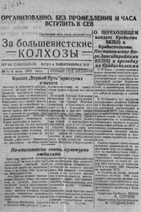О Р Г А Н И З О В А Н Н О , Б Е З П Р О М Е Д Л Е Н И Я И Ч А С А , £ ‘ В С Т У П И Т Ь В С Е В V Пролетария s e c t стран с о е д е я а й т е с ь За большевистские = К О Л Х Л З Ы = О Р Г А Н С Е В Е Р Н О Г О Р К ВКП(б ) и Р А Й И С П О Л К О М А З С К № 51 6 м а я 1936 г о д а . | П Е Р В Ы Й Г О Д И З Д А Н И Я К о л х о з „Верны й П у т ь " приступил к п ахоте З а с и я т ь и заборонить к аж дый п о л н о с т ь ю с т а н ы , у ч а с т о к по мера е г о о с в о б о ж д е н и я из под снега я п р о с ы х а н н я _ е с . т ь одна из в а ж н е й ш и х и ответственнейш их задач с е в а . В ы п о л н и т ь з т э — значит о б е с п е д ч н а ч т ь б о о р д ь н б ы у з и а з в г ыла с в ок н и е й йш у и р х о ж з а а й , з н а ч и т начать сев т —С т а х а н о в С К И С а а р о о Л ж е о , * £ о а д ы ^ К О Л х о з .В е р н ы й путь* Б о л ь ш е К у л и к о в с к о г о с е л ь с о в е т а с 3 м а я п р и с т у п и л к п а х о т е . Н е с м о т р я на т о , что к о л х о зы п р и с т у п а ю т к севу, есть е щ е , к с о ж а л е н и ю , такие к о л хо зы , ко т о п ы е подготовку к с е в у не за р е р ш <ли до копна К о л х о з . Л у ч езета* Б иа зи н с ко г о с е л ь с о в е т а не о б о р у д о в а л нс вывез в станы семена и ф ураж для лоша д е В р о . второй бригаде бригадира Васнльцоаа не подготовлены л ю ^ и , . так пзхари Морозов Александр и Крестьянов всту иают в сев с кулацкими на— строениями , у них нет у в е р е н ноет и в т р и , ч то ^ « н МОГУТ в ы1Н',«гт«т*. е ж е д н е в н у ю н о р м у пахоты. Они сочиняют разлнч п у е теории о невозможности завершения сева в 10— 12 дней. Парторг Ш л я к о в . пред кол хоза Л у н е в и бригадир Василь цов вместе со стахановцами колхоза ае дали сокрушитель иого отпора кулацким настро ениям М ф о з о в а и Крестьяновг. По-стахановски сеять> к ул ьт у р н о отдыхать Б р и г а д и р передовой бригады к о л х о з а . 6 ой с ъ е з д с о в е т о в “ П р и е м н и к о в Григорий всей б р и г а д о й выехал на» колхозные пол я и до началз сева к у л ь т у р но оборудовал с т а н . д я Э щ т е а е б К р р и а г с а н д о а е д з е н р а ж м и я т к п ол е х р о е з х н о и к о в , за лучшую п о д г о т о в к у т я гл о в ой силы и с е л ь х о з и н в е н т а р я к с е в у . П р и к у л ь т у р н о м с т а н е имеется п а т е ф о н , стены в н у т р и помещения у к р аш е ны л о з у н г а м и , плакатами и п о р т р е та Б м р и и . г а д а о б е с п е ч е н а газетами V и м е е т с я б и б л и о т е к а с х у д о ж е с т р е й н о » и с е л ь с к о х о з я й с т в е н ной литературой . П р и к у л ь т с т а - не оборудовано о б щ е ж и т и е с т о п ч а н а м и на к а ж д о г о к о л х о з ника. Д л я ю ш а д е й построены дворы, а Дя конюхов вы стро ена о т д е л ь н а к ом н а т а , д о с т р а и вает ся навес иод с е л ь х о з машины, вш оп ан к о л о д е ц , е с т ь о тд ел ьн ая к у х н я , с т о л о в а я , баня . Колхо зни к ; этой бригады взяли на с е б я о б з а т е л ь с т ь о р аб о т а т ь п о— с т а х а н в е к и ; им о б е с п е ч е н единый и к у л ь т у р н ы й о тд ы х по сл е рЗ‘3(гц. ‘ О р к о в . • * ч О П Е Р Е Х О Д Я Щ Е М мандате К р а й к о м а ВКП(б) и К р ай и сп ол к ом а . П о с т а н о в л е н и е б ю р о Запсибкрайком В К П ( б ) и м а К р а й и с п о л к о м а \ . В связи с развертывапием в вн к о р в а а е ни со я ц ми е а жли д с у т т и р ч а е к с т к о о р г и о с с т о а р м е и и ре к х о о м д б я а щй и н й ерамм и анд у а с т тан Ков р и ай ть ко п м е а с и т Ков рай и ис к п о о м л б к а о й м н а ер д о л в я , т о р б а е к с т п о е р ч и н веющих стахановские показате ли работ ни тракторе н комбав не 2 . . Установить, что вручение п ереходящих мандатов Крайкф с м я а п и ар К т р и а й й н и о с й пол о к р о г м