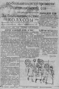 ^ 5Л э А__ Б О Л Ь Ш Е В И С Т С К м Е Развернута ра бота в , станах В порядке м а с с о в о—ио- ли ти че ск ой работы пар* тнйцо-кандидатскз« труп на при колхозе .Н о в ы й в С х о о и д з б о ч и в е р с я к к и * Н х -Е в б о л р и и в э г с а а е р д х о а в х с , п к к о о о л г л е о с е л ь с о в е т а , проработала следующее : б е с е д у тов. С Т А Л И Н А с Говардом, б е с е д у т. М О Л О Т О В А с редактором французской газеты Ш о ст е н а , о герои песком походе Красной армии Китая, о б р е т е н и е К и р сп ай ол ко к м ом а а п , арти п и ро и ве К д р ен айы к ч а и м тк и и : У на ша д к о о м в у ым с у В д . , а Г р е н р и а сиуовым и Семеновым о стахановском движения-* . г и иистановления оюро . В каждой бригаде выделен « ----- чтец , который будет проводить признавая хо д мясопоставок ---------------- совершенно неудовлетворнтель иым, и выполнение б в м ч ыр и я и т д г к е о а и л д т е д г н ы а п а з х о е а д т г о , а б р к ж р м о а у л о н р х н а н о и а з к л нл а о ии , в к т п , е о а р в в т о а , е т ф в д у о р р л н е а я , , ных заданий в апреле д п е к м а д ае балалайка. П о проведению полнтмассо- •ой работы в бригадах включи л и с ь и школы. У чащ и е ся и учи теля не в ущ ер б своей работе а к к ам тив п н б о ри п г о ад м н о ыга м ют ред к к у о л л ь л т е у г р и н я и м стенгазет в проведении читок , выпуска газет и украшении культстанон. (из письма парторга Крайкома колхоза .Н о в ы й сибиряк* т о в . Королева). Тракторный парк Дни сева наступили, ко трак тора С е в е р н о й . М Т С еще не все готовы вступить в с е в . 2 трактора, полученные из С п а с кой М Т С требуют большого реыонта. В С п а с с к о й М Т С они в т ыа Б ш ы 1 л в фи ш е и и в з р й а к л а я с п . т и а т р а ш л и ьн й ого ме р х е а м н о и н к Пономаренко, под видом уком плектования новых тракторов недостающими частями, вывел из строя 2 трактора. Ь*подлито М Ы I мая в Н о в о с и б и р с к е . На трноуис тов. Гайлнт. (Командующий С и б В О ) , т о в . Э й х е и тов. Грядинскнй О Х О Д Е М Я С О П О С Т А В О К П О Р А Й О Н У И з пос л б С е в е р н о го района В К П ( б ) тративной ответственности. го Пв р и ед к у о п м р м е у д н и и т с ь то в в с е х од п и а н р о т ч о е р к об их ответствениости за даль иейгаее потворство с а б о т а ж а « веский элементам и обязать немедленно сдать ск от колхо зно-товарных ферм по плану, ор ганизовать коллективную н ж* дивндуальную с д а ч у скота кол холмиками и единоличниками с тем, чтобы план первого по*% лугодия выполнить не позднее 1-го июня. Принять через с с о веты взыскание к саботажнн кам. Секретарь Р К ВКП(б) М А Т Р О С О В О г в . редактор М Ц А П О В ~ ОБЪЯВЛ ЕНИ Е В колхозе им. Тельмана с 10 нюня 36 года будет пущена в эксплоата - цию эл ек тро -стан ция. Желающие иметь свет давайте заявки на у с - тановку электролампочек. Оплата авансом за т о ч к у 36 рте* / Правление колхоза им. Тельмана ы-цвх сорванными, бюро Райкома В К П (б ) постановляет: 1. З а срыв мясопоставок, ?а от с у т с т ви е оперативного р у к о водства ходом мясопоставок и за неумение использовать аппарат эаготскота у п р а в л я й т е му рай за го гско га т о в . Г у б и н у объявить строгий выговор. 2. Принять к сведению, что Рай исполкомом привлечены к ма тернальноА ответственности за срыв мясопоставок колхозы .О е о а в н а х п м * , „Челю скин ец * , » их руководители к админке не го то в к севу Вновь прибывшие трактора собраны в редительски : у мно гих из них моторы с задними мостами попали не на свои мес т В а н . овь прибывший механик тов. Коленко зат ян