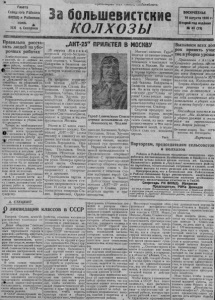 Г а з е т а ! ГрЬжтиуии, осей, ыпиип,, Уединяйтесь! к о к а . ЗСК с. С е е е р н с е Правильно расставить людей на у б о рочных раб о тах З а б о л ь ш е в и с т с к и е ВОСКРЕСЕНЬЕ 16 а в г у с т а 1936 г - кол хозы в т о р о й г о д издания 43 (7 3 ) „АНТ-25“ В МОСКВУ Хл еб о уб ор о чн ая кампания в разгаре, но с первых же дней работы в некоторых кол- х x о ^ з g о a в x Б р и ай аз о и н н а, ско о г с о об и ен Ч н е о бак к о о в л - * foro с -советов о т с у т ств у е т > ••»j-ш е вист ск ая организация з т б с е р п о у т о д „ а с Л а о ю б у т т н ч а ы т к с о х в н л е а ь т н п к а а о р * и 2 у и м 6 б з е о р ч 1 р , 1 е о 2 л в ч о н в к т о е р о й к л у , д х р о о а 5 косарей, 16 вязальщиков и 5 человек рвут лен, а остальные люди распределены на другие работы. Руководитель этого колхоза ноз. Л уш о в чрезмерно много «тправил людей в колхозно- товарные фермы—29 человек, в детяслн—6 человек и т. д. такое распределение рабочей силы ведет к ол хоз к тому , что п б л а Т а с н е р п ык е о р в с а ь о е в т ж и с е я ц . ы не и об у х б о о д р и к м а о к х о л л е х о з у добиться поголовного м к с т и я всего трудоспособ- Щ г о населения в у б о рк е , для м г э и т а х о л г ь о у н ч о у а г п с о т л к а со т о н к в р и з а т а щ ь е р с н ч а и е б я т оту в ма д к н р с и и у х колхозников и в свою очередь поставите дело так , чтобы все о т с а т т а ь вшна ие п с о я ле и вым х ог р у а щбо и т е ах ра и бо в колхозно-тсиярных ферма х , и с га т д о ыр о мж о а г , л ии с б т ырои от тел в ь р н емы е е ни бр д и о с в к р и е ммен б и ри п г о а мда о м га в ть у б п о о р л к е е в , о в д е ч д е я свое делд на отлично. В правильной расстановке людей, в умении вести мас10 авгу ста М о с к в а встречала г е р о е в -б е с т р аш - ных сы н ов великой с о в е т ск о й с т р а н ы - т . т. Ч к а л о в а , Б ай д ук о в а и Белякова с о в е р ш и в ш и е беспримерный в и сто ри и человечества п е р е л е т . На эр о д р ом е г е р о и ч е с кий э к и п а ж „ А Н Г — 2 5 “ вс тр еч аю т тов . Сталин , В о р о ш и л о в , О р д ж о н и к и д з е , Каганович,- Ч у б а р ь , П о с т ы - шев , Я г о д а , Х р у щ е в , р у ков оди тели М о с к о в с к и х партийных и с о в е т с к и х о р гани заций , в ы с ш и й к о м с о с т а в Р К К А виднейшие летчики С о в е т с к о г о С о ю з а , родные и др у зь я и тысячи т р у д я щ и х с я М о с к в ы . Р о в н о в 17 часов с а м о лет с о в е рш а е т п о с а д к у . К а к т о л ь к о „ А Н Т — 2 5 “ сделал п о с а д к у к с ам о л е ту на м а шин ах под 'е халн това рищ и С т а л и н , В о р о ш и л о в , О р д ж о н и к и д з е , К а га нович , Ч у б а р ь , П о с т ы ш е в , Я год а , Х р у щ е в . Ра до стн а я ветре-'' ча, Г е р о е в о б н и м аю т , ж н у т нм р у к и . П ион еры п р ип о д - н о с я т цветы. О т в а ж н ы е пилоты о б н и м аю т детей, з д о р о в а ю т с я с т о в а р и щ а ми и др у з ь я м и . Р у к о в о д и т е л и партии и Р Щ Ш Г е р о й Советского С о ю з а летчик испытатель о р деноносец т . Чкалов совово воспитательную рабо ♦ п р а в и т е л ь с т в а в м е с т е с ге т н р у о оч г с о нын в и х ы м п р и о а , л б з н а о л е т н о и жи я ен св у о о с б п е я в е з р х а е т м у е б л ен о ьс н у о д г а о р п ст л в ан у а . хлебопоставок гороями направляются к т р и б у н е . И когда на т р и б у н е появляю тся товарищи С т а лин, В о р о ш и л о в , О р д ж о никидзе, К аганович , Чу ба р ь - П о с т ы ш е в , Ягода , Х р у щ е в вместе с героями раздается горловая овация , несмолкающий гул п риветствии . Н ародны й к о м и с с а р тяжелой промышленности т. О р д ж о н и к и д з е открывает митинг. С приветственной речью вы с т уп а е т народный к о м и с с а 