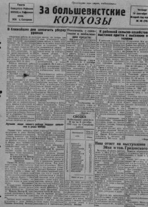 Газета Северного Райкома ВКП(б) и Райисполкома. ВСК с. Северное П р о л ет а р и и в с е х ст р а н , соединяйтесь! За большевистские колхозы Ч е т в е р г 10 сен тябр я В то р о й г о д над № 48 (78) В ближ айш и е дни закончи ть у б о р к у у р о ж а я У борочны е работы по колх озам и единоличному сек т ор у идут преступно медленными темпами. З а первую пятндне в н к у у с с к е о н штя е б н р о я то п л о ьк вс о е н м а у 13 р 0 ай г о а. б о л ьш е чем в преды дущ ую , по М Т С у величение , за это ж е время выразилось на 236 г а . План косовицы по всему н р е а н йо т н о у ль н к а о 5 в с 5 ен 5, т 8 яб п р р я оц в ., ы а по п л о колхозам М Т С 55 проц. Р айо н в мас со а ую работу п о у б о р к е у рож ая вступил с 15 августа и за 20 дней убрал то л ь к о половину у р о ж а я . Т а к , н апример , колхозы „ П р а в д а “ л и ед „ н К юра ю сны н й я т п и а д р н т в а Щ^ и р Г ^ д к а о с п и о л с и 1—5 га . М едли т ельн ость в у б о р к е хл е б о в ничем н н о и с т т ь ьюк а , к ро т т о о л з ь е к й о с н т е в б л о е ь м з зя д и ея о б т б л е л а л г е ь о душ и ем руководителей колхо з о в , сел ь со в е то в и М Т С , нс с у м е в ш и е с я с первых ж е дней у б о р к и загрузить на 100 проц. мощность с с л ь х о з . машин. ди П те о л п е ы й тк с и осл н а е т к ь о с т я ры н х а р т у о к , о ч в т о о хл е б а еш е не созрели опроки нуты опытом и практикой пе р едо вы х колхозов С е в ер ны х районов, которые к 5 сентя^ ря закончили косовицу хлебов п олн остью ( „ С м е р т ь капитал- л а “ и „У к р а и н е ц “ О ст а нн н ск о го с -со в ет а и д р у ги е ) . Н е к о то р ы е .в начале у б о р к и , х о т ел и со сл а т ь ся на д о ж д л и вую п о г о д у , но теперь уж е 15 дней установилась ясная, в т и еп ц лы ая не п н о а го мда н , ог а о т П ем ов п ыы си к л о и с с о ь д м а и С ж к п е и я р т п д и о о д в н с а е р н в а к и в а е н м е и и ни у о юб б о , м р о к л п и о е . г рв п ы о темпам ничем не отличается от темпов у б о р к и . Во н в а сех мед з л в и е т н е ь л я ь х нос р т а ь б , от у ы сп о в к и о д е ниость , благодушие как руководителей, а также Покончить с с а м о теком в мобилизации сред с т в Д л я выполнения поставлен* т н к е и ы л я х ь з с с а т о д в ц а а и ч , ал в д и л с д я т е и л ч е фес и р к н а о з а г в н о е с р н с т т о ы р о о в в и а а - л н и и з я ац с о и ц я . с с р т е р д о с и т т в ел н ь а с с т е в л а е . н Мия о б ~ и а- К районной с е л ь с к о -х о з я й с тв е вы ста в ке п р и тти с вы со ки м и п „ те л я м и К районной сельх озвы ста в - 61 п о р о сен о к . Э т и ко Í П О W U i i A r n A n^n» « » . . ________ ______ з к ые п н о и ж х и фво е т р нм о ы во д д о с л т жв у ны к о п л р х н о т - ги с высокими показателями по сохра н е нию молодняка и всего поголовья с к о т а , с вы u * urwx\v “ *vwm na | ССНТИОрЯ w колхозников. Н а б сентябре выполнен лишь на J 9 .5 п» „ П О П ' 1 Д л и и _ _ _ _ _ _ _ _ _ _ _ _ _ _ _ _Л_ _ . **" * * И ' “ V по району заскирдовано толь ко 10 95 га. из кошенных 12553 г а . и о бм олочен о всего 2274 га. М е д л и т е л ь н о с т ь работы в уборке и м олотьбе сказалась н в а у. о Н т а г р 5 у з к с е ен х т л я е б б р а я г о п с у л д ан а р с п т о хл е б осд а че выполнен только на 10 п р . , в х л е б о с д а ч е сказа с л т а ь сь , н н е о то и ль п к р о ям м о е й дли с т а е б л о ь т н ажо л о х т о д з е о л в ьн иы м х . К р а у г к а о н в о о в д и и ч т а е , ле „Уй д к а о р ник“ , по которым были вынес н ен и ыя пр с е о з о и т д в и е у т м с т а в Р у юИ щК а и е и р б е юш р е о Р К В К П ( б ) . Задачей партийных и беспар н ти о й го ны р х ай б о о н л а ь , ш д е о в л и ж к н о о в , ст С а е ть в е д р е лом ч е с т и —э т о завершение в ближ айш