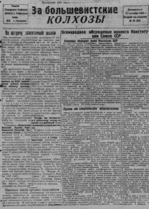 Пролетарии всех стрип, l/l/L'V/»VI Газета Северного Райнома ВКП(б) и Райиспол- v кома. ЗСК с. Северное За большевистские К О Л Х О З Ы Воскресенье 11 октября 1935 г. Второй год издания Jfi 55 (85) На встреуч зажитчоной жзини М ы , к о л х о з н и к и и кол-1 гр и в е , на площади 67 гек - х о э н и ц Ц к о л х о з а „ В е р н ы й | т а р о в мы получили у р о - ;уть“ 8 о к т я б р я на общем бг ш к к и о а л л х и х о з в н х о о л п м е р б о а с с о р о о а б т ни и у и р з о о л б ж и с а ш у я д 1 а 9 т 3 ь 6 год п а о т и р е р б е к ш о и о л п и е р а п ц р и о и 800 ц е т н . зерн а и на вто р о й день, 9 о к т я б ря у ж е сдали 8 центн. 70 княогр . на з ц а и . л М и и с . ы к с ь л а е д з д а ы и н т о п о д о , у т ш ч р т е н о б о б к ы о в о ы п е к с р к 2 а а 0 октября в е сь проданный Улеб о т г р у з и т ь в склады п о т р е б к о о п е р а ц и и и обра щаемся ко всём колхозникам района последов а т ь нашему примеру. Н а ш к о л х о з 20 сентября р а сс ч и т ал с я п ол н о с т ью г 1 го с у д а р с т в о м п ост ав кам , семе п н о ной х л е с б е о у д е и н атуроплате М Т С . * 5 октября р а сс ч и т ал с я с г о с у д а р с т в о м п о к а р т о ф е л ю , на $ октяб ря засып ано с ем е н н о г о фо нда пшеницы 400 центн. Н ли а 6 о о в к а н тя с с б ыря м и ы з п р о а л сч у е ч т и а ж ай ов са по 10 ц ен тн . с г а , а в прошлом г о д у н г э т о й - ж е гриве и с э т ой площади при лошадиной и ручной о б р а б о т к и был о с о б р а н о т ол ь ко 5 ,5 центн, с 1 га. М ы в 1935 г о д у сдавали г о с у д а р с т в у по е б я з а т е л ь ным х л е б о п о с т а в к ам ‘ от у р о ж а й с 1 га 1 ц. 70 к г . , а но в ва т н е и к и ущ ем п о г с о т д а у н , о н в а л ен о и с я п р ави те ль ст ва , сдали толь к о 1 центн. с 1 г а . Кроме э т о г о постановлением С о в наркома С о ю з а С С Р и Ц К В К П ( б ) о т 11 февраля 1930 года повышены з а г о томительные цены на пше н и ц у на 1 р у б . 20 к оп . П о в ы ш е н и е цен на х л е б , с н н ы и м же п н о и с е т ^ ав п к о ам , о в б се я з э а т т и е л м ь е роприятия направлены на ул у чш е н и е материального В сен ародн ое о б с уж д е н и е про е к та Конститу ции Союза ССР Стахановцы обсуждают проект Конституции СССР Н а днях 15 человек с т а х а п | в и т ь : „ п р е д о с т а в и т ь п р а в о овцев к о л х о з а „Н о в ы й п у т ь * к а ж д о м у г р а ж д а н и н у С С С Р со брались на квартиру Аид ро п р е с т у п н и к а , п о й м а н н о г о на н ов ой А л е к с а н д р ы л у ч ш е й ста хано вки и з а м а ш к о й ч а я о бсудили раздел X пр о е к т а К о н с т и т у ц и и С С С Р . В се п р и с у т с т в у ю щ и е с т а х а яо вцы высказались активно но кажд ой статье э т о г о раздела и вносили свои д о полнения , т а к , например , в се присутств у ю щ ч е вы ска зали сь за т о , чтобы в статью 119 ю после с л о в :« . . .у с т а н о в л е н и е м еж е го д н и х о т п у с к о в рабочим и с л у ж ащ им с сохранени ем зарабо тной п л а т ы . . . “ с л е д о в а л о —бы дополнить :, , а т а к ж е и кол- о з н н к а м п я т н а д ц а т и д н е в н о г о о т п у с к а с с о х р а н е н и е м с р е д н н е и г . о . . “ з и а в р а с б о о о т т к в а ет с н т а вии т р с у э д т о и д м после с п>в:„.. предоставлением для об сл уж ив ания т р у д я щ и х с я широкой сети еанториев, домов о т д ы х а , к л у б о в “ д о п о лнить: . . . . В к о л х о з а х с о з д а т ь ф о н д ы на с о д е р ж а н и е д о м о в о т д ы х а , ку рог т и с а н а т о р и и * . В к о н ц е с т а т ь и 127 д о б а м е с т е п р е с т у п л е н и я з ад ер ж и в а т ь и н а п р а в л я т ь в с о о т в е т е т в у ю щ н е о р г а н ы с о в е т с к о й в л а с т и * . зал Д и а с л ь ь ш за е т с о т , ах ч а т н об о ывцыв Х в - юы г ск л а а ву „Основные п р 'ф * и обя