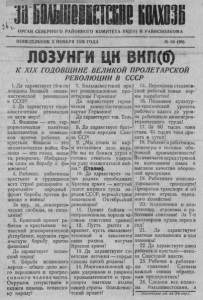 3 ® v ОРГАН СЕВЕРНОГО РАЙОННОГО КОМИТЕТА В 1 ф ( б ) И РАЙИСПОЛКОМА ПОНЕДЕЛЬНИК 2 НОЯБРЯ 1936 ГОДА № 60 (90) ЛОЗУНГИ ЦК ВКП(б) К X I X ГОДОВЩИНЕ ВЕЛИ К ОЙ П Р О Л Е Т А Р С К О Й РЕВОЛЮЦИИ В СССР 1 . Да здравствует 19-я го довщина Великой социалистической революции в СССР! 2. Да здравствует социалистическая революция . во всем мире! 3. Фашизм — это т е р рористическая политика капиталистов и помещиков против рабочих и крестьян. Фашизм — это захватническая война. Фашизм — это голод, нищи та, резорение, Мобилизуем силы на борьбу с фашизмом! 4. Рабочие, работницы крестьяне и трудящиеся всех стран! расширяйте и укрепляйте народный фронт борьбы против фашизма и войны! За мир, за демократические свободы, за с о ц и ализм! 5. Братский привет р а бочим и крестьянам испанской демократической республики, ведущим геро ическую борьбу против фашизма! Да здравствует испанский народ! 6. Борьба испанского народа— общее дело в с е го передового и прогрес- с и в н о г о ч е л о в е ч е с т в а . Окружим сочувствием и окажем помощь испанскому народу! 7. Большевистский при вет революционным пролетариям Германии! Д а здравствует героическая коммунистическая партия Германии! Да здравствует тов. Тель ман! 8. Да здравствует братский союз народов Союз а ССР! 9. „Мы стоим за мир- и отстаиваем дело мира. Но мы не боимся у г р о з и готовы ответить ударом на удар поджигателей вой ны." (Сталин). 10. Да здравствует наша родная, непобедимая Красная армия — могучий оплот мирного труда народов СССР, верный страж заваеваннй Октябрьской революции! П . Привет бойцам — пограничникам, зорким часовым советских границ! , 12. Пусть растет и крепнет, пусть овладевает техникой и закаляется наша родная, могучая Красная армия! 13. Да здравствуют советские летчики — гордые соколы нашей родины! 14. Многомилионной армии ударников и ударниц промышленности и транспорта знатным людям нашей страны большевистский привет! 13. Перекроем стахановской работой новые нор-' мы выработки! 16. Поднимем культурно-технический уровень рабочего класса до уровня работников инженерно- технического труда! 17. За 60 тысяч тонн стали, 43 тысяч тонн п р о ката в сутки! 18. Рабочие и работницы, инженеры и техники о б о ронной промышленности! Вы отвечаете перед страной за выполнение плана и высокое качество оборонной продукции. 19. Работники железнодорожного транспорта! Превратим транспорт в об разцовую отрасль народного хозяйства! 20. Колхозники и колхозницы, агрономы и работники совхозов! За 7-8 миллиардов пудов зерна в год! 21. Да здравствуют знатные колхозники и кол хозницы! 22. Да здравствует союз рабочих и крестьян—основа Советской власти. 23. Рабочие и рабо тни цы совхозов! Сделаем каждый совхоз образцо вым предприятием! 24. Сделаем все к о л х о зы большевистскими, а (О к о н ч а н и е см. на 2-й стр.)