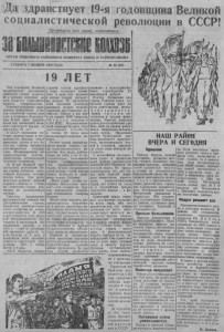 Да здравствует 19-я годовщина Великой социалистической революции в СССР! Пролетарии всех стран{ соединяйтесь: О Р Г А Н С Е В Е Р Н О Г О Р А Й О Н Н О Г О К О М И Т Е Т А Е К П ( б ) И Р А Й И С П О Л К О М А С У Б Б О Т А 7 Н О Я Б Р Я 1936 Г О Д А № G1 (91) 19 Л Е Т 19-ю годовщину Великой п р о л е т а р с к о й революции с е о т в е с т н с к о а вы я м с и т р а у н с п а е х а в м с т и р е ч в а о ч в ж е с е З е с н х к а и м о е о г е м о б ч л а в т а е е с л т л с и я ь т х ч н р а е о й й с и шш о т ц и и е и х л м а ь л с в у и т ы с с в п т р а и е . а ц л х о и а в с я ь . с В с о т в а е п л т е и й с к н о с я к й р а я к ст о р К а о н п н ы о с д т . ыи яв т т и у о жко е г н о ы с о в в се е т з с к ав о о г о ева н н а и р я од в а ел з и а ми н у вш и е 19 л е т . б п е о д В в и о л С р о С о т С к н Р о о н . ч с З а о а т ц в е и о л а д ь л ын и о , зм и зе б м п е л о с я ж г а е т л с е т з в н а ы е ст д р о а р н о ы ги и я в в л с я е ю т б с о я с о б ств е нн ос тью с т в а . Л и к видиро в а г н о ы с у д а э р к - с н л о а т а т о р с к и е к л а с с ы , у н и ч т о ж е н а э к с п л о а т а ц н я ч е л о в е к а ч е л о в е к о м . л ч ш а е а й З т а а ш с р т и с 1 р х к 9 а о н й л в а е се т д м р о е В и б в е р и о л н л л и о а ю к с о ц ь й и и и с т в о п е р л р н и и о ав ч о е д с к с т и в х о м п о б ве е л д и . ки П х оо. в о р ж у д к е о й н н н я а а р л—о а с д с о ь о в в е —т н с Л а к е а н я и н н е с а д тр о и а с я н г а С а т е м а п л у о и ю д в ы с о т у . Т я ж е л а я н д о у с с т т ь р и я а в л л и я з е а т ц с и я и п о р с о н м ов ы с о т шй р а л н и е ын н , п л с к е и о р с г е т о д и е ч х л е о к с з к и я и й й с м т л е в л а а к д о . н к а р В е с с о т ц ь 19 я и 1 н а 3 г о ц у * с т о и п о с т ь всей к р у п - н т а > в й ля п л р а ом 6 ы мш и л л е л н и н а о р с д т о и в с 8 о 2 с 0 миллионов р у б л е й , а в 1935 г. — у ж е 41 миллиард 633 миллиона р у б л е й , то е с т ь больше в 6 р а з , а л д п е у р н к о ц н д и о у ю с к т ц - и и я п е 1 р э 9 т е 1 о в 3 й е с и г п . л р а о т м а п ы к р ж ш о е почти в 6 раз. С С С Р я в л я е т с я т е п е р ь страной са м о г о к р у п н о г о с в т в м а и . р А е в с е е д л ь ь с е к ш о е г о н е х д о а з в я н й о в к и н , а б ч о а л л ь е ш п е ер 9 в 7 ой пр п о я ц т е и н л т е о т в всей п осе вной п л ощ а д и д з з а я у н а й и л с м ь т н в а а л ы . и е С к е м р й е е ч л с а к т с и ь я е у н с н и к а н и с д е и и х в м о и е е т с я свы ш е 5000 с о в х о з о в , 230 т ы с я ч к о л х о зо в и 4 ц . и 4 е 0 й 0 о Мх в Т а С ч . е н о К о 90 л л п е р к о т ц и . в в и с з е а х к р е с т ь я н с к и х х о з я й с т в и с в ы ш е 95 п р о ц . в с е х к се о в л Р о х а в о с . т з н е т о - к с р ам е с ы т й ь я ц н е с н к н и ы х й к п а о д п щю и и щ е т с и а с т л е о в ц а н н и . а а а Э ш л т с е и и е й с б т я л и , ю с ч т а е д р с и к н а , о н е р г ы о а н — б а о л о э т ю к б а - с п л о а т а т о р о в , показывают ч у д е с а с т и , п рои и з з в о о б д р и е т т е а л т ь е н л о ь с н т о и т р у д а , ч у д е с а п ред анн ости своей родине , с в о ей партии с м в о о „ мЖ е у м и у в т о ь ж в е с д л т ю а и л к С о о т м а у л л и у и ч н шу . л е ю т б о и л н в во и а е м р и е и “ —щ с в т и т с а . а е х к с а Ж о н ю г и о о з т в в н ь ц о о е р м с в и т л а л т н с о о а о в в а в е р п е щ и е с р щ а е С т а л и н . Жить- с т а л о в е с е л е е , ибо ликвидирована т ц е а ри и ал р ь а н с т о е е т б н л а е у г о к б с л е о о з с н р т н а о о б я о н м т и и а е м а с с . О с у щ е с т в л е н ы права с о в е т с к и х г р аж д ан на т р у д , на о т д ы х , на м ат ер и а л ьн о е о б е с п е ч е н и е в с т а р о с т и , в с л у ч а е болезни и потери т ч р ен у д о о п с п р о ав с о о б н н а о с о т б и р , а зо о в б а е н с п и е е . П арт и е й и ством прод ел ан а п р о а