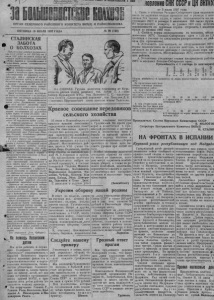 Пролетарии v i и и з да т ел ь ств ЭКЗ ОРГАН СЕВЕРНОГО РАЙОННОГО КОМИТЕТА ВКП(б) И РАЙИСПОЛКОМА ПЯТНИЦА 36 ИЮЛЯ 1937 ГОДА № 39 (140) ■УСТАЛИНСКАЯ ЗАБОТА О КОЛХОЗАХ П убликуемое сегодня постановление СПИ С С С Р и ЦК ВКП(б) от 5 июля 1937 года являет ся новым я р чайшим свидетельством неустанной р а б о т ы партии и правительства о ■дальнейшем росте зажиточности колхозников. ^ДЬпчм постановлением правитель- (Шш и Центрального Комитета партии с к о л х о з о в края снимается задолженность по зерновым ссудам прошлых лет в разм е ре 8 миллионов 774 тысячи пудов, а также за долженность по натуроплате МТС в разм ере 3 миллионов 200 тысяч пу дов. Одновременно с этим снижаются нормы зернопоставок и ставки натуроплаты работ МТС. Этим постановлением государств о дает ко л х о з н и к а м в их ра сп о р я жение для уве личения натуральной части огромные дополнительные массы зе рна. Достаточно сказать, #о одно т олько снижение норм нопоставок оставляет дополнительно в нынешнем го д у в ра сп о р я жении колх о зни ко в 9,5 миллионов пудов зерна. А всего согласно эт о г о постановления, в распоряжении к о л х о з о в и к ол хозни ков остается о ко л о 30 миллионов пудов х л еба . И странах капитала трудящеес я крестьянство изнемогает под тя жестью непосильных, разорит ель н ы х налогов . Ужасающая нищета крестьянских масс Германии, Италии, Польши, доведенных кровавым фашизмом до вымирания! В нашей стране колхозный строй с о з д а л цветущую, зажиточную жизнь в деревне. Колхозный строй Ф нашей стране победил оконча- ельно и бесповоротно. Он побе- пжесточенной борьбе с врагами, и прежде всего в борьбе с троцкистско-зиновьевскими и б у х а ринскими бандитами. Обязанность партийных и советских организаций заключав пся в том, чтобы ярко и широко раз 'чс- нить ко л х о зн и к а м это решение, наглядно, конкретно, с цифрами в р у к а х показат ь на примере к о л х о за , отдельного колхозника, что да ют льготы к о л х о з у и колхозникам , к а к о е это имеет цифровое выражение в д о х о д а х каждого ко л х о з а , стоимости трудодня колхозников. Ответом на сталинскую за бот у партии и правительства о к о л х о з а х и к о л х о з н и к а х должна быть немедленная ликвидация отставания в подготовке к у б о р к е , орган из о ванн а я раб от а в поле. Враги к о л х о з н о г о строя троц кистско-бухаринские подлые агенты фашизма будут пытаться вести подрывную работ у против организованного проведения уборки у р о ж а я , быстрого завершения х л е бопоставок. Всемерно повышая ре£ э в о л ю ц и о н н у ю бдитильность, беспо- Щуцадно выкорчевывая врагов народа, ликвидируя последствия вредительства, к о л х о з н о е крестьянство под рук оводством партийных организа ций добьется новых у с п е х о в в борь бе з а новые п о б е д ы к о л х о зн о г о НА СНИМКЕ: Г р у п п а делегатов совещания от Курь- инсксго района (слева направо) тов. Зубов Г. А . —комбайнер Курьинской МТС, тов. Левченко С. С .—председатель колхоза „Славгородский партизан“ , тов. Никулин Д. И. —звеновод Ефремовского звена колхоза имени Тельмана. мление СНКСССРиЦКBKIK6J от 5 июля 1937 год а 1. Снять с колхозов Западно-Сибирского края з адо лж ен ность по зерновым ссудам прошлых лет в размере 8 миллионов 774 тысячи пудов, а т а к ж е задолженность по натуроплате М'ГС в размере 3 миллионов 2оО тысяч пудов. Из подлежащего .во з вр а т у из урож ая 2937 года о с та тка задолженности по зерновым ссу