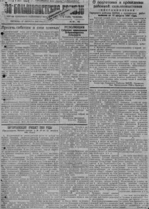 )cyaui_ i wuq | м и I. j* /. 1ipo.i'ebiapmi всех страц?соединяйтесь! * t : д Н О Р Г А Н С Е В Е Р Н О Г О Р А Й О Н Н О Г О КОЛ* _________________________________ * V f * H 9 * \ < \ K ^ ■. V H Р А Й И Ю Л К О М А t C J П Я Т Н И Ц А 27 А В Г У С Т А 1937 Г О Д л № 48 чЧ 9 ) .Пресечь с а б о т а ж в севе о з и м ы х1 ^ „С в о е в р е м е н н ы й посев ози- ^ юк Р о >щр х и д . х н я о в у г л о с я л е о у т в р с и о я йж о а д п я н о и л в м уч 1 и е 9 з н 38 и р я е го шр д е а у условием укрепления колхо- ' н зо о в го , у б л л у а ч г шос е о н с и т е о мяни мя а к т о е л р х и о а з л о ь в и к ш козни ков. Отдельные колхозы нашего н р п а е и й г л о о и на к се п э в о т а н о я й о л з и им ва ыз ж н х н ач е ии й н ш п и е р е й и р с р т ан а у боте . Колхоз им. Ворошилова посев озимых у ж е закончил с превышением плана на 13 проа. Колхозы «Украинец“ , «Единый п у т ь “ и „Красная звезда“ находятся на кануне окончания посева озимых. ощ н и Б а е , о с л я н ь е ш с в и м о н о з с м т т р о в я ж о н к о н о с а л т х и в о с з е о к в и т мо р е м а юй у , >ы провести своевремен- посев озимых (наличие н т д р н ы ые е о н п с х т и а д а ю х о с т а е о н м с э ч н и т я н о ы н с о й х г п о в о и п а р а ж т р к . н н о о е е в л л й , и .) ш н ч п а е е р к м с й и т о в с в л т ы а о р у п ч а п е п о б и н л о е ли. Колхозы «П. Денина* с „ е В я . л Пи у в т с ь е “ го на но 20 7 г а а в . гу а ст т а ак п и о е колхозы как „ 1 7 л е т О к т я б р я “ , „Я з г о -С а б а н “ и др. не посеяли ш^рдного га. венИ н с о к с л т ю ь чи и т п е о л л ь и н т о ич б е е с з к о у т ювет б с е т с ; т р к п е о а е к ч М э ж д т е и Т к л м т С о ь , п п и п о у р с с м е о т в я о и а в ж в л н о ш я о з юи и е м т о ы д б н х и ' а я . р с Т с е н а о к н мл т т о ь о ь х т о а з к ыое об п с о л л у о ж ж и е в н а и ем е, ые ко С г е д в а ер к н о о л й М Т С посеяли озимых 3,1 проп, в к ае п м л ыан е у Т , а а рт к а о с л с х к о о з й ы о Мб с Т л С у ж п и о- сеяли озимых только 2,3 проц . к плану, в то время как кол зозы не обслуживаемые М Т С посеял озимых 16,0 проц. к плану. ко Н го ел п ь о зя зор д н ал о ь ю ше п т о е л р о п ж е е т н ь ия та с посевом озимых, ведущего к я н ч в и о н - т п о е о л м л ь у и н т о п и - р в ч о а е в ж с а к н л о о у г г о о эт х о о м г з о е я р й и о с с п т к р в л и е юн я ти ■Д я и . ректора М Т С Поляков и Кда у т р е д л юи мо к в о , лх а оз т о а в к-жд е олжп н р ыедс д е о к н о о н ст ц ь а п з о а ня т т я ь ж в е с л ю ое от с в о е с т т с о т я в н е и н е с б н ыо п п о э р с т е и у в н о я р м т а ь б о о з м т и е у м р з ыыо х ко к и н т н ч о е и м м т у е ь , д п ч л о т е л о н ностью и в срок. За последние дни колхозы района резко снизили сдачу хлеба государству и снизили т н е о м о п з ы им у ыбо х р . к З и ат х я л ж е к б а о в ,о у с б о о б р е к н и жв н е е а д н я е и , т я к к о с б б р я о ыз л а в ь т шу е и л м ь с с р т п о в о к т о е в к р о я в л м ыхо п у з р о о л о в х п н о и е з рю н е и д д к о о г х в о о . с д у о д Н в а а р д к с о о т л во х п о м о з , к о о в к н с ч и н и и т к ж ь ол е с д д б у а е Д т зш о е и и т л р е в и е м е к т т с н к о т о а р в л а е у х н б о н о з М о о р с Т в к т С е ью д х о и л л и е ж п б б н р а л ые . а д г с д о е о конца понять всю ответстнен- ность за уборку хлеба и хло- б ви о т с д ь а с ч о у зд и ав н ш е е м е е с д я ле п н о н л о ожвыен п и р е а , мобилизовав всех колхозников на борьбу за уборку хлеба и хле босда чу в установленные ж ср е о н к и и е , к н у а ла р ц а к зг о р г о о м с и а бо у т н а и ж ч а то и политической беспечности. Р Е З О Л Ю Ц И Я С обрания призы вников В -К р а сн о яр ск о го с е л ь с о в е та Призывники В-Красноярско- го сельсовета на собрании допризывников о