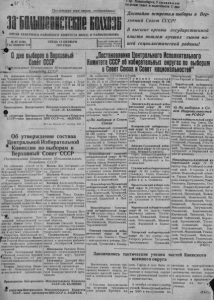 Пр ол ет а р и и в сех стран, соединяйтесь! ' "г- Новосибирск,Уп ра в ле н и и> ПОделам газет н издательств ! ^ О Р Г А Н С Е В Е Р Н О Г О Р А Й О Н Н О Г О К О М И Т Е Т А ВК П (б ) И Р А Й И С П О Л К О М А № 57 (158) Г о д издания 3-й С Р Е Д А 13 О К Т Я Б Р Я 1937 Г О Д А [Выходит один раз в [шестидневку Подпис н а я цена 30 к. в м-ц Д о с т о й н о встретим выборы в В е р ховный Совет С С С Р ! В высшие органы го с у д а р ст в е н н о й власти пошлем л у ч ш и х • сынов н а шей соц и али ст и ч еской р о д и н ы ! Одне выбороввВерховный Совет ССР П сфп ановление Центрального Исполнительного __ Комитет a Q C С Р ни Н я а Чре о з с в н ыов ч а а н й и н и ого по V ст IH ано с в ‘ л ез е - д л н а о ы ж й С е о н С в и о е я в т е о о т в С в и ыС с б С т о а Р р т а “ ь х и об в 7 В у 2 е с р „ х т П о а о в х н н о е о в е в н , л ые ч н й е и м и Со з д в а н е я т д в в С ы а С б С о мР р е о с в н я е ц в а п В о е з д д р о - срока выборов и в нерабо чий день ,Центральный И ;п о л - нительный Комитет С С С Р п ост ан о вл я е т : о к в а Нн 2 б ы . а р з й я 0 н 6 а С ‘ ч Г о я . и в в 3 т е и 7 ь т ть г в С о ы н С д а б С а ч о . Р а р л ы о н а в из ^ В б е и д р р е х а тельной кампании по •'ыбо- рам в Верховный С о в е т С С С Р 12 октября 1937 глда- „Постановления Центрального Испонлтиельоног КомитетаССРобизибаретльнхыокругах по выброма вСовет Союза иСовет нцаоинальонсетй“ Пр ед сед ат ел ь Ц ен тр ал ьн ог о И сп о л ни т е л ьн о г о К о м и т е т а С С С Р - М . К А Л И Н И Н . Í а с е к р е т а р я Ц е н т р а л ь н о г о И с п о л н и т е л ь н о г о Ком и т е т а С С С Р —член президиум а Ц И К С С С Р —А . А Н Д Р Е Е В . Мпвова, Кремль I J октября 1937 г. О б утверждении с о с т а в а Центральной Избирательной * Комиссии по выборам в Верховный С о в е т С С С Р На основании статей 34 и ?5 Конституции С С С Р и статей 21, 22, 23, и 24 „Положения о выборах в Верховный Совет С С С Р “ , Ц И К С С С Р И октября с-го д а постановил образовать 569 избирательных округов по выборам в С о в е т Союза и 574 избирательных округа по выборам в С о в е т Националь ностей. По Новосибирской области р о а б т р е а л з ь о н ва ы н е ы о с к л р е у д г у а ю : щие • изби а) П о выборам в Совет С о ю з а ский. Т о м с к и й с е л ь с к и й и збират ельный о к р у г № 188 (центр гор . Томск). Районы Ал ек санд ро в ский , Каргасок ский, Колпаш евский , Криво шсинский, Парабельский, Тымский, Чаинский, Осинов- ский и р. п. Колпашево . Венгеровский, Кыштовский У сть -Тар ский и Чанов ский . Н о в о с и б и р с к и й горо д ск ой избирательный о к р у г с №б и и б р и 1 с 8 к р 3 ) с . ка ( Р ц : а е йД н о з т н е р ыр — ж г г и о о н р р с о . к д и а Н й о , НК в о о а в г с а и о - новический и С ев ер о -Зап ад - часть Октябрьского в ная Постановление Центрального Исполнительного Комитета С С С Р границах до улицы I I шнтина. Н а основании статей 34 и 35 „Положения о выборах в Верховный Совет С С С Р “ Иен т м р и а т л У е ь т т н в ы е п р й о д с И и т с а т п н ь о о л в н л и Ц я т е е е н т л т ; ь р н а ы ль й н К у о ю избирательную комиссию по выборам в Верховный Совет С С С Р в составе следующих представителей ных организаций о и бщоб ес щ т е в с е т н в трудящихся: Председатель Центральной избирательной комиссии М о с - катов Петр Г еор ги евич—от всесоюзного центрального ю с т о р з в ( а о Я е л в т ш ь . а н . о п й р п о р ф и е з е д б с с и с е и р д о а а т н т е а е л л л ь ь я н н о ы й х Ц е с к н о о миссии Шмидт О т т о Юлье- в юлы и за ч и - р с т а н б а п о у р т ч о н н фи ык е х с о с в и у о ч в н ры а е с л жш ь д н е е й о н г и о шй С к . о обир С а е т к е р л