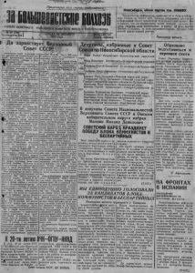 1 ,3а больш евистские колхозы" М К8Мб«П О с о з ы в е 1-ой с е с си и В ер х о в н о г о Совета СССР постановление п р е з и д и у м а Ц ент р ал ьно го Исполнительного Комитета СССР о ^ / ? ё еЗИАИум Н е в р а л ь н о г о Исполнительного Ком и тета С С С Р на основании статьи 53 Конституции С С С Р П О С Т А Н О В Л Я Е Т : С о з в а т ь 1-ю с е сс ию Верховного С о в е т а С о ю з а С о ветских Социалистических Республик 12 января 19 33 го да в городе Моснве. Председатель Центрального Исполнительного Комит е т а С С С Р - М . К А Л И Н И Н . С е к р е т а р ь Центрального Исполнительного К ом и те та . . и С С С Р - - А . Горкин . Москва, Кремль. 19 декабря 1937 года. Кулацкие д е л а кулака А с а н о в а Не так давно в нашем рай | оне разоблачена и уничтоже-í на контрреволюционная, п р а - ‘ во-троцкистская банда. Она, э та подлая, ничтожная кучка презренных бандитов вредила, пакостила и нанесла гро мадный ушерб нашим колхозам и колхозникам. Глав»ри ее позорно уничтожены, но у нас о с тал ас ь еще вражеские элементы, которые продолжают вредить в сельсоветах и колхозах. Председателем Иткульско- го сельсовета работает Аса- нов II. М. Это человек—проводник вредительских д е л уничтоженной банды. Он раз валил, разложит работу с е л ь ского совета. Ни одна секция при с ельсовете не работает. Политическая работа в массах о т су т с т в у е т . Голое администрирование, о к ри к—вот негодный, вражеский стиль ра боты Асанова. Он грубо нарушает революционную законность, производя Н1‘законные обыски, изъ я тие вещей, которые не подлежат из'ятию. Асанов продавал в поселке Павловка последние жилые постромки у трудящ и хся . В результате г руб о го администрирования, угроз судом, за три года из сельсовета выбыло 86 кол хозных хозяйств и 69 единоличных. ^ Кто такой Асанов П. М.? Е го о т е ц и он до революции и по сл е—имели крупное кулацкое эксплоататорское хо зяйство. Он в своем хозяйстве систематически держал и экеплоатировал батраков и сезонных рабочих. Отец Аса- нова служил сельским с т а р о стой в период колчаковщины и предавал революционно-настроенных граждан и партизан , которых колчаковцы пороли, бйли, расстреливали. Так, например, был расстрелян красный партизан Панфилов из деревни Ичкала. Тва дяди Асанова лишенные избирательных прав, как ку лаки. В 1929 году Асанов во вре мя чистки советского аппарата , как кулак, был вычищен с работы председателя Мало- Карагаевск >го сельсовета. После Асанов, работая д е с я т ником дорожного строи тельство, за срыв работы и вредительство был снят с работы, но з 1934 году он пробрался на работу прдседатели Иткульс кого сельсовета, где. также продолжал в р е д и т ь , пакостить. В 1935 году он п р и с в о и л и цен. 92 кг. кулацкого хлеба. В тридцать четвертом, пятом, шестом годах он кормил свой с к о т колхозным хлебом и с е ном, но никому ни за доставку, ни за сено и хлеб ничего не платил. Такой грязный, вредительский путь кулак« Асанова. Асанова сейчас райком ис ключил из партии, но такие Асановы у нас, очевидно, еще остались. П ар тий но -к ом со мольские и советские организации должны поднять рево люционную бдительность и вскрывать, р азоблачать врагов народа, как бы они ни маскировались. В. И. Ленин и V*. В. Сталин в Смольном НОВАЯ ПОЛЬСКАЯ ПРОВОКАЦИЯ НА ГРАНИЦЕ В РАЙКОМЕ ВНП(б) 15 декабря райком партии заслушал доклад парторга | Биазинской парторганизации тов. Иванникова о работе с 1 г р у п п о й сочувству