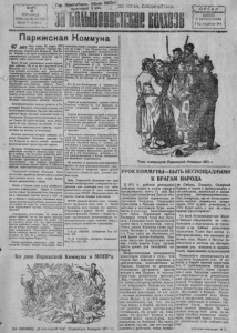М А Р Т ч 18 ) , ПЯТНИЦА ' >1933 год № 1 4 ( ! 8 4 ) « ¡ Ц е н а 5 к о п е е к Г о р . Н о в о с и б и р с к , О б к о м В К П ( б ) ^ С Т [ ) Д ^ С 0 В Д И Н Я Й Т Е С Ы О Р Г А Н ^ С е в е р н о г о р а й к о м а ВКП(б) и р а й и с п о л к о м а Год и з д а н и я 3 Í « / , и \ П ариж ская Коммуна £Ь*7 л р т Т0МУ назад 18 марта 1871 V * года, рабочие Парижа провозгааспаи Парижскую Коммуну. Это оы- "4 нерва« в истории международного р е волюционного движения попытка нроде- 'Пфяата ыаятъ власть в свои руки. Всего 72 дня уд ерживали власть п арижские рабочие. Но и за этот короткий срок Кликун а , как говорил В. И. Ленин, „ у с п е л а принять несколько мер, достаточно гарактернзующнх ее истинный смысл и «ели"*). Она заменила постоянную армию вооруженным народом, отделила церковь е е государства, реквизиров ала квартиры буржуазии для рабочих. Народу было предоставлено пр аво бесплатно обучаться в школах и университетах. Коммуна отменяла ночной т р у д в булочных, лишила полицию политических прав, издала декрет, пр которому предприятия, покинутые хозяевами, пе редавались рабочим артелям. Экепдоататорскке классы увидели в Парижской Коммуне смертельную угрозу для ввоегосуществования. Против восставших рабочих были посланы огромные силы, и Парижская Коммуна была вытоплена в крови. Около 30 тысяч человек было убито, около 45 тыс. человек арестовано и многие из нях впоследствии казнены, тысячи сосланы на каторгу и яоселение. тельности наших славных нархо.мвнудель- цев во главе с тов. Ежовым нам удалось разоблачить и разгромит ь троцкистско-бухаринских убийц, шпионов и предателей. Они хотели продать нашу родину, они убили верного и любимого сына народа С. М. Кирова; они осуществили злодейское умерщвление В. В. Куйбышева, В. Р. Менжинского, А. М. Горького; они еще в 1918 г. пытались сорвать Брестский мир, замышляли свергнуть советское правительство, арестовать и убить В. И. Ленина, И. В. Сталина и Я. М. Се’лдло- на. Мы будем беспощадны к троцкистам, бухарннцам, ко всем врагам народа, пр евратившимся в холопов фашистских р а з ведок, в продажных шпионов. Тем самым мы еще более укрепим мощь нашей социалистической родины. Одной из существенных причин гибели Коммуны является то, что Коммуна не сумела установить связи с крестьянством. Партия большевиков мудрой и последовательной политикой обеспечила крепкий, нерушимый союз рабочего класса и крестьянства, разгромила капиталистов и помещиков и создала могущественное социалистическое государство рабочих и крестьян. Каковы причины, которые вызвали п а дение Коммуны? Основная причина та, что Коммуна не имела единой, подлинно революционной пролетарской партии. Великая Октябрьская социалистическая революция потому и привела нашу с т р а ну к победе, что во главе рабочего класса стояла большевистская партия. Только благодаря правильной политике партии большевиков нам удааось разгромить многочисленных наших враго в н добиться победы социалистического строительства. Следующей ошибкой Коммуны было то, что она проявила мягкотелость к своим противникам вместо того, чтобы б еспо щадно расправиться с ними. Леиия и Сталин учли и эту ошибку п а рижских коммунаров. Ленин и Сталин всегда учмаи трудящихся быть бдительными в отношении врагов. Когда в 1927 г о ду в беседе с товарищем Сталиным некоторые иностранные рабочие делегаты зада ли вопрос, не пора ли унрозтнн ть советские карательные ор