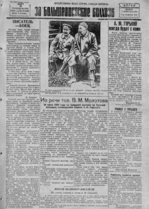 М А Р Т 28 ) П О Н Е Д Е Л Ь Н И К ' )1938 год № 1 6 ( 1 8 6 ) - } Цена 5 нопеек ПРОЛЕТАРИИ ВСЕХ СТРАН, СОЕДИНЯЙТЕСЬ! О Р Г А Н С е в е р н о г о райкома^ В К П ( б ) и райисполкома ПИСАТЕЛЬ — БОЕЦ Год издания 3-й шро е С д г е н о г ы о с й д о н ц я иа п л в р и а о з ш л м е а а т , ар ст в и р е а с а т ь на м о п е т о жм б е е д ч д у а и н е в а т славное 70-летие со дня рождения великого ру с ск о го писателя рево дюционера А л ексе я Максимовича Горького. Наша коммунистическая партия большевиков, ее великие вожди и стратеги Л епин и Сталин , весь 170 миллионный народ социалнсти- С еской родины, пролетариат кани т м и с т н ч е с к о г о мира, высоко ценят Ано л г е о ксея ре Мво а л к юси ц мио о н в е и р ч а а, б к о а й к ца п , одл к и а н к д в к е у и л й и В к . „ о к И г р о е . п Лп к и е о н са и с т н в е я л з п я а и . л с Е алщ с , е е бя ч в то 1 с 9 в 0 Г о 9 о и р м г ь о и в в е е д л е и н к и и я м ми и ху с дож р е а с б т о в ч е и н м ныд мви и ж п е р н о и и ем з России и всего мира". В 1932 го д у , когда наш» страна и весь мир отмечали сороколетие л л иит т и ер ч а е т ск ур о нй ой дея и тел о ь б н щос е т с и тве А н л н е о к - с п е о я Максимовича Горького, товарищ С ст т в „ а Д и л о е и : р н ог п о о й сла А л ле с к л с е е д й ую М щ а е к е си п м р о и в в и е ч т ! Око т жду м шу и р у п к р у и . ве Жтс е т л в а у юю В В а а м с и до к л р г е и п х лет жизни и работы на радость ‘ всем трудящимся , на с тр а х врагам р а б о ч е ю к л ас са . И . С т а л и н “ . ро Г д о а рь го к р и я й чо как и сы б н езз т а р в у е д т о н в о ог л о юб н и а л н тр ав у и д д я е щл и х с г я н , ию г щлу и б й око б и ур о ж с у т а р з о ныне й строй В 1930 г о д у , когда перед пролетарским судом предстали участники „промпартии“ , Горький выступил со статьей, наполненной гневом и возмущением—„Е с л и враг не с д а е т с я , его уничтожают'*. мря е Вн ч е н о лы и л м к ю и б с й о и в л б ет о в с е с к ц е и м мГо с р п в ь а о к т и и р м й ио б т с ыо е мл р , д п ц л г е о а м социалистическую родину и иарод. Он любовно смотрел на героев и героинь т р у д а . Вся литературная деятельность нМ и а я кси „ мФ а о м Г а орь Г к о о р го д , е е е в го 4, пр . Пои е з с в н е я де о буревестнике“ , .Ж и з н ь Клима с С в и е а д т м е е г т н и ыи н й * а — “ и , эт . д М о ес а ц я т е т ь н к * н и , ей д „ шрМ и у о г й и и х в у к н п л и р а в о д е и р з в мировую ли т е ра т у ру . Миллионы граждан С оветского С б т иыо м юв о а з ю г а о т п п о п и р с н о а е и т с з е к в л о е я л д . ь е к нО о и б я ра р з с а в з о Н е п и г е л о р о е в л ч н юи ы шиз ет ромт. ан Ф а е д „ Мо р а о т в ь “ из Г о к р о ь л к х о о г з о а ,— и п ми . Т е л ь м а н а ,—это пример борьбы за р в ви е а н ч бо н ч у о ч е м е и у т д с е н л л а о о с в . у к “ у . А л л ь е т к у с р е е й , х Му д а о к ж си е м с т о З а литературные заслуги перед рабочим классом и трудящимися С С О Р , советское правительство в с 1 и 9 м32 ов г и о ч д а у н Г а о г р р ь ад к и ог л о о Ал о ек р с д ея е н М о а м к Ленина. ро Пд о а д , н л а ы е е мп и л з ки по к д р л о е в й а шво и г х о фвр а а ш г ии змн а а, бандиты, террористы Б у х ар и н , Ры ко в , Я го д а и их приспешники, д н н у у е юн , а з в и а ид и н я с е к р р а Г е з о н р р ын ь юв к н ю о у г ю о л , юд р б е у о г жв о ь б у п к л с а н в м а о р е ж н о дем тр у д ящ и х ся т о в а р и щ е м Сталиным, оборвали светлую и замечательную ж и з н ь Алексея Максимовича Г о р ь к о г о . Но мять па о гениальном х у д о ж н и к е с л л о о к в о а м , м о ун бе и з з з м а а ве н тн ав о с м ег б д о а рц о е ста з н а ет д с е я в сердцах в се х тр удящ и х 