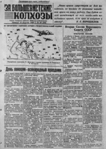 Пролетарии всех стран, соединяйтесь! ЭЯ6 0 М Ш Т 1 М ■ К О Л Х О З Ы Г а з е т а С е в е р н о г о р а й к о м а ВКП(б) и р а й и с п о л к о м а Четверг 18 а в г у с т а 1 9 3 8 г . № 4 6 (216) »Наша а р м и я существует не д л я нападения, но т олько до момента нападения в р а г а на н аш у р о д и н у . Она б уд ет с а мой нападающей и з всех к о гд а -л и б о нападавш их а р м и й, если враг ее понудит к э т о м у * . К. Е. ВОРОШИЛОВ. ДА ЗДРАВСТВУЮТ СОВЕТСКИЕ ЛЕТЧИКН-ГОРДЫЕ СОКОЛЫ НАШЕЙ РОДИНЫ! (Г П ерери сов ка художника Н. Д енисова с плаката Художника Н. Д енисова и Н. Ватолиной. День авиации—всенародныйпраздник Ни в одной стране мира авиация не п о л ь з у е т с я т а - ’ кой любовью, таким вниманием народных масс, нам в нашей стране. День авиации с та л у нас тр а диционным, н а р о д н ы м праздником, он вошел в быт. в сознание с о в е т ск о го народа. Герои дня авиации— наши славные советские летчики, гордые соколы нашей страны, сталинские питомцы, выращенные партией Ленина— С та ли на , с о ветским правительством и -личным вниманием и неустанными заботами товарища С та ли н а . Герои дня авиации— этс рабочие, инженеры, конструкторы и техники на шей могучей авиационной промышленности, создан ной за две сталинские пятилетки. За да ч а советской авиационной промышленно- сти --спздавать такие машины, которыеспособныбыли бы летать дальше, быстрее и выше всех. С о в е тс к и е авиационные заводы показали, что они с этой з а дачей справляются успешно. Мировой рекорд дальности по ле та по прямой был завоеван советскими летчиками— Героями С о - в е т с к о г о С о ю з а Г ромовым, Юмашевым и Данилиным на машине, созданной с о ветскими рабочими, из с о ветских материалов. Имена Г е р о е в С о в е т с к о го С ою з а Чкалова, Б а й дуко ва, Белякова, Водопьянова, Молокова, Алексеева и др у ги х хорошо известны советскому народу. Недавно страна с в о с хищением следила за г е роическим перелетом Г е - роев Советского С о ю з а Владимира Коккинаки и Александра Бряндинского из Москвы в район В л а дивостока и трех летчиц — Полины Осипенко, Веры Ломано и Марины Р а с к о вой из С евас топ оля в А р хангельск на гидросамоле те . Э ти перелеты еще раз показали всему миру, что советская страна расп о л а га е т в одинаковой с т е пени и первоклассной те х нической базой самолетостроения, и непревзойденными людскими кадрами авиации. О т в е ч а я на приветствие по случаю блестящего з а вершения перелета Москва— район В ладивос то ка, тов. Коккинаки говорил: .С ам о ле ты , которые мы строим, отлично выдержали испытание. Машина, на которой мы л е т е л и , — не единственная. Наша промышленность с тр ои т такие самолеты в большом количестве. И когда потребуется, когда товарищ Сталин с к а ж е т , что надо ле теть не од н о му летчику, а многим с о т ням и тысячам советских п и л о т о в , - тогда тысячи с о ветских летчиков п о л е тя т т у д а , куда прикажет п ар тия, куда прикажет пра вительство, куда у к а ж е т великий С та ли н " . Наша авиация с л у ж и т д е л у мира и прогресса , но Вторая Сессия Верховного Сов ет а СССР О Т К Р Ы Т И Е С Е С С ИИ 10 а в г у с т а в Кремле о т крылась Вторая Сессия Верховного Совета СССР . В 2 час а д н я с о с т о я л о с ь заседание Сове та Союза, которое о т к ры л п р е д с е д а т е л ь Совета Союза д е п у т а т А. А. А в д р е а в . На за седании единогласно у т в е р жден следующий порядок дня Сессия: 1. У т в е рж д ен и е единого государственного
