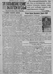 2 З А БОЛЬШЕВИСТСКИЕ КОЛХОЗЫ 30 августа 1938 г. № 56 (220) К 20-й годовщ и н е покушения на В. И. Ленина П р ош ло двадцать лет с того момента, как подлая р у к а с т авл ен н о го вр а г а народа эсерки Коплан поднялась на в е л и к о го вождя революции В. И. Лен и на . Это чудовищное п р е с т у п л ен и е б ы л о за р а н е е обдумано и по д го то в л ен о врагами революции, к о т о р ы е ни п ер ед чем не о с т а н а в лив а ли сь д ля того, чтобы о б е з г л а в и т ь социалистическую р е в о люцию, потопить ее в крови р а бочих и крестьян, восстановить в стране власть к р о в о п и й ц —п о мещиков и ка питалистов. С трана Советов в 1918 году п е р е ж и в а л а весьма тяжелые дни. Наша родина была в огненном к о л ьце , она п р ев р ати л ась в о с а ж денную крепость. Разб итые в б о ях в дни октябрьского штурма капиталисты н помещики, царские чиновники и генералы, ч е р н о с о тенное оф ицерство, все к о н т р р е волюционные п ар ти и—кадето в, м еньш е ви ков и эсеров б росилис ь со зв е р и н о й зл обой в ата к у п р о ти в власти со в е то в . Трижды п р е зрен ны е гнусные пред атели и и з менники Иуда-Троцкий, Бухарин, Каменев, З и н о вь е в и нх е д и н о мышленники, искусно м а с к и р у ясь и двуруш нически п р и к р ы в а я свои к ов арны е замыслы, с т р е м и л и с ь к тому, чтобы л и к в и д и р о в ать социалистическую р е в о л ю цию, восстановить и стр ане б у р ж у а з н ы е порядки . И м п ер и ал и сти ч еск ие хищники п р и ш л и на п омощь силам в ну т ренней контрреволюции в р а с ч е те на то, что им удастся р а с ч л е нить нашу родину, п ре в р а т и т ь с о ветский н арод в рабов и м п е р и а лизма. Р азв едки иностранных г о с у д а р с т в о р г ан и зо вы в ал и в о с стания. д и в е р с и и в ну тр и страны. Г ен ер а льны е штабы посылали в н ашу страну сво и войска: на Дал ьн ем Востоке высадились японцы, на с е в е р е—в .Мурманске —англо -ам ериканский о тряд , на У краину двинулись полчища г ерм ан це в и т. д. З а го в о р ан г л ий ск о го разведчика Ло к к а р та с та ви л целью, в контакте с Т роц ким и его бухаринским о хвостьем со р в а т ь мирную п е р е д ы ш ку, с о р в а т ь Брестский мир. Н а р о д бы л на стороне больше в и к о в . Партия п р о во д и л а ги г ан т ск ую р азъ яснительную работу в массах. Ленин 30 ав г у с т а в ы с т у п и л на собрании рабочих з а вода б. Михельсона. Когда Л е нин уходил с митинга, у ворот з а в о д а его настигла п р е д а т е л ь ск ая п у л я . Пули были о т р а в л е ны. Это чудовищное п р еступление вы з в а л о среди трудящихся в зрыв негодования. Советская р е с п у б л и к а была объявлен а в о ен ным лагерем . ВЧК под р у к о в о д ством Д зержинского беспощадно уничтож а ла в рагов революции Т о в а р и щ Сталин в этот т р у д нейший период жизни советской р е с п у б л и к и находился в Ц а р и цыне, откуда он н аправлял го л о дающим пролетарским центрам хлеб. Под руководством т о в а р и ща Сталина в это время была организована г ероическая о б о р о на Царицына, в ко то рой а к т и в нейшее участие принимал тов. В о р ош и л о в . Ленин, тяжело раненый, н е сколько дней находился в с м е р тельной опасности. Но его м о г у чий организм победил. 18 сен тяб р я был подписан бю лле тень о вы зд оровлен ии Ленина. На этом документе Ленин с д ел ал п р и п и с к у : . Н а основании этото б ю л л е теня и моего х о р о ш е г о с а м о ч у в ствия покорнейшая моя личная просьба не беспокоить врачей звонками и вопросами*. вы зд о р о в л ен ие Ленина в ы з в а ло восторг и л 