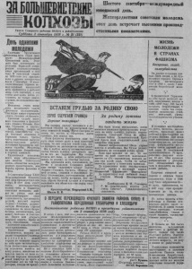 Г а з е т а С е в е р н о г о р а й к о м а ВКП(б) и р а й и с п о л к о м а Суббота 3 сентября 1938 г. № 51 (221) ” Jl " • ■ g g ^ g " - L - L ^ L L J J H U J i l l i . ! I J J P ' I H 1 » ! П и щ и м » .......... w b w Шестого сентября— м еждународный юношеский день. • • * Ж и зн е р а д о с т н а я советская м о л о д еж ь э т о т день встречает высокими производственными показателями. День единения молодежи . _ Ежегодно т р у д я щ а я с я .м о л од еж ь всех стран празднует Международный Юношеский день. Этот день был у с та н о в л е н по решению Б ерн ск ой конференции социалис тич ески х юных о р г а н и з а ц и й в 1915 году. В с о в е т с к о й стране до 1933 года е го праздновали в ..первое воскре сень е после I с е н т я б р я . В капитал истических с транах международный юношеский день проводится в рабочий де н ь—1-го с е н т я б р я , с тем чтобы молодежь могла у с траивать не только демонстрации, но и по литические стачки. Молодежь стран капитала и с пы ты в а е т самую ( оюстокую эк сплоатацию . Она видит какую страшную участь г о т о в и т ей фашизм. Трагична судьб а молодого поколения в фаш ис т ских странах Италии, Японии, Германии и других. Б е зр а б о т и ц а , с м е р т ь от голода, самоубийства с т а ли бытовым явлением. В Германии т о л ь к о тр еть я час ть окончивших высшую школу п о л у ч и л а р а б о т у , ос та л ьн ы е брошены на п р о извол с у д ь бы . Миллионы из молодежи безработных в странах к апитала . Т р у д я щ а я с я молодежь всего мира о б ъ е д и н я е т с я д л я защиты Советского Союза—о тече ства международного пр о л е т ар и а т а , для борьбы против фашизма и войны. В Советском Союзе XXIV Международный Юношеский д е н ь н р а з д н у е т с я 6 сент я б р я . В этот день счастл ив ая , жизнерадостная, полная силы и бодрости, со ветска я молодеж ь выйд е т на улицы ещ е раз п р од ем он с три р у е т свою сплоченность, преданность родной, могучей партии Ленина—Сталина, родине- матери. Молодежь страны социализма не знает б е з р а ботицы, э к сп л о а т ац и и , она живет свободно и сча стл и во. П е р ед ней откры та широкая д о р о г а . Право на т р у д , образование , отдых —достояние каждого с о в е т с кого граж д ан ин а . Воспитанная партией большевиков, вождем на родов товарищем Сталиным м о л о д е ж ь нашей страны не позволит надеть на себя ярмо эксплоатации. Если ф аш и с т ск и е м р ак о б е сы осмелятся н а п а с т ь нз нашу родину, миллионы патриотов вместе со всем с о ветским народом железной * лавой двинутся на врага и уни ч тож а т его на той т ер ритории, о т ку д а он придет. И З МА И ЯОПНЬ! В С Т А Н Е М ГРУДЬЮ З А РОДИНУ СВОЮ ЗОРКО ОБЕРЕГАЕМ ГРАНИЦЫ Д о р о ги е товарищи1 Мы служим народу, находимся в доблестной ОКДВА на неприступной границе со ветской земли. Гюрко смотрим на с е в е р , юг, восток и Оберегаем наши границы, как зеницу ока. Если фашисты попытаются ещ е с у н у ть с во е свиное рыло в иаш советский огород, то они получат так ой у д а р , после которого не досчитаются своих рядов. Мы в любую минуту готовы выполнить любое боевое з ад а н и е—р а зг р ом и ть врага на его же территории . Мы готовы о т д а ть все силы, а, если п о тр е бу е тс я и жизнь за родину, за с ч а с т ь е народов. Мы призываем в с ех колхозников, рабочих и служащих Северного района ещ е теснее сплотиться в о к р у г партии Л е н и н а—Стали на . Крепить оборону нашей родины, создавая и н а л аж и в а я рабо ту Осоавиахима, по-стахановски р а б о т а т ь на полях, чтобы во врем я , без пот ер ь у б р а