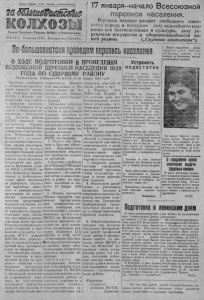 TiVo. 1 т а р а н всех ст р ан , со е ди ня йт е сь ! 1 а з е т а С е з о н н о г о Р а й к ом а В К П ( б ) и Р а й и с п о л к о м а A s 4 (247) j ] 5 января 1939 г., В о с к р е с е н ь е j Ц ен а 8 к . [ 17 я нва ря -н ачало В с е с о ю з н о й переписи населения. Перепись покажет расц вет с в о б о д н о г о совет с к о г о п а р о д а и п о с л у ж и т делу дальнейшего под нятии его б л а г о с о с т о я н и я и культуры , делу у к репления могущества и о б о р о н о с п о с о б н о с т и н а - шей родины._____ ( „ С п у т н и к а гит ат ор а “). едемперепись населения О ХОДЕ ПОДГОТОВКИ и ПРОВЕДЕНИЯ ВСЕСОЮЗНОЙ ПЕРЕПИСИ НАСЕЛЕНИЯ 1939 Г О Д А ПО СЕВЕРНОМУ РАЙОНУ П о с т а н о в л е н и е С е в е р н о г о Р К В Д П (б ) от 13 янзаря 193Э года. З а сл уш а в сообщ ения н еп р и г од ны х ( Б и а з п н -1 т у р о п л а т а , о б м о л о т , за- о го то вн о с ти к предсто- ски й масл озав од т. М а - сыпка семян и др.). я п щия е ^ и с е п к е р р е е т п а и ря си ра н й ас к е о л м е а - л р ы о шш и е л в о , в к а ол т х о о й з . и И м в . а н В о о в , В К П ( б ) т. Вмаеопл, рай- к о л х о з , .П у т ь С т а л и н а “ инспектора нархозучета т. К а р п о в ) , т. Ц а ц у л и н а , председа- Президиум райиспол- т со сл п я ета 11 т -Т . р Ф о и и л ц и к п о п го о в а се , л им ь- - к к л о в м о а ди н л ед в ост п а р т е о д ч с н т о оящ р е у й с т р у к т о р а - контролера переписи населения, не тов . 1 Клюева, райком принимал действенных В К П ( б ) отмечает : ряд мер в отношении отдель - а ги т п у н к т о в (Биазин- пых рук ов одителей сры- скин тов Б у г а е в ,В - К р а - вающих п од г о т о в к у пе- сно яр с к ии— г о в .П о н о м а - реииси населения, рев, И - Г р о и ц к и й — то в . И сходя из э т о го райком Козлов и т. д.) несмот- ВКП(б) поста но вл яе т : ря на наличие значитель- ; 1• Обязать то в . Ц а ц у - ных кадро в а ги т а торо в , липа и В л а с о в а обеспе- б е с е д ч и к о в и ч т е ц о в шить больш еви ст ским имеющих б ольшой опыт р у к о в о д с т в о м о б р а з ц о - ма ссоно ра з 'я сни тель ной вое проведение п е р е п и - работы среди населения, си населения, полученный при выбо-) ‘¿ . П о р у ч и т ь т о в .В л а с о - р а х в В е р х о в н ы е С о в е - ву и П е т р о в у ( Р И К ) п о д о - ты С С С Р и Р С Ф С Р —д о брать коммуни стов , ком- с е г о времени не исполь* в н с а о ы т м й ь о а л в к ь т ц р и е а в в й , о и н к б о е м п с п о ан а р д п т и е и р р й о е з п д и н с е и е н 14 асел я е н н в и ар я я нс 19 п 3 о 9 год 3 а . . О б я з а т ь п а р то р г о в О в ц и и б ч й к н , о ым х а к , о п м а м п р у а т н р о т и р о с г т р о о г в а в н -о п и д е з и р а - ночек , к ом с о р го в , з а в . а м г о и ч т е п н у н н ы к х там р и а и й у к п о о л м н о а В К П ( б ) но В с е с о ю з н о й с х п н у о е и д р з я и а е х х п т , ь и у с ч в и о р о б е р н ж а а д в щ с е с е е е н л н х и е и н я н е и х а я , с , к Ц е о о л б л е К В К П (б ) и С Н К С С С Р н „ о О й п п р е о р в е е п д и е с н и ии на В се с л е е с о н ю ия з " п и еч п и р в и а н ю я щ ть ие м п е о р о ы вед о е б н е и с е п р 4 е а р з . 0 ц еп о и в б о си . я з на а се т ле ь ния з о а б в . явного с а б о т а ж а в в ы - ¡а г и т п у н к т ам и , агитато- иолнении у к а з а н и я ! р о в и б е с е д ч и к о в . у п о л - Р И К ' а и райкома В К П ( б ) помоченных Р К ВК11(б) и о б р а з ц о в о й п о д г о т о в - ' п роводить м а с с о в о -р а з ъ - ке и проведении пере- я с н и т ел ь н ую р а б о т у о п и сп , не о б е сп ечив ая п ер еп и си , увязывая ее с еж е д н е вн о е д е ж у р с т в о выполнением х о з я й с т - лошадей или выделяя р в енно -политических за- д е ж у р с т в о лошадей я в н о j дач ( х л е б о п о с т а в к а , назовали и ио-большеви- с т с к и среди населения н н