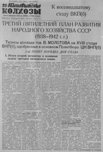 П р о л е т а р и и всех с т р а н, с о е д и н я й т е с ь ! Г а зе та С еверного Райкома В К П ( б ) и Райисполкома Л * 8 ( 2 5 1 ) | 10 февраля 1939 г., пятница Цена 8 к. К восемнадцатому съезду ВКП(б) Т Р Е Т И Й П Я Т И Л Е Т Н И Й П Л А Н Р А З В И Т И Я Н А Р О Д Н О Г О Х О З Я Й С Т В А С С С Р (1938-1942 г. г.) Т е з и с ы доклада тов. В. МОЛОТОВА на X V III с 'е з д е В К П (б ) , одобренные в основном Политбюро Ц К В К П ( б ) 2-ой П У Н К Т П О Р Я Д К А Д Н Я С Е ЗД А I. И то ги второй пятилетки и о сн ов ны е задачи т р е т ь е г о пятилетнего плана. 1. В результате успешного выполнения второго пнтнлетнего плана (11133 — 1937 г. г.) в С<СР разрешена основная историческая зад а ч а второй пятилетки —окончательно ликвидированы все эксплуататорские классы, полностью уничтожены причины, порождающие эксплуатацию человека человеком и разделение общества на эксплуататоров и эксплуатируемых. Решена труднейшая задача социалистической революции: завершена коллективизация сельского хозяйства, колхозный строй окончательно окреп. В нашей стране «осуществлена в основном первая фаза коммунизма — социализм» (Сталин). Победа социализма законодательно закреплена в повой Конституции СССР. Социалистическая — государственная и кооперативно-колхоиная —собственность на производственные фонды, па орудия пропз водства и произг.одствснные постройки, к концу второй пятилетки составляла 98.7 процепта всех производственных фондов нашей страпе. Социалистическая система производства стала безраздельно господствовать во всем пародпом хозяйстве СССР: по валовой продукции промышленности она составляла — 99,8 процента, но валовой продукции сельского хозяйства, включая личное подсобное хозяйство колхозников, —98,6 процента, но товарообороту— 100 процентов. В соответствии с происшедшей социалистической перестройкой экономики сграпи, изменилась и классовая структура советского общества. Занятые в социалистическом хозяйстве СССР рабочие и служащие составляли в 1937 году в составе всего населения страны— 34,7 процента; колхозное крестьянство, вместе с кооперированными кустарями, — 55,5 процента; армия, учащиеся, пенсионеры н другие— 4,2 процента. Таким образом, уже тогда 94.4 процепта населения страпы было занято в социалистическом хозяйстве пли теспо связано с ним. Остальная часть населения: крестьяне-едпнолнчникн, некооперированняе кустари иремесленники составляли только 5,6 процента населеиия. С тех пор эта часть населения еще более уменьшилась. Социалистическое общество в СССР состоит теперь из двух дружественных друг друту классов— из рабочих,-, н крестьян грани между которыми, а тацже между этими классами и интеллигенцией, стираются, постелен но исчезают. Трудящиеся СС Р в подавляющей массе являются активными н сознательными строителями бесклассового социалистического общества, коммунизма. Победа социализма в СССР обеспечила невиданпое раньше пигде внутреннее моральное и политическое единство парода, морально- политическое единство трудящихся под знаменем и руководством коммунистической партии п Советской власти, способной пе только покончить с остатками враждебных классов, с их чуждыми влияпнямн и дать отпор всяким враждебным покушениям извне, по и являющееся лучшей гарантией дальнейшего роста и расцвета нашей родины, гарантией победы коммунизма в нашей стране. 2. Главная и решающая хо - зяйстс енная зад