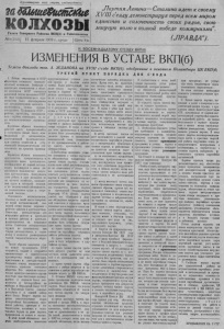 Ь р о л е т а р и и всех стран , соединяйтесь! шШ шеёисшхЫ КОЛХОЗЫ Газета Северного Райкома ВКП(б) и Райисполкома № 9 (252) | 15 февраля 1939 г., среда I Цена 8 к. М арт ы я Л е н и н а — С т а л и н а и д ет к своему X V I I I с е з д у д е м о н с т р и р у я п ер ед всем миром единст во и сплоченность с в о и х р я д о в , свою могучую волю к полной п о б ед е коммунизма“ . („ПРАВДА“). К ВОСЕМНАДЦАТОМУ С ‘Е З Д У ВКП(б) ИЗМЕНЕНИЯ В УСТАВЕ ВКП(б) Тс л и ы д о к л а д а тов. А . Ж Д А Н О В А на X V I I I с'е зде В К П ( б ) , одобренные в основном П о л и т б ю р о Ц К Е К П ( б ) Т Р Е Т И Й П У Н К Т П О Р Я Д К А Д Н Я С ‘ 1. Побдеа социализма в СССР обеспечила господство тической экономики. Соо с б оц ра и з а н л о ис е т к и оре э н к н о ы н м ом и ик и и змен С е С н С ия Р ми и в зм о е б н л и а л с с я классовый состав населения СССР. З и а тел г ь о с д т ы ва соц б и ы ал л и и сти л ч и ес к к в о и г д о иро с в т а р н о ы все экеплоататорекие элементы— капиталисты, купцы, кулаки, спекулянты. Трудящиеся СССР - д р ц с ы т а и б в я о а К с — ч . о о и ц р г е е и л , н а у н л б к и ы о р к м с е о т с и т ч о и ь е б з я с м р к н а е о е з н г о , и о м ли и с с н ь т т р е о л и л з т а и е г л е г ь н о изменился рабочий класс, превратившийся в совершенно новый класс, осво божденвый от эксплоатации, уничтоживший с к н т у о в в ю е и н в н с ш и о и с с й т т ь ем с у о н ц а и х а о с л з р и я е й с д к т с с а и т т п в в ч и а а е т с а к л п у и и р ю с ои ти зв у с ч о с о е д б т с а ств К а. оренным образом изменилось крестьянство, превратившееся в совершенно новое крестьянство, освобожденное от всякой эксплоа- т д н а а ы в ц м л и я и ю к , р щ е я е с в м т л ь я я б ю н о щ с л т ь е в ш е о с и м я н , ст в в б е а с з в и о р е у к ю о м л щ х и о п м з о свою работу и свое достояние, не н н о а м ч т а р ст у н д о е м и хо о з т я с й т с а т л в о е й , ед т и е н х о н л и и к ч е , а на коллективной собственности, н м а ен к И н о о з л м й л е е н т к и е т л х и а н в с и н ь о к м е. тру и д н е те и ллиг с е о н в ц р и е я , ставшая в своей массе совершен но новой интеллигенцией, занной всеми своими корнями свя с рабочим классом и крестьянством. Советская интеллигенция—это вчерашние рабочие в крестьяне я сыновья рабочих в крестьян, выдвинувшиеся на командные поеты. Советская интеллигенция служит не капитализму, как л ст и а зм ра у я и ин я т в е л л я л е и т г с е я нци р я а , вн а опра с в о н ц ы и м а ч тв ле а Т . но а м ким соц о и б а р л а и з с ом тич к е л с а к с о с г о о вые об ( щ г е р с а ни между трудящимися СССР стираются, падают и стираются экономические я политические противоречия между рабочими, крестьянами и интеллигенцией С т о и з ч д е а с л к а о с г ь о ос е н д о и в н а ств м а орал с ь о н в о е - т п с о к л о и г о общества. Это ж п че д о с е лу к н о ч и е и е ло еди с п во ст е во бл с е м о с в о т е р я т а щ с л к е ь о е н г о о п - о п п д о а т л р в о и е т д р а и в мунистов в соз б д е а с н п и а и рт б и л й о н к ы а х комна выборах в Верховный Совет СССР м в Верховпые Советы союзных республик и в полной победе • р т о о с г л о и бло м к н а. ого В ч о и к с р ле х н г ны п е артии кад вы ры т т д н е о е е л в п л ь ы а л н х р ы и ти х г р й е а н н б б ы о о т р ч х , ц и о х а в б , к о т з л к и а ь р в ш е п д с е ы т е в л ь и х * я к н о и в, п и а п р с е т о р и з и е н и н проводников ее линии в массаха . , рела В эт н о е й обх н о о д в и о м й ос о т б ь стано и в з к м е енен н и а я зпредусмотренных уставом вий приема в партию у н с о л в о ы х л ч а л с е н н о ов. уст Н а ы в н у е де