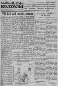 Т /рм епш р и и всех стр а н , соединяйтесь! ЗбШт&итснЫ КОЛХОЗЫ Г а а е т а С е в е р н о г о Райкома В К П ( б ) и Райисполкома .№ 1 0 ( 2 5 3 ) | 17 ф е в р а л я 1939 г . , п я т н и ц а Ц е н а 8 к. К олхо зники и колхозницы нашего района! Ра зверты вайт е социалистическое соревнование имени X V I I I с ъ е з д а партии за быстрейшее окончание хлебосдачи государству и большевистскую подготовку к севу! УРОдКля всей парторганизации Обком партии св оим решени-! См от 5-го февраля совершенно правильно р а бот у райкома прижал неудовлетвор ительн ой и снял с по ста се кр етар я С е в е р ного райкома ВКП(б) тов . Б а рышева, . к а к н е с иранившегося С работой и скомпроментиро - вавшего се бя в районе своим некоммунистическим по ведением в бы ту “ . Э т о з а сл уж е н н ая мера наказания. Она с у р о в а , но с п р а в е д лива . Но о т ве т ст ве н н ост ь за за пущ е нн ос ть партийной р а б о ты в районе , за провал х о з я й ственно-поли ти ческих камп аний не меньшая доля вины л ожится и на втор ого , третьего секретарей райкомов товари щей Яблокова, В л а с о в а и в целом на ве сь со с т а в членов райкома партии. Д е л о в том, что большевистская критика и с а мокритика как м е ж д у членами райкома, а также в ср ед е всей парторганизации в достаточной мере не была организована. Члены райкома Я бл ок ов , В л а со в и д р у г и е скромно вели се- .)я по отношению к Барышеву. Они с тесн яли сь во -в ремя критиковать е г о , а если иногда и были такие попытки, то это не была критика, а ра зговор Сквозь з у б о в . В самом д ел е, обком и д р у гие областные организации о к а зывали нашему району б о л ь ш ую помощь кадрами и всем необходимым, да к тому же в районе св о и х возм ожностей было дост аточно, все ж е райком партии и его первый с е к ретарь тов. Барышев не сумел а ор ганиз овать так партийно-политич ескую р а б о т у и вместе с тем х о з я й с т в е н н у ю , чтобы во время у б р а т ь богатый ко л хо з ный урожай , выполнить в срок Зернопоставку г о с у д а р с т в у и образцово по дго т ови ть ся к в е сеннему с е в у первого года третьей сталинской пятилетки. Райком партии вместо б о ево го штаба—по литическ ого р у к о водителя, постоянно связанного с партийными организациями и коммунистами, с сельским ак тивом—ст ах ан о в ц ам и , у д ар ни ками и всеми непартийными большевиками , м обилизуя их на б о рьбу з а выполнение коренных за да ч , ото рвался от м а сс , са м о у с тр ан и л ся от партийной работы и руководил канцелярско - бюрократическим методом, партийно-политической работой занимался от с л у чая к с л у ч а ю , а сельским х о зяйством руко во ди л п о в е р х н о стно не вникая во в с е „ м е л о ч и “ кол хо зно го пр ои зво дс тв а . Факты сами з а себя говорят. В районе имеется 119 человек трактористов и комбайнеров, 163 с т а х а н о в ц а и ударника полеводства и животноводства, более 800 ком сом ол ьц ев , с о ч у в с твующ и х 24 человека и 203 учителя. Э т о —ар мия, с которой надо постоянно р а б о т ат ь , д е р жать св я з ь , воспи ты вать е е ; э т о —тот бо льш евистский родник, из которого партия пополняет свои ряды. И вот при наличии таких во зм ож н о с те й почти за Г°Д наша парторганизаци я выросла всего на 49 ч е л о в е к . Это ни чуть не з а с л у г а райкома , а ®то в партию пришли те люди, которых са м а м н ог о г р а н н ая , ки- пУчая своими бо гатыми с о бы тиями ж и знь п о д го т ови л а , вое- ” т®ла* сб л и з и л а с бо л ьш ев и с т ской партией. На самом же Д ле по
