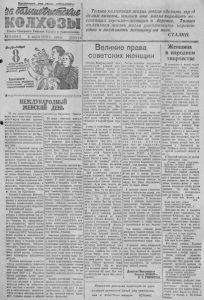 П р о л ет а р и и всея стран, соединяйтесь! Газета С е верного Райкома В * Ш ( б ) и Райисполкома Л 6 15 (258)1 8 марта 1939 г., среда | цена 8 ф а ¡¡BÇpatdSAfftà Только к о л х о з н а я жизнь могла сделать т руд делом почета, только о н а могла породить нас т о я щ и х героинь—ж е н щ и н в деревне. Только к о л х о з н а я жизнь могла уничт ож ит ь неравенство и поставить ж енщ ин у на ноги. С Т А Л И Н . , л ш р та. _ j u e v & p 'a f i v b » » * * yfPi tfиспиши*Ш&Шft ffCtitCJC4 U> ! П р и в е т СОВКТСКИМ ЖЕНЩИНАМ. СЧАСТЛИВЫМ А О ЧИ ХШ уд)м . т ; и М < Я Й эвДЯНЫ! '4 ^ ¿ и SS- SS. 'S s. :¿ r . ï& l& ïin 'S à b ïfr ^ 1 v r 'i ÿ МЕЖДУНАРОДНЫЙ ЖЕНСКИЙ ДЕНЬ депутатами Верховных Советов. щ де и н н ь ы 2Б в 8 с д е м г е о а т рт м н а и аз р а а д ка с у к т г а д н л е е и н т ь еи о я т ы м п е е р ч о ж а т т е е ь с н т а Против капиталистическою строя, «орлботпвшего женщину. И сейчас ж дя ен т щ де и н н ь ы за 8 ру м б а сж рт п а ы п х о с д т з р н а а н ко п м ро с в п о л оче «ия п мобилизации сил дляборь бып|ютив капитализма,* п|>отив чудовищной эксплуатации, против «Стремительных нмпериалнстичес них войн. Не то в Советской стране, где к ж к о о е й й нщ р О е и к в н т о а я л , б ю р ц б ь л с и к а и о г , о й д с а в р о и со б п ц о и о д а б н л е о и ед с и т В и е ч р л е я и с в - ш « е о й е н й р р с а о т в д р н и а о н н ы е т у р н и у и д ч и е т т в о о с ж е я г е о н н н а к а а р п о б и д л т а а а . го ли В с з н в м а о , ликвидированы эскилуататорские «ласты, рабочий класс избавлен 0Р ужасов безработицы, а кресть- Лнетно—от ужасов нищеты и ра- ц « е о н р и еп л н и я. со П ве об тс ед к ы им соц г и р а а л ж из д м а а на об м е - с и Женщинам, полноправным членам нашего общества, —право на труд, иа отдых, на образование. ц р и ав я н В ы е п л е р и е к д е а о я с м та у С в ж т л а ч я л и е и н т н о з й с к к е н а н р я щ ав нп К а е о в н С о с С т в и С се т Р х уОбластях хозяйственной, государ Ствепной, культурной и об цествси- ио-полптнческой жизни Эти нрава завоеваны рабочим к н к л о а в а — с о с д о С ст м т в а о л м и ин к в а р е . л ес и Н т к ь а о я й нс п т ц о в р р о е т м . я дп и п р Л п од я е т п р а и я у х я в учреждениях ная 1е 8 страны р щ а и бо н т — ае б т ол с ь в ш ы е ш т е р 9 ети ми в л с л е и х он р ов аб ж оч е и н х и щ ра и в н с л л ы я у ю ж н т а а щ р и а г в о х н су С е д С а С с р Р с . тв С м о о у м в ж е , ч т и ск н и д а в е м и и ж га е у ю н п т вперед аауку н технику, руково Дат предприятиями, советами, в н в к о а о о з ю с л ы т х т ь о , за н в м а ы у и ш к д , р е а е й ю в п щ о л р д и я я о ю е т д с т и я с н а ы м о , о с б т л о а е у р х т с о а ы т н н а , о о н сп п в а с а о в к р л со и о и б е рекорды. ж ч л е е и с н с к В щ ь а ы и я с в н о ы с к п о а е з я р о н и с а о о а т б д к е е т л н и ь в н в н ы о н о о с б т с о т ь о я р ь в р к в с о и о В в п е в е о т ы р л с х я к и о в о т в и й и - Великие права советских ж енщ ин Из среды советских женщин в м ы ы ш ш л л о ен м н н о о с ж т е и с . тво ко п л е х р о е зн до о в го иков тр п у р д о а , обороны. На всю страну известны имена знатных женщип: пятисот- т н о н к цы Ко М ва а р р д и а н к Де и м А ч н е г н ел к и о; н т о р й а ; кт о о д р н и и с х с в к з ог п о ерв д ы в х иже за н ч и и я нате Д л у е с й н с и та М ха а н р о у в си В н д о и е й м н и о до к гр а ро а г д Л и о и в З н ы и ы н х; а н и а д Ш ч ы а т л Т е ь р р н о н и и ц к и к а ой ж ; м е а н л к о е а г з и х других. На весь мир прогремела с в п л е е т а н с в к к а о о , го о Ра С с о к ж ю о е з в н а о щ й Г и . р н и а з х од — уб Г о е в р о о й я , х Оси С ораж Т д ы ен ся ы чи орд с е о н в а е м т и ск и их ме ж да е л н я щ м и и н 
