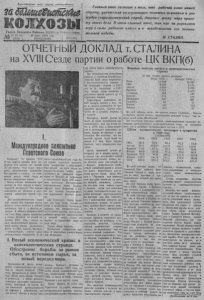 № 1 7 1 8 - 1 9 ( 2 8 2 ) З А Б О Л Ь Ш Е В И С Т С К И Е К О Л Х О З Ы 3 ПРОДОЛЖЕНИЕ ДОКЛАДА т. СТАЛИНА В ко п ц с 1 9 3 1 г . наша с т р а н а в с т у п и л а в Л и г у наций, всходя из т о г о , чго, несмотря пч ее сл абост ь, о н а вес же может п ри годи ть ся , к а к место разоблачен и я агрессоро в и к а к некоторый, х о т я и с лабый , и н с т р у м е н т м ира , м о г у щ и й то рмо зить р а звя зыв ание воины. Сов етс кий Союз с ч и та е т , что в т а ко е тревожное вр емя на следует пренебрегать даже та ко й слабой международной о р г а н и з а ц и е й , к а к Л и г а наций В мае 1 9 3 5 года был заключен договор между Ф р а н ц и е й и Сов етс ким Соючом о взаимной по и ощ а п р о ти в возможног о нападения а г р е с соров. Одновременно с э т и м был за клю ч ен а н а л о г и ч ны й договор с Ч е х о с л о в а ки е й . 15 м а р те 1 9 3 6 г . Со в е тс к ий СоюI заключил договор с Мон гольско й Народной республикой о взаимной пом ощи. В а в г у с т е 1 9 3 7 г. -был заключен договор о взаимном ненап адении между Со в е тс к им Союзом и К и та йс ко й ре спубликой. В э т и х т р у д н ы х междунгродн у с л о в и я х проводил Сов етс кий Соки свою внеш нюю п о л и т и к у , о г с г л н з а н дело с о х р а н е н и я мира . В н е ш н я я п о л и т и к а С о в е т с к о г о : Союза ясна и по н я тн а : I 1. Мы ст оим за м и р и у к р е п ление деловых связей со всеми | с т р а н а м и , стоим и будем с т о я т ь 1на этой позиции, п оско льку э ти ' ¡с тр а ны б у д у т д е р ж а т ь с я т а к и х же о тнош ений с Сов етским Сою- 1зол, п ос ко л ьк у они пе п о п ы т а ются н а р у ш и т ь интересы нашей ' с т р а н ы . 2 . Мы стоим за мирны е, близкие ' и добрососедские отнош ен и я со в с ем и соседними с т р а н а м и , имеющ ими с СС С Р общую г р а н и ц у , ст оим и будем с т о я т ь на этой пози ци и, поскольку эти с т р а н ы б у д у т де рж а ть с я т а к и х ; же отношений с Советс ким Сою- ! зом, п ос ко льк у опи не п о п ы т а ю т с я н а р у ш и т ь , прямо или ко св ен но, интересы целости и н е п р и ко с новенности г р а н и ц Советского I г о су д а р ст в а . I 2 . Мы стоим за поддержку народов, с т а в ш и х ж е р т в а м и а г р е с си н и бо рющ ихся за н е за в и с и м о с ть своей родины. 4. Мы не боимся у гр о з со стороны агрессоров н готовы ответить двойным ударом на удар п о д ж и гателей в о йны , п ы т а ю щ и х с я н а р у ш и т ь неп рико сновенно сть сов е т с к и х г р а н и ц . Та коиа в н е ш н я я п о л и т и к а Советского Союза. (Бурные, продолжительные аплодисменты). Б своей внешней п о л и т и к е Сове тский Союз о п и р а е т с я : 1. На свою р а с т у щ у ю х о з я й с т ве н н ую , п о л и т и ч е с к у ю в к у л ь т у р н у ю мощ ь ; 2. На мораль но -политиче ское единство нашего со ветского общ ества; 3 . На д р у ж б у народов нашей с т р а н ы ; 4 . На свою К р а с н у ю А рм ию и Военно -Морекой К р а с н ы й Флот: 5 . На свою м и р н у ю п о л и т и к у ; 6 . На моральную поддержку т р у д я щ и х с я всех с т р а н , кровно за и н те р е со в а вш и х в со х р а н ен и и м ир а ; 7. На бл а г о р а з у м и е т е х с т р а н , которые пе заинтересованы но тем или иным п р и ч и н а м в н а р у шении мира . « * О Задачи п а р т и и в об лас ти виеш - ней п о л и т и к и : 1. Проводит:, и впредь п о ли т и к у мира и у к р е п л е н и и деловых св язей со всеми с т р а н а м и ; 2 . Соблюдать о с т о р о ж н о с т ь н нс давать в т я н у т ь в ко нф ли к ты н а ш у с т р а н у прово каторам вой ны, п р и в ы к ш и м з а г р е б а т ь ж а р ч у ж и м и р у к а м и ; 3 . Вс ем е р н о у к р е п л я т ь боевую мощь н аш ей К ра сной А р м и я и В о е н но -М о р ск о г о К ра сн ого Флот