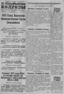 Ъ р о л е т а р и и всех с т р ан, с о единяйт есь! 1Р ■ г : ..Г?.в е т а ..Ре в ®?®®£® Райкома В К П ( б ) и Р а й и с п о л к ом а К Г о 2 ? I Вторник, I (263> 1 28 марта 1 9 3 9 года | Ц е н а 8 к о п *, XVII Съезд Всесоюзной Коммунисткнеской Парти (болшьевиокв) Р езолю ция X V I I I С ъ е зда В К П ( б ) по отчетному д о к л а д у т о в . С Т А Л И Н А о работе Ц К В К П ( б ) (Принята единогласно). З а с л у ш а в и о б с у д и в отчетный д о к л а д т о р . Сталина о р а б о т е ЦК ВКП(б), XVIII с ъ е з д ВКП(б) п о с т а новляет: 1.О д о б р и т ь п оли тическ ую линию и практическую р а б о т у ЦК ВКП(б). 2. О д о б р и т ь отчетный д о к л а д т о в . Сталина и п р е д л о ж и т ь всем парторганизациям р у к о в о д с т в о в а т ь - ; ся в с в о е й р а б о т е п о л ож ен и ям т и задачам и , выдвинутыми в д о к л а д е тов . Сталина. РеозлюциXяVII съезда ВКП()б по отчтеу Центральной Ревизионной Комиссии (Принята единогласно). Отчет Центральной Р е в и з и о н н о й к омиссии у т в е р д и т ь . Резолюция XVII съезда ВКП(б) поотчетному докладу тов. Мануильского о рбаотеделегации ВКП(б) вИКНИ (Принята единогласно). З а с л у ш а в и о б с у д и в отчет д е л е гации ВКП(б) в Коминтерне, XVIII с ъ е з д ВКП(б) о д о б р я е т п оли тич ес к у ю линию и практическую р а б о т у д е л е г а ц и и ВКП(б) в Коминтерне. ХУШ-й Съезд Всесоюзной Коммунистической Партии (большевиков) Д Н Е В Н И К И С Ъ Е З Д А Вечернее заседание 14 марта Вечернее засе дание С ‘ езда 1 4 м арта о т к р ы в а е т с я в 18 ч а сов 1 0 м и н у т под председательством тов Щ ер б а ко в а . Слово для доклада о третьем п я т и л е т и ем п л а н е р а з в и т и я па- родного х о з я й с т в а С С С Р предост а в л я е т с я то н. В . М . Молотову. С 'е зд встр е ч а е т т о в . Молотова бурной восторженной ова ци ей .З а л , с т о я , п р и в е т с т в у е т верного и с п ы т а н н о го с о р а т н и к а т о в .С т а л и н а . О в а ци я д л и т с я несколько м и н у т . Со всех концов зала н е с у т с я возг л а с ы п р и в е т с т в и й в чест ь т . т . С т а л и н а и Молотова . Доклад т о в . Молото ва продолж а е т с я до 2 2 часов. З а к л ю ч и тельны е слова т о в . Молотова вы зы в аю т новый взрыв о ва ций К зале долги е м и н у т ы не с м о л к аю т п р и в е т с т в и я в ч е ст ь о р г а низатора и вдох но вителя н а ш и х побед тов. С т а л и н а , в ч е с т ь Л е ни н с к е С т а л и н с к о г о Ц е н т р а л ь ного К о м и т е т а . С ' е з д п р и в е т с т в о в а л и д е л е г а ци и р а б о ч и х , работниц, к о л х о з ников и со вет ской и н т е л л и г е н ции Москвы и М ос ко вской облас- : т и , Л е н и н г р а д а и Л е н и н г р а д с к о й о блас ти . ( Т А С С ) . У тр е н н е е заседание 15 м арта П а у тр ен н ем заседай и и С 1езда н а ч а л и с ь п р е н и я по докладу тов. Молотова о т р е т ь и п я т и л е т и е м п л а н е р а з в и т и я народног о х о з я й ства С С С Р . О т к р ы в а я заседание председат е л ь с т в у ю щ и й тов. Щ ербаков п р е доставил первое слово той. П а л ь цеву (М о с ко в с к а я о б л а с ть ) , затем в ы с т у п и л то в . Бойцов ( К а л и н и н с к а я область), К о р н и е ц ( У к р м н - с к а я С С Р ) , П а п а н и н , Вознесен с к и й (Г о сп ла н С С С Р ) . Ш а гн м а р д а - нов ( Б а ш к и р с к а я А С С Р ) , П е р в у х и н (народный к о м и с с а р э ле к тро с т а н ц и й и э ле к тропромыш ленно сти С С С Р ) , Н и ко ла е в а ( В Ц С П С ) . С огромным удовлетворением о т ме чаю т делегаты съезда в е л и ч ественные итоги второй п я т и л е т ки и п е р с п е к т и в ы тр е ть е го п я т н - л е т н е г о п л а н а . В ы р а ж а я мысли и ч у в с т в а вс его со в е т ск о г о народа, делегаты одобряют новый п л а н 