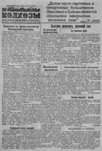 Пролет арии в се х с т р а н, со ед иня йт ес ь! „Делом чести партийных и непартийных большевиков Заволжья и Сибири является образцовое завершение Г а з е т а С е в е р н о г о Р а й к о м а В К Щ б ) и Р а й и с п о л к о м а .V ■>! (214) | 20 М А Л года, сцддопш Ц е н а и к о я . весеннего сева ( И з п е р е д о » ? * « П р а в д ы » о т 7 м а я 1 9 3 9 х . ) Бороться з а право участия на Всесоюзной Первого а в г у с т а н Москв е о т б ы в а е т с я В е т о ш н а я сельски хо- ш с т в е н н а я в ы с т а в к а . В ы с т а в к а я р к о п о к а ж е т не то л ь к о т р у д я щ и й с я С С С Р , по н веему м и р у гр а нд н о зпы е д о с ти ж е ни я к р у п н о г о се л ь с ко го х о з я й с т в а , о с на щ ен н о г о первоклассной т е х н и к о й , от обр а зи т л у ч ш и е образцы всех отрасл ей се л ь с ко ю .хозяйства, кото рые создал в аш колхозный строй — ко л х о з н и к и н к о л х о зни цы под ру ководст вом к о м м у н и с т и ч е с к о й п а р т и и (боль- шеииков ) и вож дя всех т р у д я щ и х с я т о в а р и щ а С т а л и н а . ' В ы с т а в к а име ет очень большое з н а ч е н и е . Опа п о к а ж е т , что т о л ь ко к о л х о з ны й , с о ц и а ли с ти ч е ск ий строй способен и м ож е т создать изобилие п р о д у к т о в , обеспеченную и с ч а с т л и в у ю ж н з п ь д л я всех т р у д я щ и х с я . Тов. М о л о т о в н а X V I I I съезде 6 К П ( б ) говорил: « . . . В ы с т а в к а д а е т це лую п р о г р а м м у для п о д 'ем а сельско го х о з я й с т в а . Она п о с л у ж и т делу веесоюзиой п о п у л я р и з а ц и и п е редовиков с е л ь с к о ю х о з я й с т в а , п о п у л я р и з а ц и и я р а с п р о с т р а н е нию л у ч ш и х п р и м е р о в и х работ ы . Э т а в ы с т а в к а д о л ж на вызв а т ь со р с в п о в а п и е м еж д у к о л х о з а м и , М ТС н со вхо зам и , м еж ду р а й о н ам и , о б ла с т я м и и респ у б л и к а м и . О н а може т и долж н а с ы г р а т ь к р у п н у ю роль в о р г а н и з а ц и и дал ь нейш ег о под‘ - ема се л ь с ко го х о з я й с т в а и в выполнении за д а н и й третьей п я т и л е т к и » . Ш и р о к о разв е р нуло сь с о ц и а л и ст ичес ко е с о р е в н о в а н и е за право уч а с т в о в а т ь на в ы с т а в к е , где б у д у т п о к а за ны д о с т и ж е н и я не т о л ь ко за п р о ш л ы е годы, но в за 1 9 3 9 год. З а п р а в е у ч а с т к а на В ы с т а в к е , бо рются 1 9 8 6 ранвпов, 0 9 . 2 5 1 колхоз, 4 3 6 совхозов, 2 . 5 7 1 М Т С , 2 3 . 9 1 1 колх озны х т о в а р н ы х ферм, 1 6 7 . 1 Ю 0 авсиьов, 3 6 . 0 0 0 п о ле в о д ч е с ки х бригад, с в ы ш е 1 0 0 . 0 0 0 передовиков седь- Сного х о з я й с т в а . В наш е м р а й о н е два колхоза имеют вы с о ки е п ок азатели . Они представлены к а н д и д а т а м и на Всесоюзную с е л ь с ко х о зя й ств ен ную в ы с т а в к у . В о т колх оз « В е р х - Т а р - С к п й » . З а т р и д ц а т ь седьмой и вос ьм ой годы о н собрал средний у р о ж а й озимей р ж и я 2 0 , 9 5 це нт не р а с г е к т а р а , я ч м е н я — Быстрее заокнчитвьсееннисевй выставке 1 6 , 1 0 ц е н . , о в с а — 1 8 цеп. с г о . Ко л х о зн и к и е 1 9 3 7 году п о д у ч и ли на тр уд од ень зерна 7 , 8 к г . , а в 1 9 3 8 г . 9 , 9 к г . В е л и к и и и х денежные доходы. Ко л хо з «Крл слогнар дее ц» — т а к ж е к а н ди д а т на в ы с т а в к у н добился т а к - ж е пеидохо го у р о ж а я . З а те ж е годы озимом р ж и собрано здесь 1 8 , 3 8 цен. с г е к т а р а , ! озимой пш ени цы — 1 2 , 7 2 цент . | п ш е н и ц ы я р о в о й — 1 2 , 9 3 ц е н т . , } о в с а — 1 6 , 0 8 цеп. н полбы— 1 5 , 0 3 ¡ цен. с г е к т а р а . С т о и м о с ть т р у додни иозросла за э ти д в а года в среднем до 8 , 2 к г . З ам е тн о вы р ос и д ен е ж ны й доход. Б о р я с ь за право у ч а с т и я на в ы с т а в к е , эти колхозы н а х о д я т ся в ч и с ле передовы х и в посевной к а 