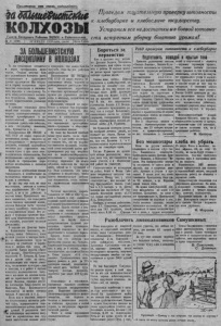 П р о л ет а р и и всех стран , соединяйтесь/ & / ! Х Л Й П р о в е д е м тща те л ь н у ю прове рку г отовности — , к х ле боу борке и хлебо сдач е государству. ЖШьЩР * Ж м т к Ц 9 я д ! У ст р ан им все недостатки и в боевой ютовноГ а з е т а С е в е р н о г о Р а й к о м а В К П ( б ) и Р а й и с п о л к о м а СШ Ы в С Ш р в т и М у б о р К у б о Ш т О Ю У р О Ж О я ! * 4 ' ( ~ 9 0 ) | ¿ в И Ю Л Я 1939 года, среда | Ц е п а 8 к о н . __________ ЗАБОЛЬШЕВИСТСКУЮ ДИСЦИПЛИНУ В КОЛХОЗАХ •U две с т а л и н с к и х п я т и л е т к и I и п ро д у к ци и , чем можно било Си и корне преобразилась ваша с т р а н а . Создана м о гучая база для дальнейшего быстрого роста материального и к у л ь т у р н о г о уровня т р у д я щ и х с я . Мы в с т у п а л и в период завершения строительства социализма и постепенного перехода к коммунизму. Задача ко ммунистического воспита н и я т р у д я щ и х с я теперь приобретает первостепенное, решающее значен ие. В сознании отдельных г р у п п людей еще остались пер еж и тки с т р о ю , к а п и т а л и с т и ч е с к о ю общества: пренебрежение к соц и алис тической собственности, стремление у р в а т ь себе побольше, а дать государс тву поменьше, день , ту неядство и т . д. Постановление ЦК В К П (б ) н С11К СССР <0 мерах охраны обществе нных. земель колхозов от разбазаривания» — исторический д о к ум е н т , имеющий к р у п а е й к о е аначение для у к р епления колхо з н о ю строя и для всего с оци алисти ческого стро и тел ьс тва . Это постановление— могучее о ружие в борьбе за преодоление переж и т к о в к а питал изм а в сознании колхозников. Идеология к р е с т ь я н и н а веками складывалась в хозяин л чанье на е д иноличных полосках в н у т а х к у л а к а н помещика. До с и х пор еще есть не мало колхозников, которые в течение юда вырабатывают 2 0 — 3 0 т р у додней, а то н не работают в колхозе вовсе. П рикры ваясь званием кол х оз н и к а , они пользуются всеми благами колхозной ж и з н и , отдавая большую часть времени личному хо з я й с тв у , торгашеским в сп ек у л я ти в н ы м делам. Эги лоп о л у ч и т ь , если бы все работали добросовестно. Постановлен не ЦК В К П { 6 ) и СМК СССР « 0 мерах о х ра ны об ще с ги е нн ы х земель колхозов от разбазаривания» дает в р у к и честн ы х колхозников, п а р ти й н ы х и советских организаци й могучее о р у ж и е для у к р епления д и с ц и п л и н ы в колхозах, воздействия на дезорганизаторов. Колхозник, который не выра ботает в течеяас года определенного мин имума трудодней, должен с ч и т а т ь с я выбывшим из колхоза в потерявш им права колхозников, а находящаяся в его нользованян приусадебная земля — прирезана к общественным колхозным землям. Не было бы большой ошибкой сложа р у к и ж д а ть , когда п р о й дет го д , и уже затем исклю ча ть из колхоза т е х , кто не выработал мин имума трудодней. С т а л и н с к и й у с тав колхозной ж и з н и п р е дусма тривае т ряд мер воздейств и я на нед исципли нированных колхозников — предупреждение, вы говор , порицание на общем собрании , занесение на ч ер ную доску, штраф до 5 труд одне* и Б о р о т ь с я за первенство Еще в прошлом году колхоз им. Демьяна Бедного, Биазписко- го сельсовета шел одним из первых в районе. В колхозе довольно долгое время хранилось пере ходящее крайнее знамя . Совсем иное сейчас. Плохая подготовка к хлебоуборочной, от- е ганание по сеиокову — все это на лиц о. До с и х пор колхоз застоговал всего 2 1 0 0 центнеров сена, хо тя ему н у ж н о 5 1 5 2 . В чем же ири чи иы т а к о й пе
