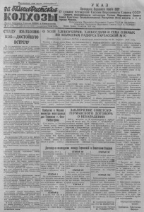Пролетарии веек стран, соединяйтесь за Ш ш е& ш псккг КОЛХОЗЫ Г а з е т а С е в е р н о ю Р а й к о м а В К П ( б ) и Р а й и с п о л к о м а J6 5G I 2 9 91 127 А В Г У С Т А I W 9 г.,воскресен/>е\ Ц е А а 8 к о п . У К А З Президиума Верховного Совета СССР О созыве четвертой Сессии Верховного Совета С С С Р С о зв а ть в н е о ч е р е д н у ю ч е т в е р т у ю Сессию В е р х о в н о г о С о в е т а С ою за С о в е т с к и х С о циа ли сти ч ески х Р е с п у б л и к 28-го а в г у с т а с г. в го ро д е Москве. П р е д с е д а т е л ь П р е з и д и у м а В е р х о в н о г о С о в е т а С С С Р М . К А Л И Н И Н . С е к р е т а р ь П р е з и д и у м а В е р х о в н о г о С о в е т а С С С Р А . Г О Р К И Н . Москва, Кремль, 2 4 а в г у с т а 1 9 3 9 года. СК ‘Е О ЗВ Д— У ДО К С О Т Л О Х Й О Н З У Н Ю И ВСТРЕЧУ По по становлению партии и правительства о се н ью т е к ущ е г о года будет созван с'езд колхозников,который обсудит вопрос о п о пра вк ах к у с т а в у с ельскохозяйствен ной артели. Д е й с т в ую щ и й сейчас примерный устав сельскохозяйственной артели принят в т о рым Всесоюзным с'ездом колхозников уд арнико в и ут вержден Советом Народных Комиссаров С о ю з а С С Р и Центральным Комитетом В К П ( б ) 17 февраля 1935 года. Прошло четыре с лишним года работы к о л х о з о в на основе примерного у с т а в а — »того незыблемого сталинского закона колхозной жизни. За это время достигнуты новые громадные ус пехи в колхозном строительстве. Колхозный строй в деревне окончательно укрепился. Миллионы трудящихся ко л х о з ной деревни на собственном опыте убед и лись и преимуществах артельного, общественного х озяйства над единоличным. С каждым годом все больше н шире ко л хо з ники п о ж и н а ю т плоды счастливой, з а ж и точной жизни, к которой привел их колхозный строй. Партия и правительство неустанно з аб о тятся о том, чтобы возрастали колхозные доходы, чтобы росло и крепло обществен ное х оз яй с т во к о л х о з о в - и с т о ч н и к бл а го получия колхозников. Примером сталинской заботы о процветании к о л хо зо в служат -по следние поста копления партии и правительства. Постановление Ц К А КП (б и С Н К С С С Р „О мерах о храны о бщественных земель иолхозов от разбазаривания* направлено к тому, чтобы навести большевистский порядок п колхозах, ликвидировать г р у б е й шие нарушения второго пу нк та устава сельхозар тели о размерах приусадебных у ча ст ко в колхозников. Этим постановлением партия и правительство дали честным, добросовестно работающим колхозникам (а таких большинство!) оружие для того, чтобы о б у з д а т ь лодырей, рвачей, тех людей, которые под влиянием мелкособственнических б у р ж у а з н ы х тенденций, заносимых в ко лхозы остатками кулачества, стааят свое личное, подсобное хозяйство выше интересов общественного, артельного х о зяйства. Постановление С Н К С С С Р и Ц К В К П ( б ) „О мероприятиях по развитию о б щ е с т в е н ного живо тно во дства в к о л х о з а х “ дает возможность всем колхозам в самое бли жайшее время еще сильнее д ви н у ть вперед общественное колхозное ж и в о т но в о д ство. Дни большего политического и производ ственно го под'ема переживает сейчас колхозная деревня. К о лхозники и колхозницы, рабочие М ТС и совхозов , специалисты сельского хо зяйств а с большим воодушевлением го то вились к Всесоюзной с ел ь с ко х озяй с твен ной выставке. Они горячо при ве тствую т лучших передовиков, стахановцев— у ч а с т ников грандиозного смотра побед социа