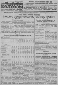 З А Б О Л Ь Ш Е В И С Т С К И Е К О Л Х О З Ы № 6 0 (3 034 ЗАКОН ОСЕЛЬСКОХОЗЯЙСТВЕННОМ налоге ^ О к о н ч а ние- Н а ч а л о — с м о т р и н а 1 с т р а н и ц е ) . кол х о зни к о в , если их х о зя й ст в а и лесу и на селе , не с ч и т а я се нокоса , который им выделен в лесу, полнос тью отвечают у с л о ви я и, у к а за н н ы м в с т а т ь е 11 з а к о н а , а и м еющ ая ся у н и х лошадь для с л уж е б ны х раз ездо в но о х р а не леса не исп ользуется для п о л у ч е н ия заработка на ст ороне. С т а т ь я 15. Х о з я й с т в а , к оторые не отвечают у с л о в и я м , у к а занным в с т а т ь я х П — 14 ' н а стоящего закона, п ривле каю тс я к у плате сел ьс ко хо зяй ств ен но ю налога наравне с единоличными кр е с т ь я н с к и м и х о з н й с т з а м и . Б . ОБЛОЖЕНИЕ ЕДИНОЛИЧНЫХ КРЕСТЬЯНСКИХ ХОЗЯЙСТВ С т а т ь я 16. Облагаемый д о ход единолич ны х к р е с т ь я н с к и х х о з я й с т в определяется от сельс к о г о хозяйст ва ипеземледельч е г к и х заработков в порядке , установленном с т а т ь я м и 3,5,(> и 7 н а с т о я щ е ю закона. В облагаемый доход е д и н о л ич н ы х хо зя й ст в , к|к1че того, полн о ст ью в к л ю ч а й с я доход от продажи сел ьс ко хозяй ств ен ны х продуктов на рынке . С т а т ь я 17. В единоличных К(>1?сгьниск|1х х о з я й с т в а х , которые к момрнту проведения у ч е т а источников дохода продали име ющ ий с я у н и х с к о т о б л а ю - емого возраста или использовал и доход включается с у м м а в р а з мере у с г а п о в л е н ны х норм доходности . ------- j • ■ V I I V 4 0 U V U U M I I ------ 4 -----------* для л и ч н ы х нуж д, в обла гаемый [ та бл иц е ставок ! Статья 18. С к о т , приобретенный единоличным к р е с т ь я н с к и м хозяйством после со ставления спи сков п л а т е л ьщ и ко в до 1 а в г у с т а те кущ е го года, у ч п т ы ваетен в хозяйстве дополнительно, и первона чально исч исле нная с ум м а сельс кохозяйственно го н а ло га соответственно у в е л и ч и в а е т ся . Ст а т ья 19. И с ч и с л е н и е сельск о х о з яй с тве нн ою пало га с единоличною к р е с т ь я н с к о го хоз яй ст ва производится по следующей Размер облагаемого дохода хозяйства Размер налога на хозяйство До 1 . 0 0 0 рублей 1 0 0 0 до 2 0 0 0 рублей 2 . 0 0 0 до 3 0 0 0 рублей 3 . 0 0 0 до 4 . 0 0 0 рублей 4 . 0 0 0 до 5 . 0 0 0 рублей 5 : 0 0 0 дв 6 . 0 0 0 рублен С вы ш е 6 . 0 0 0 рублей П О рублей. П О рублей плюс 16 копеек с к а ж дого рубля дохода св ыш е Г.ООО рублей. 2 7 0 рублей плюс 2 0 к опее к с к аж дою р у б л я дохода свыше 2 . 0 0 0 рублей. 4 7 0 рублей плюс 25 копеек с каждого рубля дохода свыше З.ООО рублей. 7 2 0 рублей плюс 31 ко пейка с к аждою р у б л я дохода свыше 4 . 0 0 0 рублей. 1 . 0 3 0 рублей плюс 2 8 копеек с каждого рубля дохода свыше 5 . 0 0 0 рублей. 1 . 4 1 0 рублей плюс 45 копеек с каждого рубли дохода свыше 6 . 0 0 0 рублей. С т а т ь я 20. Единоличные к р е с т ь я н с к и е х озяй ст ва , в с т у п и в т и с в колхозы до первого срока у п л а т ы сельскохозяйственно го н а л о га , облагаются по ставк ам колхозников. ' хозы после первого ср о ка у пл аты сельско хозяйственно го н а л о г а , пересчет палога по с т а й к а м колхозников производится л иш ь по тем срокам, которые еще не н а ст у п и л и ко времени в с т у п л е н и я Х озяйс твам , в с ту пи вш им в кол-1 в колхоз. Глава V Сроки уплаты сельскохозяйственного налога Статья 21. Содьско хозяйст- венный нало г у плачивается р ав ными долями в 3 срока : к 1 е к г и б р я , к 1 ноября и к 1 дек аб р я . Глава V I Льготы по сельскохозяй ственному налогу Статья 22. Для хозяйств щ н х участий л ичны м трудом в ко лхозников и единоличников, в хозяйстве, со с т ав кото