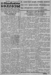 П р о л е т а р и и в с е х с т р а н, с о е д и н я й т е с ь! 2аШ иш $ияпсШ К О Л Х О ЗЫ Г а з е т а С е верного Райкома В К П ( б ) и Райисполкома ? 6 7 3 ( 3 1 6 ) | С Н О Я Б Р И 1939 г . , понедельник . | Цена 8 коп. З а новую победу сталинского блока коммунистов и беспартийных 2 2 о к т я б р я в «Правде» о п у б л и к о в а н а передовая с т а т ь я под з а г о л о в к о в ! «За повую победу С т а л и н с к о г о б л о к а ком м у н и с т о в и б е с п а р т и й н ы V !» п о с в ящ ен н а я выборам в краевы е , обдастные,окруас- ны е , ра й о н ны е , городск ие, с е л ь с к и е и поселковые советы д е п у т а т о в т р у д я щ и х с я Росс ийс кой федера ция. ♦ В ы б о р ы ,— п и ш е т « П р а в д а » ,— к а к того тре бует избирательный закон буду т произведены в т е ч е н и е одного д н я . День э т о т — 2 4 декабря 1 9 3 9 года. 2 4 о к т я б р я н а ч н е т с я нзбяра т е л ь н а я к а м п а н и я в Р С Ф С Р . П р и б л и ж а е т с я т а к ж е начало из бирател ьпон к а м п а н и я во всех 1,а(д р у г и х союзных р е с п у б л и к а х . Вся с т р а н а в с т у п а е т в з а м е ч а т е л ь ные предвыборные дни! Выборы д е п у т а т о в в местные советы в С С С Р б у д у т и ме ть ко ле ссальпое зн а ч е н и е . Т р у д я щ и е с я пашей родины изберу т местные о р г а н ы в л а с т и н а основе всеобще го , равного и п рям ого избирательного н р а в а п р и та й н о м г олос о в а н и и » . «Н а X V I I I съезде В К П ( б ) | — г о в о р я т ся далее в с т а т ь е , — т о в а р и щ С т а л и н у к а з ы в а л , к а к н а одну ил задач п а р т и и в области в н у т р е н не й п о л и т и к и , — неу клопно прово дить в ж и з н ь н а ш у ооциалв- с т и ч е с к у ю К о н с т и т у ц и ю , о с ущ е с т в л я т ь до к онца демократи зацию п о ли т и ч е с ко й ж и знп с т р а н ы , у к р е п л я т ь мораль но полит ич ес ко е единст во со ветского общества. П а р т и и у с п е ш н о р е ш а е т э т у задач у . Выборы в м естные советы на основе С т а л и н с к о й К о н с т и т у ц и и о с у щ е с т в я т до к о н ц а демократ и з а ц и ю п о ли т и ч е с ко й жи зни с т р а н ы п еще более у к р е п я т с л о ж и в ш е е с я в нашей с т р а н е м ораль во п о л и т и ч е с ко е единство нар ода. Ц е н т р а л ь ны й к о м и т е т В К П ( б ) с ч и т а е т , что в а ж н е й ш и м и з а д а ч а ми в пр ед с то ящ ей избирательной к а м п а н и и я в л я ю т с я : дальнейшее у кр е п л е н и е блока к о м м у н и с т о в и б е с п а р т и й н ы х , избрание дос тойн ы х , п р е д а н н ы х делу п а р т и и Леи и па — С т а л и н а д еп у та т о в , у л у ч ш е п и е работы м е с т н ы х о р г а нов г осударст венной в л а с т и , моби л и з а ц и я м а с с на разрешение х о з я й с т в е н н о — п о л и т и ч е с к и х з а дач , с т о я щ и х иеред районом, г о родом, о блас тью , к р а е м , республ и к о й » . У к а з ы в а я далее на то, что э т и м в ы со ки м п о л и т и ч е с ки м за дачам должен со отв етс тво вать у р о вень всей о р г а н и за ц и о н н о й н а г и та ц и о н н о й п р о п а г а н д и с т с к о й работ ы , «Прав да » подче ркива ет, что в п р ед с тоящ ую избирательную к а м п а н и ю зна ч е ни е этой работы с т а н о в и т с я особенно в а ж н ы м . «Правда» п и ш е т ! «П редсто ит избрание более м илли он а 3 0 0 . 0 0 0 д еп у т а т о в . И изби р а те л ьны х к о м и с с и я х буду т работа ть более 7 м иллионов челове к. Надо о б е с пе ч и ть , чтобы на о т в е т с т в ен н ую го суд а р ст в ен н ую работу в изби рательны х к о м и с с и я х были вы д в и ну ты достойные лю ди, п а р т и й н ы е и н е п а р т и й н ы е б о л ь ш е в и к и . Надо р а з в е р н у т ь г и г а н т с к у ю а г и т а ц и о н н у ю работу среди и з бирателей , чтобы к аж дый