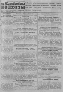2 З А Б О Л Ь Ш Е В И С Т С К И Е К О Л Х О З Ы 76 (319) I П р ед вы б ор ны е собрания т р у д я щ и х с я нашею района п р о х о д ят с огромным политическим п о д ем о м и активностью Остяцкий и з б и р а т е л ь н ы й о к р у г № 12. Члены к о л х о з а . К р а с н а я з в е з д а * выдвигают кандидатом в д е п у ! а т ы Северного районного со в ет а д е п у т ат о в трудящихся Николая Ивановича Ш ахова Ч е б а к о в с к и й и з б и р а т с у ь и и й о к р у г № 17 Члены к о л х о з а .Веселый т р у д * кандидатом в депутаты районного совета в ы д в и г аю т ГРИГОРИЯ АНДРЕЕВИЧА НИКОЛАЕВА На собрании артели «К р а с н а я | года, члена В К П ( б ) с 1 9 2 0 года, звезда» ,посвященном выдвижению работающего заведующим райФО. кандидатов в деп у та ты районного ” ------------------ 9 2 чело- совета, при сутствовало века . Председатель колхоза « К р а с на я 7 вы с т уп аю щ и х товарищей поддержали предложение той. 11а- н уш кн н а и собрание единогласно постановило выдвинуть т . Ш а х о звезда» т . М а н у ш к и в внес предло- j ва Н. И. кандидатом в депута ты жение ь и д в н н у т ь кан дидат ом к i райониого совета и просить его депу таты райсовета Н и ко л а я Ива- i баллотироваться по О с тя ц ком у из- новича Ш а хова , рождения 1 8 8 7 ' бирательному о к р у г у .М 12. _У ргуль ский и з б и р а т е л ь н ы й о к р у г № 1 3 Колхозники к о л х о з а „Единый п у т ь “ кандидатом в депутаты районного со вета выдвигают Андрея Антоновича Коваленко 5 6 колхозников п р н с у т с т в о в а ло на собрании. Все они проголосовали за то, чтобы вы д в и ну ть кан дидат ом в д е п у т а т ы районпо- го совета Андре я Ан топ ов ич а Коваленко , рождения 1 8 9 1 года, кандидат а В К П ( б ) с 1 9 3 8 года, работающего председателем колхоза им. Буденного. Избиратели У р гу д ь с к о г о избирательного о к р у га просят со гл а си я т . Коваленко А . А. баллоти рова ться но о к р у гу .М 1 3 . Останинский и з б и р а т е л ь н ы й о к р у г № 14. Колхозники к о л х о з а „7-Д с ъ е з д со вето в* , рабочие и служащие с. Останннка выдвигают кандидатом в депутаты Северного районного с о в е т а депутатов трудящихся 15 понбрп состоялось собрание членов колхоза «Веселый т р у д » . На собрании присутствовало 3 5 человек. В ы с т уп и л о 10 человек. Первым вы ст упил учитель то в . Некрасов. 0 а говорит! — Мы знаем то варища Н и к о лаева, к а к выходца из бедной крес тьянской семьи, к а к одного из л у чш и х комбайнеров нашего района. За сезон 1 9 3 9 года он убрал в колхозе им. Те льмана 3 5 2 гектара . Я предлагаю выдв и н у т ь кандидатом в д е п у т а т ы районною совета Г р и г о р и я А н дреевича Николаева и и рос н и избирательном ' «кругу нашему X 1 7 . ' Колхо зники т т . Лебедев, Лари, опои н д р у г и е в своих в ы ст уп л е н ия х поддержали предложение той. Некрасова . В с е 3 5 человек проголосовали за выдвижен ие тов арищ а Н иколаева. его со гласия баллотирова ться по Ч у в а ш я н с к и й и з б и р а т е л ь н ы й о к р у г № 18. Члены к о л х о за „Нацмен пролетарий*, рабочие и служащие с е л а Чуваши вы д ви гаю т кандидатом в депутаты районного с о в е т а Начальника С е в е р н о г о Р О Н К В Д Анатолия Ивановича Зиновьева , ) П> 16 ноября на предвыборном собрании колхоза «Нацмен пролетарий» п рису тст вова ло 9 5 ч е ловек. Директор Чувашипской НС1Н тов. М и хай ло в 11. М. внес предложение вы д в и н у т ь кандидат ом в депу таты Северного районного совета деп утатов т р у д я щ и х с л н а ча льника Северного РО II КПД Ан а то ли я Иваповича Зиновьева, рождения 1 9 0 4 года, члена В К