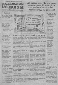 П р о л ет а р и и всех с т р а н, соединяйтесь1 к Ш т М ж ш Ш Г а з е т а Северного Райкома ВКП(к>/ и Райисполкома J 6 8 1 ( 3 2 1 ) | 5 Д Е К А Б Р Я 1 939 г . , »шорник. | Ц е н а 8 коп ■ II I I I I ц u n í ш в п м _ ______ I _____________ _ Д а здравствует Конституция нашей страны, Конституция победившего социализма и подлинного демократизма! С С т а л ь с к и й ТВОРЦУ КОНСТИТУЦИИ В е л и к и й вождь, ты дал нам щ и т , Он звезд алмазам п расш ит , Оп юность от седая х р а н и т В с ч а с т л и в ы х дней повторе. В е л и к и й вождь, ты дал нам клю ч В то т к р а й , где ярче солнца л у ч , Где нет н асил ья черных т у ч , Где мертво слово »горе». Ты вам м о гу ч и й пламень дал, З а ко н великий п а и в са л , I! о н — кате драгоценный лал В с т р а н ы адатом уборе. С ним к о л о сщ р я рожь в по ля х , С ним зреют яблоки в са д а х , И люди, честные в делах, С ним побеждают в споре. З а к о н — величье п аш н х дней, С ним к р а ш е ж изнь и песнь новей, С ним с л а в а родины моей З а мир с т о и т в дозоре. Н а всей земле всей бедноты Т ы с яч еле т н и е мечты Н а деле воплощаешь ты В побед могучем хоре. ПРАВДИВЫЕ СЛОВА В с е сады мои садочки Но весне ц в е ту т к р угом , Ои, в колхозе мы сч астливо И з аж и т о ч н о ж и в е м ! В с е ц в е т у т сады-садочкп, Л ь е т с я песня над селом. С т а л и н , батько н аш родимый М ы тебе спасибо шлем! Человеческое счастье Это ты. н ам , С т а л и н дал, Т ы его в закопе нашем Б у к в а в бу к в у записал ! В с е равиы в тр уде свободном, В с е м — великие права Это С т а л и н а простые II правдивы е слова. II с тобой, наш ясный сокол, Мы с дороги ие св е р п е ч . Мы в сердцах п на зна м е на х К о н с т и т у ц и ю несем! П у с т ь ж е яр ч е св е т и т солнце , П у с т ь ц в е т у т сады, поля, Что б была еше нрекраси ей Н а ш а с л а в н а я зем ля ! С Т А Т Ь Я 118. Г р аж д а н е С СС Р им ею т п р а в о н а т р у д , то есть право н а получени е гар а нт и р о ва н н о й работы с о п л а т о й их т р у д а в соответствии с его количеством и качеством. П р а в о на т р у д обеспечивает ся социалисты ческой о р г а н и з а ц и е й народного х о з я й с т в а , неуклонным р о с . т о м прои зводит ельных с и л советского общества, у с т р а нением возможности х о з я й- ственных к р и зи с о в и л и к ви д а ц и е й безработицы . СУПЬ* II? ^ф/ротданеСССР. ^*¡1 и м е ю т п р а в е | N>s £C отдш i № f Вшшемый п а р щ - V " Л еииид - С т я / ! ^ ССЕЕТСКИЙ НДРОй ИДЕТ СПЕРц КНОВЫМПОБЕДАМКОММУН«^/ rSTWttO UMCtCfл t \ z p * c ! • ' - V b J - T ' R V - ' V M S I i ГЧ9МЦ1 A ЗА ТОБОЙ и д у т МИЛЛИОНЫ ЛЮДЕЙ П е р е в о д с л а к с к о г о . Гора над долиной Ст о и т вы со ко, А небо г о р и т Над ю р о й далеко, Но, С т а л и н , ты выш е В ы с о к и х небес, II выше тебя Только мудрость т в о я ! Созвездий и месяца Солнце светлей, Н о , С т а л и н , твой ра зум II солнца светлей. Л у ч и с т о е солнце С в е т и т л и ш ь днем, А разум твой св етлый — II ночью и дием. ВСЕМИРНО-ИСТОРИЧЕСКИЙ ДОКУМ ЕНТ Т р и года тому назад, 2 5 ноября 1 9 3 6 года, на Чрезвычайном VI II Всесоюзном с'езде советов великий вождь т р у д и щ и х с я т о варищ С т а л и я сделал свой ист ори чес кий доклад <0 проекте К о н с т и т у ц и и Союза С С Р » . Э т о т д о к л а д е и склю читель ной силой определил с у щ н о с т ь созданного т р у д я щимися под ру ководством п а р т и и Л е н и п а — Сталина со циалистиче ского обще ства п его г о с у дарственного у с т р о й с т в а . Сокровищница м а р к с и з ма-ленипизма обогатила сь новым ценнейш им документом о со циализме ,' о государстве . Доклад то варища С т а л и н а провозгласил победу в нашей стране перво