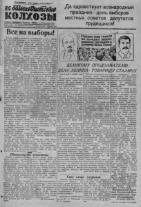 Пролетарии всех стран, соединяйтесь/ заШбше&ижкЬе колхозы Г а з е т а С е в е р н о г о Р а й к о м а В К П | б ; ■ Р а й и с п о л к о м а г . , воскресенье. } Ц е н а 8 к о п Д а здравствует всенародный п р а з д н и к - день выборов местных советов депутатов трудящихся! Все на выборы! Сегодня выборы в местные Со »егы д е п у т а т о в т р у д я щ и х с я . Со- г Д # де сят ки м пллю иои советск и й гражд. ч по й д у т к избирател ьным у р ь 1|М, чтобы послать достойных лго.'лй в сельские, поселковые, р а б о ч и е , городские, о к р у ж н ы е , о б л а с п 5уе, краевые Советы. . Любой избиратель ощо по нимае т, к а к у ю о г р о м н а силу представляют собой местные Со веты депутатов т р у д я щ и х с я — пнзовые органы вл ас ти , где к; ж- дый день п ка ж ды й час решаются к о н к р с т в ы е , повседневные вопросы ж и з н и к р а я , области, района , города или села. ^ ¿ ^ а т а страна дважды проводила | выборы по повой избирательной1 системе, установленной великой Сталинской К о н с т и т у ц и е й . Миллионы людей в процессе нзбира тельной к а м п а н и и приобщились к активной общественной ж и з н и . Но избирательная ка мпания в местные Советы во много раз шире по своему разм хху . грандп оянес по своим масштабам, чем две предыдущие избирательные к а м п а н и и . Ведь во все местные Советы предстоит избрать одив миллион т р и г л а т ы с я ч д е п у та тов . Нынешние выборы пр изовут к руководящей работе в Сонетах новые большие пласты народа,они п р и в л е к у т к государсгиенному управлению сотни ты с я ч рабочих, к о л хо зни к ов , интеллигентов — верных си п о в своей родины. В Советы мы изберем достойных доверия парода. В Советы мы изберем людей, преданных п а р т и и Л е н и н а — Сталина, людей, для ко торых превыше всего— и н тересы народа, интересы социал и с тичес ко го государства. В с т р а н а х к а п и т а л а , где бурж у а з и я издавна к и ч и т с я своей с таринной «демократией», сейч а с идет кровавая война за новый передел мира . Давно забыт ы слова о том, что демократии обеспечит народам «мир и благоп о л у ч и е » ! в б у р ж у а з н ы х с транах нет ин мира , ни благополучия . Ж а л ки е о гр ы з к и демокра тии , и те ликвидированы теперь в странах к а п и т а л и з м а . Во Ф р а н ц и и , А н гл и н и д р у г и х с транах б у р ж у а з ной «демократии» идет р а зн у з данная травля орга н иза ци й рабочего класса,урезываются в без того к у ц ы е «права» тр у д ящ и х с я , с н иж ае т с я заработная п л а т а . увеличивается рабочий день Только одна страна на земвом шаре — ваша великая родина— ж и в е т полнокровной, мирной ж и з н ью . В нашей стране нет п нщ иты и эксплоатации человека. В нашей стране народ пользуется всеми дарами природы, всеми благами ж и з н и . В пашей стра не провозглашены и осушсствле- пы п р и н ц и п ы развернутой советской демократии, той демократии о которой не могу т и мечтать в ка п и т а л и с ти ч е с к и х с тра н ах . Сегодняшние выборы снова п о к а ж у т всему миру, что только в СССР— стране социалистического демократизма— существует действительно свободное нолеиз*явление народа. Этим мы обязаны большевистской п а ртии , еоветс- кой вл асти, любимому вождю народов товарищу Сталину. «Только у нас, в Советской стра не, существуе т правительство, которое с т о и т горой за рабочих п к р е с ть я н -к ол х о зн и ко п , за всех т р у д я щ и х с я города и деревни против всех богатеев и а ш гл о а т а - то рои »(Стал ия . ) Мудрая стал инская пол и т