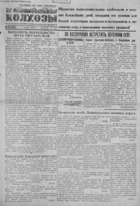 областная научная библиотека. À s . - l i f Прол ет а р и и всех ст р а н, соединяйтесь! Обеспечим вып олнение п л а н а х л е б о с д а ч и в т е ч е ние б л и ж а й ш и х дн ей , с о з д а д и м все условия д л я боевой п од г о т овк и к о л х о з о в и к о л х о з н и к о в к веГ азе та С е в е р н о г о РК ВКП(б) и Р ай сове та д еп у т а т о в трудящихся - №14(344) I 2 марта и)4о г., суббота сенкему севу, к з а в о е в а н и ю вы соких у р о ж а е в ! ВЫПОЛНИТЬ о б я з а т е л ь с т в а" ПЕРЕД ГОСУДАРСТВОМ Первая обязанность каждого колхоза— выполнить свои обязательства перед государс тво« . План хлебопоставок по нашеиу району выполнен только на 0 4 , 2 процента . Государству не доедали 2 5 тысяч центнеров хлеба. Н е смотря на имеющиеся возможности многие колхозы под разными предлогами продолжают задержи вать сдачу хлеба государству и т а к и м образом ос таются должник а м и государств у . В з ад е рж к е выполнения плана хлебосдачи в ин ова т в ряйунол- номочеиный Н ар к о м з а г а , его а п п а р а т , ди р е кц и я М Т С . Эти товарищи устран ились от важнейшей работы, тем самым шли на поводу анти государствен ных иас- т р о ен и й . В последнее вредя совершенно прекра тилось выполнена « хлебосдачи государству н е к о торыми колхозами. Колхоз « Я з ю с а б а н » , Больше • Кулико вского сельсовета, не выполнил государству - Ш центнеров нерпа, тогда к а к а го т колхоз создал о т дельные фонды в распределил но Трудоднем ко I хозяйкам по 2 к и диграмма Колхоз « Г и г а н т » рас п р о д е л и хлеб по трудодням кол- . АОЛ!! . " . . . . . (рассчитался. К тому ж е в этом колхозе до с е ю нремевн не об молочен хлеб с у р о ж а я 1 9 3 8 год а . Колхоз им. К а г а н о в и ч а т а к ж е Не рассчитался с государством, цынолнив свое обязательство на 2 9 , 2 проц е н та . С п р а ш и в а е т с я — что мешало этим колхозам по примеру большинства колхозов райопа выполнить обязательство перед государством? Прежде в с е го— не большевистское отношение к работе. Нужн о прямо с к а з а т ь , что руководители вышеуказанных колхозов стали на явпо а н г л колхозный, а н т и г о сударственный ч у т ь — невылолне n i e государс твенных заданий. Грубое н а р у ш е н и е в выполнении государс твенных обязательств имеет место п в ряде других колхозов. не занимался. Работники Рай* потребсоюза отсиживаю тся в к а б и н е г а х и с ч и т а ю т , что хлеба в колхозах мало и они его не предают. 1огда к а к многие колхозы в октябре 1 9 о 9 года рассчитались с обязательными поста вк ми , распределили бл а т ы а доходы ио трудодням колхозникам, многие колхозники получили НО 3 0 И больше центнеров хлеба, которые при большевистском разъяснении с успехом они продавали бы изл и ш к и государс тву, одвако этим н а к то нс занимается Отдельные колхозы заключили договора с сельпо на продажу хлеба через кооперацию, но до сего времеоа ие сдало на одною ки л о гр амм а . Например, колхоз « У д а р н и к » продал кооперации 5 0 ц е н т р о в зерна , но до с и х пор не сдал ни одиою килограмма . 9 г и примеры не являются един и чны м и , их можно привести еще несколько. Н у ж н о решительно п окончить с самотеком и расхлябанностью, и ре ако ударить по ру кам тем , кто проявляет антигосударств ен - ные, рваческие тенденции и вы- " . ' ¿ ; У л ; - : г 2ты» и в а , к т о растранжиривае т и раз вороныиае т хлеб. Партий ные, советские, комсомольские ор ганиза ции должны пом нить, что они несут полную ответственность за выполнение зернопоставок и хле