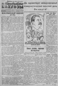 п р о л е т а р и и в с ех с т р а н, с о е д и н я йт е сь ! з д р а в с т в у е т международный К в д Л ' У Г A к о м м у н и с т и ч е с к и й ж е н с к и й д е н ь 8 - е м а р т а ! ’Г а з е т а С е в е р н в г * Р К В К П (б ,) и Р а й с о в е т а д е п у т а т о в т р у д я щ и х с я №15(345) ! 8 марта 1940 г., пятница | , 05_“зл‘ М Е Ж Д У Н А Р О Д Н Ы Й Ж Е Н С К И Й Д Е Н Ь В н ы н еш н е й гаду « щ и п а е т с я 2 0 л е г с т е х пор, в а г в К о п е н г а г е н е — столице Да ял а — по предл о ж е н и ю Клары Ц е т к п и I I Международная ж е н с к а я коиферен <и н с о циал ис то к установила Ежегодное праздвованне Между народного д ня ж е н щ и н -р а б о тн и ц . Тол ько в нашей стране побед ившего социализма деьь 8 марта Лгал подлинным праздник ом т р у щ и х с я ж е н щ и н . Ибо только в ветском союзе ж е н щ и н а ж и в е т л о л н оц еп н о и счастливо, п ользу юсь р авными пр авами с м у ж ч и ной во всех областях х о зя йс тв ен ной, государственной , ку л ь т у р н о й я обществ енно-политической ж и з н и . В с т р а н а х к а п и т а л и зм а т р у дящ аяся ж е н щ и н а п о п р е к н е м у з а к аб ал ен а , у г н е т е п а , бесправна К й з а к р ы т доступ к го судар стве нной и общественной ж и з н и , к н а у к е , к бальшин<*тву профессий. •Женщине п л а т и т там за любую .работу меньше, чем м у ж ч и н е . 'П ос тоянной мрачной угрозой с т о я т веред ней безработица, нищета. Советск ие же ищи и м — пла мея- ■ые п а т р и о т к и социалистической родины. Нет т а к о г о у ч а с т к а соц и а л и с т и ч е с к о го строител ьства , где ж е н щ и в ы не проявили бы себя к а к героини труд а . По всей нашей стране гр е м я т ■ мена железнодорожницы З и н а и ды Т р о и ц к о й , м е т а л л у р г Марии •Иппол итовой, угольщиц ы Варвары З убковой , и нж е н е р а -н е ф г я н и - * а С у гр ы Ганбокой и м н о г и х , м н о г и х д р у г и х . По всей стране г р е м я т имена з н а т н ы х колхозниц М а р и и Демченко , Анны К а р т а в о й , Бает и Багировой и м н о ги х д р у г и х . Весной прошлого года знатные т р а к т о р и с т к и Ц. А н ге л и н а , И. К а в а р д а к и М. Мухортова обрат и л и с ь к молодым колхозницам с призывом овладеть тра кто ро м . Обращение это нашло необычаи « о г о р я ч и й о т к л и к во всех кол- ю з а х с т р а н ы . 41 т ы с я ч а деву ш е к у ж о получил а звания т р а к т о р и с т о в . Д е ся т ки т ы с я ч д р у г и х о б у ч а ю т с я и скоро с т а н у т водить т р а к т о р ы . Советская ж е н щ и н а занимает « очетное место во всех начи н а - ■ п я х народа, во всех проявлен и я х народной ини ци а ти вы На « троительстве Большого Ф ерган с к о г о к а п а л а участвовало много т ы с я ч ж е н щ и н . Па строительстве дорог, в благоустройстве го родов и сел, в д есятках д р у г и х « р е к р а с н ы х нач и н ан и й ж е н щ и н ы за н и м а ю т одно «з п е р вы х мест. В полноте своей счастливой ж и з н и советская ж е н щ и н а черпает силы для героической работы. Она радостно совмещает творческ и й т р у д во всех областях социал и с ти ч ес ко го с троител ьства со здоровым счастливым материнством. Заботе о ж е н щ п н е -м а т е р и , о ребенке уделается в пашей с т р а не огромное вн и м а ни е . Родильные дома, ясли , де тские сады н площадки мн ож а тся с каждым годом во всех у г о л к а х Советского Союза. Здоровыми, веселыми я бодрыми р а с т у т новые по коления советс ких г р а ж д а н . Б Международный ж е н с к и й день счастливые г р а ж д а н к и Советско й страны шлют свой пламенный пр и ве т труд ящ им ся ж е н щ и нам к ш н т а л и с г и ч е с к и х с тра н и у г н е т е н н ы х наро