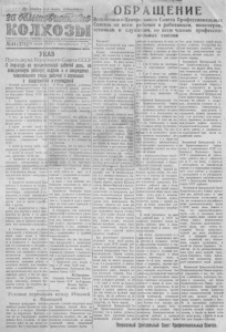 TIpt л ш а р ь и W(x стран, соединяйтесь.' Ш ШЩшФиШ Ы Газета Северного РКВКП(б^ и Райсовета депутатов тр удящ их ся . № 4 4 (3 7 4 ) |з о июня 1940 г. воскресеш е I Го5сйизд У К А З Президиума Верховного Совета С С С Р О переходе на восьмичасовой рабочий день, на семидневную рабочую неделю и о запрещении самовольного угода рабочий н служащих с пведпривтнй иучреждений Согласно представлении Всеро-1 б) Когда рабочий, работница юзпого Центрального Совета Про- или с л у ж а щ и й должен л р е к р а - фессиоаальних Союзов — Президиум Верхо вн ого Совета СССР пос т а н о в л я е т : 1. У в е л и ч и т ь продолж ительность рабочего дня рабочих и слу ж а щ и х во всех государственных, к о о п е р а т и в н ы х и общественных п р е д п р и я т и я х и у ч р е ж д е н и я х : С семи до восьми часов-— на п р е д п р и я т и я х с семичасовым р а бочим днем; С шести до семи часов— на работах с шестичасовым рабочем днем, за исключением профессий с вредными условиями т р у д а , по с п и с к а м , утверждаемым СНЕ СССР; С шести до восьми часов— для с л у ж а щ и х у ч р е ж д е н и й ; С шести до восьми часов для л и ц , д о с т и гш и х 1 6 - т и лет. 2 . Перевести во всех государе I пре д пр и я ти и и у ч реж д ении и р е - с т и е н н ы х , кооперативных и оГьд даются суду н но приговору ш е с т н е н п ы х п р е д п р и я т и я х и у а народного суд', карают«*я нснра- любым испит:; р еж д ен и я х работу шестидневки на семидневную неделю, с ч и т а я седьмой день недели — воскресенье — днем отдыха . 3 . З апретить самовольный уход р абочих и с л у ж а щ и х из государ с т в е н н ы х , кооперативных и об щ е с т в е н н ы х предприятий и у ч р еж д ен и й , а т а к ж е самовольный переход с одного п р е д пр и я ти я на д ру гое или из одного учрежден и я в дру гое . У х од с п р е д п р и я т и я и у ч р е ж д е н и я , или п ер ех о д е одного пред п р и я т и я па другое и из одного у ч р е ж д е н и я в другое может разр е ш и т ь только директор предпри я т и я пли н а ч а л ь н и к у чреждения. 4 . У с т а н о в и т ь , что директор п р е д п р и я т и я и н а ч а л ь н и к у ч р е ж де ни я имеет право и обязан д а ть разрешение на уход рабочего ц с л у ж а щ е го с пре дприятии или из у ч реждения в следующих с л у ч а я х : а ) когда рабочий, раО Б Р А Щ Е Н И Е Всесоюзного Центрального Совета Профессиональных Союзов ко всем рабочим и работницам, инженерам, техникам и служащим, ко всем членам профессиональных союзов гшть ропоту в связи с зачислением его н высшее или среднее специальное учебное заведение. Отпуска работницам и ж е н щ и н а ! . - служащим по беременности ч родам с о храняю т ся в соответс тви и с действующим законодательством. 5 . У с тан ов и ть , что рабочие и с л уж ащ и е , самовольно ушедшие из государствеи яых, кооператив -1 с ; аЛа чрева а неожиданное н и х и общественных.предприятий или учреждений пре даются суду и по приговору народного суда подвергаются тюремному за каю чепию сроком от 2 - х месяцев до 4 - х месяцев. У с т а н о в и ть , что за п ро г у л бет у в аж ительной п р и ч и н ы рабочие в сл уж ащ ие го суд ар с тв ен н ых , кооперативных и общественных вительно - трудовым работам по месту работы на срок до б месяцев с удержанием из зараиот ной платы до 2 а проц. И связи с этим о тм ен и ть обязательные увольнения за п р о г у л Оез у в а ж и т е л ь н ы х и р и ч н п . Предложить Народным судам все дела, указанные в настоящей с т а т ь е , рассматривать не более, чем в 5-д вевный срок и п риго воры по этим делам 
