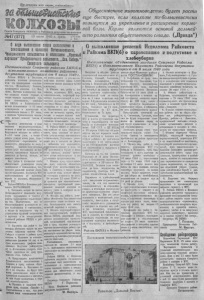 Пр<летарии всех стран, ссединяйтеп,! Общественное животноводство б у д ет расти ещ е быстрее, если колхозы по-большевистски шл* р р к»щ ж ; в о з ь м у т с я з а ук репление и р а сш и рен и е кормоШ М Ш Ш вой б а зы . К о р м а я в л я ю т с я основой дальнейГ а з е т а С с п е р ь о г о Р К В К П ( б т н Р а й с о в е т а д е п у т а т о в т р у д я щ и х с я ^ 3д. ш е ю р а з в и т и я общественного ст а д а . ( „П р а в д а ) I 5-й О ходе выполнения плана силосования и сенокошения в колохзха Поткашновскгоо, Чуваишнксого сеьлсоветво и колхзоами „Красный партизан" Прибелинонсго сельсовета, „Сов, Сибирь“ Северного сельсовета Постановление Северного райком а С К П ( б ) и исполнительного комитета райсовета депутатов т р у д ящ и х с я от 6 июля 1940 г. Р айком ВКП(Г>) и П а ш к о й им пере вы пол пен в установлен райсовета с ч и т а ю т уста но влен ным , что председатели сельсове- тов т . т . М алоле тки « , Хомепок, председатели колхозов т . т . К а л гано в , Мат веев выполпепие нла- пов закладки силоса сорвали, а т а к ж е сорвали выполнение графика сепокошепнн , указание Р К В К П ( б ) и Райисполком а о начале сен о кош е ни я с 2 2 нюня игнорировали и п р и сту п и ли к се нокошению то лько с 2 9 июня, а колхозы Ч у в а п п т с к о г о сельсовета начали сенокос только 4 н о л я . Трудовая д и сц и п л и н а в ряде колхозов неудовлетворительна, ночевка в поле не организована. Ко лхо зники вы х о д я т па работу в 9 — 10 часов у т р а , а т а кж е с работы у х о д я т очень рано. Социал ис ти ч е ско е еоревяование не развернуто , стенгазеты па в ы п у с к а ю т с я , массово-политическая работа среди колхозников не проводится, ежедневные задания не доводятся до бригад, звеньев, до каждого к о л х о з н и к а . З а в . райзо т. А н г о н е п к о слабо обеспечивает руководство ходом силосовапия п с е н о к ош с в и я , зоот е х н и к и реальной помощи колх озам не о к азы ваю т . Директора МТС с а м о у с т р а н и л и с ь от заготовки кормов в ко л х о зах , обслуживав м ы х МТС. Р а й ко м В К П ( б ) п Исполком райсовета П О С Т А Н О В И Л И : 1. П ос тавить вопрос на сессии Лотюкановского сельсовета д е п у та то в т р у д я щ и х с я о с п я т и в с работы председат еля сельпсполко- м а тов. М а лоле ткп на , к а к не обеспечивающего руководство х о дом силосования и сенокошения, а т а к ж е за н еп р и н я т и е мер по ный с р о к (вмес то плана 5 . 0 0 0 пентперов колхоз выполнит 9 . 0 0 0 центнеров). 5. Обязать зав. райзо т . А н то ненко , директоров М ТС , пред, сельисполкомов , секретарей пер- в и ч н ы х парторганизаций и пред, колхозов выполнить постановление бюро Обкома ВК И (б ) и облисполкома от 13 кювя 1 9 4 0 го да. Орг анизовать все силы к о л хозов на загото зк у кормов, обеспеч ит ь в каждом колхозе п р а вильную орг анизацию т р у д а , м а к симально псиользовать тнглопуго си лу и уборо чный инв ентарь. 6. Р а й к о м ВК П ( б ) и райисп олком требуют от пред, сельиспол- комов, пред колхозов пе допуск ать разрыв между сенокошением и стог о в а н и ем . У с т а н о в и т ь распорядок дни в колхозах па уборке и, добиваясь его выполнения, организо вать ночевку в т л е , пе- ст п р еш и тел ьн ую борьбу с лодыр я м и , р в а ч ам и , широко примен я т ь у ста в - сельхозартели к нар у ш и т е л я м трудднециплины. 7. Обязать пред, сельве, ¡обкомов, пред, колхозов обеспечить то чный у ч е т заготовленных кормов, и вк лючать в сводки только то наличие сена, которое обмерено в с к и р д а х и приня то по а к т у . Не позднее 1 2 июля 1 9 4 0